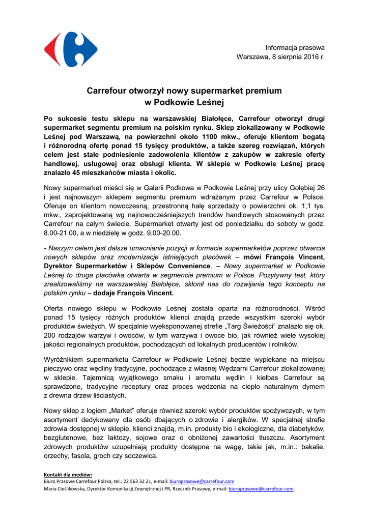 Informacja prasowa Warszawa, 8 sierpnia 2016 r. Carrefour otworzył nowy supermarket premium w Podkowie Leśnej Po sukcesie testu sklepu na warszawskiej Białołęce, Carrefour otworzył drugi supermarket segmentu premium na polskim rynku. Sklep zlokalizowany w Podkowie Leśnej pod Warszawą, na powierzchni około 1100 mkw., oferuje klientom bogatą i różnorodną ofertę ponad 15 tysięcy produktów, a także szereg rozwiązań, których celem jest stałe podniesienie zadowolenia klientów z zakupów w zakresie oferty handlowej, usługowej oraz obsługi klienta. W sklepie w Podkowie Leśnej pracę znalazło 45 mieszkańców miasta i okolic. Nowy supermarket mieści się w Galerii Podkowa w Podkowie Leśnej przy ulicy Gołębiej 26 i jest najnowszym sklepem segmentu premium wdrażanym przez Carrefour w Polsce. Oferuje on klientom nowoczesną, przestronną halę sprzedaży o powierzchni ok. 1,1 tys. mkw., zaprojektowaną wg najnowocześniejszych trendów handlowych stosowanych przez Carrefour na całym świecie. Supermarket otwarty jest od poniedziałku do soboty w godz. 8.00-21.00, a w niedzielę w godz. 9.00-20.00. - Naszym celem jest dalsze umacnianie pozycji w formacie supermarketów poprzez otwarcia nowych sklepów oraz modernizacje istniejących placówek – mówi François Vincent, Dyrektor Supermarketów i Sklepów Convenience. – Nowy supermarket w Podkowie Leśnej to druga placówka otwarta w segmencie premium w Polsce. Pozytywny test, który zrealizowaliśmy na warszawskiej Białołęce, skłonił nas do rozwijania tego konceptu na polskim rynku – dodaje François Vincent. Oferta nowego sklepu w Podkowie Leśnej została oparta na różnorodności. Wśród ponad 15 tysięcy różnych produktów klienci znajdą przede wszystkim szeroki wybór produktów świeżych. W specjalnie wyeksponowanej strefie „Targ Świeżości” znalazło się ok. 200 rodzajów warzyw i owoców, w tym warzywa i owoce bio, jak również wiele wysokiej jakości regionalnych produktów, pochodzących od lokalnych producentów i rolników. Wyróżnikiem supermarketu Carrefour w Podkowie Leśnej będzie wypiekane na miejscu pieczywo oraz wędliny tradycyjne, pochodzące z własnej Wędzarni Carrefour zlokalizowanej w sklepie. Tajemnicą wyjątkowego smaku i aromatu wędlin i kiełbas Carrefour są sprawdzone, tradycyjne receptury oraz proces wędzenia na ciepło naturalnym dymem z drewna drzew liściastych. Nowy sklep z logiem „Market” oferuje również szeroki wybór produktów spożywczych, w tym asortyment dedykowany dla osób dbających o zdrowie i alergików. W specjalnej strefie zdrowia dostępnej w sklepie, klienci znajdą, m.in. produkty bio i ekologiczne, dla diabetyków, bezglutenowe, bez laktozy, sojowe oraz o obniżonej zawartości tłuszczu. Asortyment zdrowych produktów uzupełniają produkty dostępne na wagę, takie jak, m.in.: bakalie, orzechy, fasola, groch czy soczewica. Kontakt dla mediów: Biuro Prasowe Carrefour Polska, tel.: 22 563 32 21, e-mail: [email protected] Maria Cieślikowska, Dyrektor Komunikacji Zewnętrznej i PR, Rzecznik Prasowy, e-mail: [email protected] W supermarkecie nie zabraknie również produktów naturalnych z linii „Jakość z Natury Carrefour”, które są produkowane z poszanowaniem środowiska naturalnego, zgodnie z zasadami zrównoważonego rolnictwa, a ich jakość kontrolowana jest przez Carrefour „od pola do talerza”. Klienci będą mogli kupić również liczne produkty z asortymentu Kuchni Świata, w tym oryginalne francuskie produkty regionalne pod marką Reflets de France oraz włoskie specjały marki Terre d’Italia – dostępne wyłącznie na półkach sklepów Carrefour w Polsce. Co więcej, klienci nowego sklepu w Podkowie Leśnej mają możliwość zakupu świeżo wyciskanego na miejscu soku z pomarańczy oraz naturalnie mętnego soku z jabłek. Ofertę supermarketu uzupełnia szeroki wybór chemii i kosmetyków, a także produktów sezonowych oraz tekstyliów. W nowym supermarkecie, mieszkańcy Podkowy Leśnej będą mogli przystąpić do programów oszczędnościowych. W ramach „Karty Dużej Rodziny”, każda rodzina z miasta i okolic, która posiada co najmniej trójkę dzieci, będzie mogła skorzystać z rabatu aż do 10% na całe swoje zakupy. Na podobny rabat mogą liczyć również osoby powyżej 60. roku życia, w ramach cieszącej się dużą popularnością „Karty Seniora”. W każdy wtorek mogą otrzymać 10% rabatu na swoje zakupy. Ponadto sklep oferuje akcje promocyjną „Zyskuj na okrągło”, która umożliwia zakup określonych artykułów w stałej, okrągłej cenie. Promocja obejmuje szereg produktów codziennej potrzeby z różnych kategorii. Nowy sklep Carrefour w Podkowie Leśnej jest pierwszym supermarketem działającym na terenie miasta. Znalazło w nim pracę 45 osób, pochodzących głównie z Podkowy Leśnej i okolic. Codziennie będą oni dbać o najwyższą jakość obsługi klienta. O Carrefour Carrefour Polska to multiformatowa sieć handlowa, pod szyldem której działa w Polsce ponad 800 sklepów w 5 formatach: hipermarketów, supermarketów, sklepów osiedlowych i specjalistycznych oraz sklepu internetowego. Carrefour jest w Polsce również właścicielem sieci 20 centrów handlowych o łącznej powierzchni ponad 230.000 GLA oraz sieci ponad 40 stacji paliw. Carrefour Polska jest częścią Grupy Carrefour, która posiada 12 300 sklepów w 35 krajach. Grupa Carrefour jest siecią multilokalną, multiformatową i multikanałową, obsługującą codziennie 13 milionów klientów na całym świecie. Polityka biznesu odpowiedzialnego społecznie Grupy Carrefour opiera się na trzech filarach: zwalczanie wszelkich form marnotrawstwa, ochrona bioróżnorodności oraz wsparcie dla partnerów firmy. Wszyscy pracownicy Carrefour Polska przyczyniają się do realizacji tej polityki poprzez programy: STOP Marnotrawstwu, Z miłości do Zdrowia oraz Różnorodność. Kontakt dla mediów: Biuro Pr
