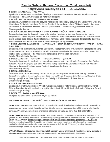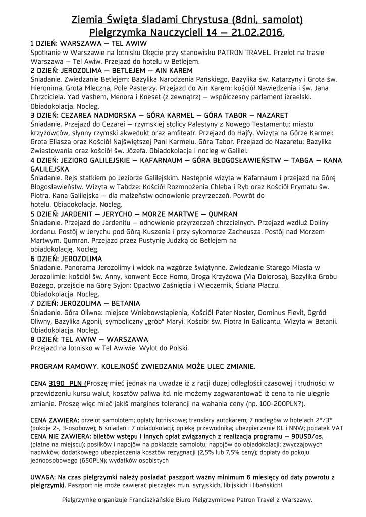 Ziemia Święta śladami Chrystusa (8dni, samolot) Pielgrzymka Nauczycieli 14 – 21.02.2016, 1 DZIEŃ: WARSZAWA – TEL AWIW Spotkanie w Warszawie na lotnisku Okęcie przy stanowisku PATRON TRAVEL. Przelot na trasie Warszawa – Tel Awiw. Przejazd do hotelu w Betlejem. 2 DZIEŃ: JEROZOLIMA – BETLEJEM – AIN KAREM Śniadanie. Zwiedzanie Betlejem: Bazylika Narodzenia Pańskiego, Bazylika św. Katarzyny i Grota św. Hieronima, Grota Mleczna, Pole Pasterzy. Przejazd do Ain Karem: kościół Nawiedzenia i św. Jana Chrzciciela. Yad Vashem, Menora i Kneset (z zewnątrz) – współczesny parlament izraelski. Obiadokolacja. Nocleg. 3 DZIEŃ: CEZAREA NADMORSKA – GÓRA KARMEL – GÓRA TABOR – NAZARET Śniadanie. Przejazd do Cezarei – rzymskiej stolicy Palestyny z Nowego Testamentu: miasto krzyżowców, słynny rzymski akwedukt oraz amfiteatr. Przejazd do Hajfy. Wizyta na Górze Karmel: Grota Eliasza oraz Kościół Najświętszej Pani Karmelu. Góra Tabor. Przejazd do Nazaretu: Bazylika Zwiastowania oraz kościół św. Józefa. Obiadokolacja i nocleg w Galilei. 4 DZIEŃ: JEZIORO GALILEJSKIE – KAFARNAUM – GÓRA BŁOGOSŁAWIEŃSTW – TABGA – KANA GALILEJSKA Śniadanie. Rejs statkiem po Jeziorze Galilejskim. Następnie wizyta w Kafarnaum i przejazd na Górę Błogosławieństw. Wizyta w Tabdze: Kościół Rozmnożenia Chleba i Ryb oraz Kościół Prymatu św. Piotra. Kana Galilejska – dla małżeństw odnowienie przyrzeczeń. Powrót do hotelu. Obiadokolacja. Nocleg. 5 DZIEŃ: JARDENIT – JERYCHO – MORZE MARTWE – QUMRAN Śniadanie. Przejazd do Jardenitu – odnowienie przyrzeczeń chrzcielnych. Przejazd wzdłuż Doliny Jordanu. Postój w Jerychu pod Górą Kuszenia i przy sykomorze Zacheusza. Postój nad Morzem Martwym. Qumran. Przejazd przez Pustynię Judzką do Betlejem na obiadokolację. Nocleg. 6 DZIEŃ: JEROZOLIMA Śniadanie. Panorama Jerozolimy i widok na wzgórze świątynne. Zwiedzanie Starego Miasta w Jerozolimie: kościół św. Anny, konwent Ecce Homo, Droga Krzyżowa (Via Dolorosa), Bazylika Grobu Bożego, przejście na Górę Syjon: Opactwo Zaśnięcia i Wieczernik, Ściana Płaczu. Obiadokolacja. Nocleg. 7 DZIEŃ: JEROZOLIMA – BETANIA Śniadanie. Góra Oliwna: miejsce Wniebowstąpienia, Kościół Pater Noster, Dominus Flevit, Ogród Oliwny, Bazylika Agonii, symboliczny „grób” Maryi. Kościół św. Piotra In Galicantu. Wizyta w Betanii. Obiadokolacja. Nocleg. 8 DZIEŃ: TEL AWIW – WARSZAWA Przejazd na lotnisko w Tel Awiwie. Wylot do Polski. PROGRAM RAMOWY. KOLEJNOŚĆ ZWIEDZANIA MOŻE ULEC ZMIANIE. CENA 3190 PLN (Proszę mieć jednak na uwadze iż z racji dużej odległości czasowej i trudności w przewidzeniu kursu walut, kosztów paliwa itd. nie możemy zagwarantować iż cena ta nie ulegnie zmianie. Proszę więc mieć jakiś margines tolerancji na wahania ceny (np. 100-200PLN?). CENA ZAWIERA: przelot samolotem; opłaty lotniskowe; transfery autokarem; 7 noclegów w hotelach 2*/3* (pokoje 2-, 3-osobowe); 6 śniadań i 7 obiadokolacji; opiekę przewodnika; ubezpieczenie KL i NNW; podatek VAT CENA NIE ZAWIERA: biletów wstępu i innych opłat związanych z realizacja programu – 90USD/os. (płatne na miejscu); posiłków i napojów na pokładzie samolotu; napojów do obiadokolacji; zwyczajowych napiwków; dodatkowego ubezpieczenia kosztów rezygnacji (2,5% lub 7,5% ceny); dopłaty do pokoju jednoosobowego (650PLN); wydatków osobistych UWAGA: Na czas pielgrzymki należy posiadać paszport ważny minimum 6 miesięcy od daty powrotu z pielgrzymki. Paszport nie może zawierać pieczątek m.in. syryjskich, libijskich i libańskich! Pielgrzymkę organizuje Franciszkańskie Biuro Pielgrzymkowe Patron Travel z Warszawy. Zapisy, do wyczerpania miejsc, u ks. Jana Brodziaka w Michowie t. 81 856 60 27 lub 608 439 263. Przy zapisie wpłata 200 zł. Kolejne wpłaty: do końca września 800 zł; do końca października 1000 zł; do końca listopada pozostałą kwotę.