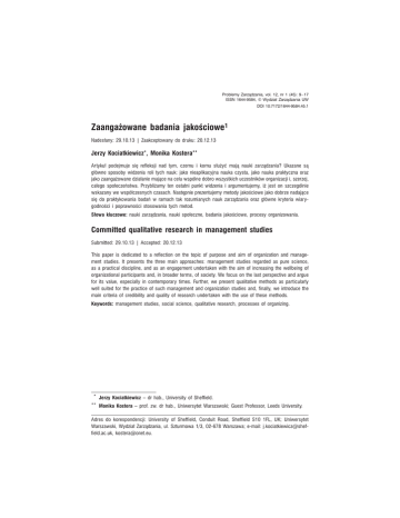 Problemy ZarzÈdzania, vol. 12, nr 1 (45): 9 – 17 ISSN 1644-9584, © Wydziaï ZarzÈdzania UW DOI 10.7172/1644-9584.45.1 Zaangaĝowane badania jakoĂciowe1 Nadesïany: 29.10.13 | Zaakceptowany do druku: 20.12.13 Jerzy Kociatkiewicz*, Monika Kostera** Artykuï podejmuje siÚ refleksji nad tym, czemu ib komu sïuĝyÊ majÈ nauki zarzÈdzania? Ukazane sÈ gïówne sposoby widzenia roli tych nauk: jako nieaplikacyjna nauka czysta, jako nauka praktyczna oraz jako zaangaĝowane dziaïanie majÈce na celu wspólne dobro wszystkich uczestników organizacji i, szerzej, caïego spoïeczeñstwa. Przybliĝamy ten ostatni punkt widzenia ib argumentujemy, iĝ jest on szczególnie wskazany we wspóïczesnych czasach. NastÚpnie prezentujemy metody jakoĂciowe jako dobrze nadajÈce siÚ do praktykowania badañ wb ramach tak rozumianych nauk zarzÈdzania oraz gïówne kryteria wiarygodnoĂci ib poprawnoĂci stosowania tych metod. Sïowa kluczowe: nauki zarzÈdzania, nauki spoïeczne, badania jakoĂciowe, procesy organizowania. Committed qualitative research in management studies Submitted: 29.10.13 | Accepted: 20.12.13 This paper is dedicated to ab reflection on the topic of purpose and aim of organization and management studies. It presents the three main approaches: management studies regarded as pure science, as ab practical discipline, and as an engagement undertaken with the aim of increasing the wellbeing of organizational participants and, in broader terms, of society. We focus on the last perspective and argue for its value, especially in contemporary times. Further, we present qualitative methods as particularly well suited for the practice of such management and organization studies and, finally, we introduce the main criteria of credibility and quality of research undertaken with the use of these methods. Keywords: management studies, social science, qualitative research, processes of organizing. * Jerzy Kociatkiewicz – dr hab., University of Sheffield. ** Monika Kostera – prof. zw. dr hab., Uniwersytet Warszawski; Guest Professor, Leeds University. Adres do korespondencji: University of Sheffield, Conduit Road, Sheffield S10 1FL, UK; Uniwersytet Warszawski, Wydziaï ZarzÈdzania, ul. Szturmowa 1/3, 02-678 Warszawa; e-mail: [email protected], [email protected]. Jerzy Kociatkiewicz, Monika Kostera 1. Wprowadzenie Uwaĝa siÚ, ĝe nauki zarzÈdzania zawdziÚczajÈ swoje powstanie przede wszystkim dwóm dyscyplinom macierzystym: naukom inĝynierskim (Taylor, 1911) ibsocjologii (Weber, 1978; pisma poĂwiÚcone organizacji ibprzywództwu mniej wiÚcej wspóïczesne zb publikacjami Taylora). Jednak bardzo szybko wïÈczyïy siÚ wb tworzenie ich zrÚbów takĝe inne dyscypliny, takie jak psychologia (Parker Follet, 2013; ksiÈĝka opublikowana oryginalnie wb roku 1918), czy antropologia kulturowa (Mayo, 1949). Psychologia ib inne nauki spoïeczne byïy zatem obecne od samego poczÈtku wbprocesie tworzenia nauk zarzÈdzania, abwiÚc wbsposób naturalny przejmowane sÈ metody badawcze pochodzÈce zbtych nauk. JakoĂciowe metody badañ zaangaĝowanych wbtworzenie ibulepszanie procesów organizacyjnych sÈ wkïadem nauk zarzÈdzania wb nauki podstawowe ib temu poĂwiÚcimy ten tekst. 2. ZarzÈdzanie jako dyscyplina nauki ZarzÈdzanie jako dyscyplinÚ nauki charakteryzuje pewne niedookreĂlenie przypisanego mu zakresu: kim ib czym powinno siÚ zajmowaÊ, czym róĝni siÚ od pokrewnych sobie dziedzin, ab nawet które dziedziny uznaÊ naleĝy za pokrewne zarzÈdzaniu? WiÚkszoĂÊ naukowców zgadza siÚ, ĝe badanie zarzÈdzania oznacza zajmowanie siÚ organizacjami ibich Ărodowiskiem (np. Donaldson, 1996; Harding, 2003; Fleetwood, 2004; Koěmiñski ibPiotrowski, 2010), ale poniewaĝ prawie caïa dziaïalnoĂÊ wspóïczesnego czïowieka odbywa siÚ wbramach organizacji, niewiele zb tej zgody wynika. Problemy ze zdefiniowaniem zarzÈdzania dobrze ilustruje graniczÈca zb dowolnoĂciÈ róĝnorodnoĂÊ ich instytucjonalnego przyporzÈdkowania. Wboficjalnym polskim systemie klasyfikacji dyscyplin naukowych nauki zarzÈdzania jako jedyne przypisane sÈ dwóm róĝnym obszarom nauki (naukom spoïecznym ibhumanistycznym), abwbWielkiej Brytanii wydziaïy zarzÈdzania znaleěÊ moĝna wb grupach wydziaïów nauk spoïecznych (np. Uniwersytet wb Sheffield), nauk humanistycznych (np. Uniwersytet wb Manchester) albo jako samodzielny wydziaï zawierajÈcy wb swej strukturze departament ekonomii (np. Uniwersytet wb Lancaster). Moĝna jednak spróbowaÊ okreĂliÊ tematykÚ nauk zarzÈdzania wb nieco inny sposób, odpowiadajÈc nie tyle na pytanie ob ich przedmiot czy zwiÈzki zb innymi dziedzinami nauki, ile ob ich adresata: Komu powinny sïuĝyÊ nauki zarzÈdzania? W literaturze przedmiotu odnaleěÊ moĝna trzy zasadnicze odpowiedzi na powyĝsze pytanie, wynikajÈce zb odmiennych koncepcji nauki jako takiej, prowadzÈce równieĝ do róĝnego okreĂlenia celów, jakie stawiaÊ powinni sobie badacze zarzÈdzania, oraz metod, które pozwolÈ na ich osiÈgniÚcie. PierwszÈ odpowiedziÈ jest uznanie zarzÈdzania za nieaplikacyjna naukÚ czystÈ, wiedzionÈ wyïÈcznie pragnieniem poznania Ăwiata ibtworzÈcÈ wiedzÚ 10 DOI 10.7172/1644-9584.45.1 Zaangaĝowane badania jakoĂciowe udostÚpnianÈ nastÚpnie caïej ludzkoĂci. Takie podejĂcie reprezentuje Lex Donaldson (1996), wedïug którego zarzÈdzanie jako nauka opieraÊ siÚ ma na obiektywnym opisie Ăwiata organizacji ib procesów zarzÈdczych ib dÈĝyÊ do sformuïowania deterministycznych praw rzÈdzÈcych powstawaniem ibfunkcjonowaniem organizacji. Naukowcy funkcjonujÈ oczywiĂcie wbĂwiecie spoïecznym ib reprezentujÈ róĝne przekonania ib przywiÈzania do konkretnych wartoĂci, ale tworzona przez nich nauka musi byÊ tych przypadïoĂci pozbawiona. Oznacza to równieĝ, ĝe metodologia badañ powinna zawsze wynikaÊ zb podjÚtej problematyki (wybrana metoda dawaÊ ma najwiÚkszÈ moĝliwoĂÊ obiektywnego poznania badanego zjawiska). PodejĂcie 