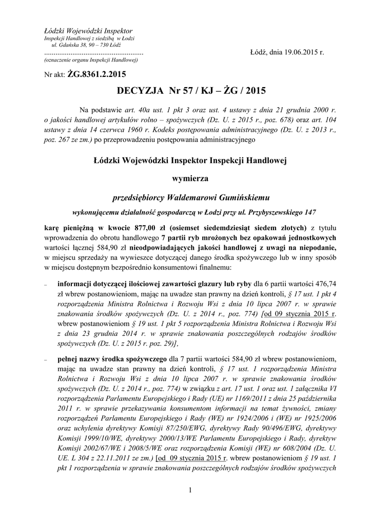 Łódzki Wojewódzki Inspektor Inspekcji Handlowej z siedzibą w Łodzi ul. Gdańska 38, 90 – 730 Łódź Łódź, dnia 19.06.2015 r. ..................................................... (oznaczenie organu Inspekcji Handlowej) Nr akt: ŻG.8361.2.2015 DECYZJA Nr 57 / KJ – ŻG / 2015 Na podstawie art. 40a ust. 1 pkt 3 oraz ust. 4 ustawy z dnia 21 grudnia 2000 r. o jakości handlowej artykułów rolno – spożywczych (Dz. U. z 2015 r., poz. 678) oraz art. 104 ustawy z dnia 14 czerwca 1960 r. Kodeks postępowania administracyjnego (Dz. U. z 2013 r., poz. 267 ze zm.) po przeprowadzeniu postępowania administracyjnego Łódzki Wojewódzki Inspektor Inspekcji Handlowej wymierza przedsiębiorcy Waldemarowi Gumińskiemu wykonującemu działalność gospodarczą w Łodzi przy ul. Przybyszewskiego 147 karę pieniężną w kwocie 877,00 zł (osiemset siedemdziesiąt siedem złotych) z tytułu wprowadzenia do obrotu handlowego 7 partii ryb mrożonych bez opakowań jednostkowych wartości łącznej 584,90 zł nieodpowiadających jakości handlowej z uwagi na niepodanie, w miejscu sprzedaży na wywieszce dotyczącej danego środka spożywczego lub w inny sposób w miejscu dostępnym bezpośrednio konsumentowi finalnemu: informacji dotyczącej ilościowej zawartości glazury lub ryby dla 6 partii wartości 476,74 zł wbrew postanowieniom, mając na uwadze stan prawny na dzień kontroli, § 17 ust. 1 pkt 4 rozporządzenia Ministra Rolnictwa i Rozwoju Wsi z dnia 10 lipca 2007 r. w sprawie znakowania środków spożywczych (Dz. U. z 2014 r., poz. 774) [od 09 stycznia 2015 r. wbrew postanowieniom § 19 ust. 1 pkt 5 rozporządzenia Ministra Rolnictwa i Rozwoju Wsi z dnia 23 grudnia 2014 r. w sprawie znakowania poszczególnych rodzajów środków spożywczych (Dz. U. z 2015 r. poz. 29)], pełnej nazwy środka spożywczego dla 7 partii wartości 584,90 zł wbrew postanowieniom, mając na uwadze stan prawny na dzień kontroli, § 17 ust. 1 rozporządzenia Ministra Rolnictwa i Rozwoju Wsi z dnia 10 lipca 2007 r. w sprawie znakowania środków spożywczych (Dz. U. z 2014 r., poz. 774) w związku z art. 17 ust. 1 oraz ust. 1 załącznika VI rozporządzenia Parlamentu Europejskiego i Rady (UE) nr 1169/2011 z dnia 25 października 2011 r. w sprawie przekazywania konsumentom informacji na temat żywności, zmiany rozporządzeń Parlamentu Europejskiego i Rady (WE) nr 1924/2006 i (WE) nr 1925/2006 oraz uchylenia dyrektywy Komisji 87/250/EWG, dyrektywy Rady 90/496/EWG, dyrektywy Komisji 1999/10/WE, dyrektywy 2000/13/WE Parlamentu Europejskiego i Rady, dyrektyw Komisji 2002/67/WE i 2008/5/WE oraz rozporządzenia Komisji (WE) nr 608/2004 (Dz. U. UE. L 304 z 22.11.2011 ze zm.) [od 09 stycznia 2015 r. wbrew postanowieniom § 19 ust. 1 pkt 1 rozporządzenia w sprawie znakowania poszczególnych rodzajów środków spożywczych 1 w związku z art. 17 ust. 1 i ust. 1 załącznika VI rozporządzenia Parlamentu Europejskiego i Rady (UE) nr 1169/2011 z dnia 25 października 2011 r. w sprawie przekazywania konsumentom informacji na temat żywności, zmiany rozporządzeń Parlamentu Europejskiego i Rady (WE) nr 1924/2006 i (WE) nr 1925/2006 oraz uchylenia dyrektywy Komisji 87/250/EWG, dyrektywy Rady 90/496/EWG, dyrektywy Komisji 1999/10/WE, dyrektywy 2000/13/WE Parlamentu Europejskiego i Rady, dyrektyw Komisji 2002/67/WE i 2008/5/WE oraz rozporządzenia Komisji (WE) nr 608/2004 (Dz. U. UE. L 304 z 22.11.2011 ze zm.)], nazwy albo imienia i nazwiska producenta dla 7 partii wartości 584,90 zł wbrew postanowieniom, mając na uwadze stan prawny na dzień kontroli, § 17 ust. 1 pkt 1 rozporządzenia Ministra Rolnictwa i Rozwoju Wsi z dnia 10 lipca 2007 r. w sprawie znakowania środków spożywczych (Dz. U. z 2014 r., poz. 774) [od 09 stycznia 2015 r. wbrew postanowieniom § 19 ust. 1 pkt 2 rozporządzenia Ministra Rolnictwa i Rozwoju Wsi z dnia 23 grudnia 2014 r. w sprawie znakowania poszczególnych rodzajów środków spożywczych (Dz. U. z 2015 r. poz. 29)]. Uzasadnienie W dniach od 08 do 13 stycznia 2015 r. na podstawie upoważnienia Łódzkiego Wojewódzkiego Inspektora Inspekcji Handlowej numer ŻG.8361.2.2015 z dnia 08.01.2015 r. inspektorzy Wojewódzkiego Inspektoratu Inspekcji Handlowej w Łodzi przeprowadzili kontrolę w punkcie sprzedaży zlokalizowanym na targowisku w Łodzi przy ul. Przybyszewskiego 147, należącym do Waldemara Gumińskiego. Kontrolę przeprowadzono na podstawie przepisów art. 3 ust. 1 - 3 rozporządzenia Parlamentu Europejskiego i Rady (WE) Nr 882/2004 z dnia 29 kwietnia 2004 r. w sprawie kontroli urzędowych przeprowadzanych w celu sprawdzenia zgodności z prawem paszowym i żywnościowym oraz regułami dotyczącymi zdrowia zwierząt i dobrostanu zwierząt (Dz. U. L 165 z 30.4.2004 ze zm.), art. 17 ust. 3 ustawy z dnia 21 grudnia 2000 r. o jakości handlowej artykułów rolno-spożywczych (Dz. U. z 2014 r., poz. 669 ze zm.), art. 24 ust. 1 rozporządzenia Parlamentu Europejskiego i Rady (WE) nr 1935/2004 z dnia 27 października 2004 r. w sprawie materiałów i wyrobów przeznaczonych do kontaktu z żywnością oraz uchylającego dyrektywy 80/590/EWG (Dz. U. z 27.10.2004 s. 4 ze zm.) w związku z art. 3 ust. 1 pkt 6 oraz art. 3 ust. 1 pkt 1, 2 ustawy z dnia 15 grudnia 2000 r. o Inspekcji Handlowej (Dz. U. z 2014 r., poz. 148 ze zm.) w obecności osoby czynnej … (w dniu 08 stycznia 2015 r.) oraz właściciela Waldemara Gumińskiego (w dniach 09 i 13 stycznia 2015r.). W trakcie kontroli stwierdzono, że w obrocie handlowym znajdowało się 7 partii ryb mrożonych bez opakowań łącznej wartości 584,90 zł, deklarowanych w miejscu sprzedaży, na wywieszkach umieszczonych przy produkcie, jako: „rekin” w cenie 14,80 zł za kilogram (6,70 kg), „miruna” w cenie 20,80 zł za kilogram (5,20 kg), „karmazyn” w cenie 19,20 zł za kilogram (4,10 kg), „f. halibut” w cenie 41,00 zł za kilogram (2,50 kg), „mintaj” w cenie 15,30 zł za kilogram (4,40 kg), 2 „stek z łososia” w cenie 22,