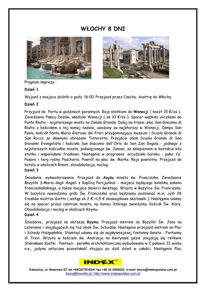 WŁOCHY 8 DNI Program imprezy : Dzień 1 Wyjazd z miejsca zbiórki o godz. 16:00 Przejazd przez Czechy, Austrię do Włochy. Dzień 2 Przyjazd do Portu w godzinach porannych. Rejs statkiem do Wenecji ( koszt 15 €/os ). Zwiedzanie Pałacu Dożów, władców Wenecji ( ok 10 €/os ). Spacer wąskimi uliczkami do Ponte Rialto - najstarszego mostu na Canale Grande. Dalej na trasie: plac San Giacomo di Rialto z kościołem o tej samej nazwie, uważany za najstarszy w Wenecji, Campo San Paolo, kościół Santa Maria Gloriosa dei Frari przypominający muzeum i Scuola Grande di San Rocco ze sławnymi obrazami Tintoretta. Przejście obok Scuola Grande di San Giovanni Evangelista i kościoła San Giacomo dell'Orio do San Zan Degola - jednego z najstarszych kościołów miasta, poświęconego św. Janowi, ze sklepieniem w kształcie kilu statku i wspaniałymi freskami. Następnie w programie: arcydzieło baroku - pałac Ca' Pesaro i targ rybny Pescheria. Powrót na plac św. Marka. Rejs powrotny. Przejazd do hotelu w okolicach Rimini, obiadokolacja, nocleg Dzień 3 Śniadanie, wykwaterowanie. Przejazd do Asyżu miasta św. Franciszka. Zwiedzanie Bazyliki S.Maria degli Angeli z Kaplicą Porcjunkuli - miejsca będącego kolebką zakonu franciszkańskiego, a także miejsca śmierci świętego. Wizyta w Bazylice Św. Franciszka. W bazylice nawiedzimy grób Św. Franciszka oraz będziemy podziwiać m.in. cykl 28 fresków mistrza Giotto ( wstęp ok 2 € +1,5 € obowiązkowe słuchawki ). Następnie udamy się na spacer przez centrum miasta, na koniec którego zwiedzimy Kościół Św. Klary. Obiadokolacja i nocleg w okolicach Rzymu Dzień 4 Śniadanie, przejazd na obrzeża Rzymu. Przejazd metrem do Bazyliki Św. Jana na Lateranie i znajdujących się tuż obok Św. Schodów. Następnie przejazd metrem na Plac i Schody Hiszpańskie. Stamtąd udamy się do najsłynniejszej fontanny świata - Fontanny di Trevi. Wizyta w kościele św. Andrzeja na Kwirynale gdzie znajdują się relikwie Stanisława Kostki. Panteon - perełka architektoniczna wybudowana w I połowie II wieku n.e., jedyna antyczna pozostałość stojąca po dziś dzień w całości. Następnie Plac Katowice, ul. Stawowa 5/7 tel +48/32/7818341 fax +48 32 2068022 e-mail: [email protected] [email protected], http://www.indexpolska.com.pl Wenecki, przy którym stoi pomnik przypominający o wielkim dziele zjednoczenia państwa włoskiego w latach 1860-1870 przedstawiający pierwszego jego króla Wiktora Emanuela II. Przejście na Kapitol - miejsce od czasów antycznych uważane za serce duchowe, polityczne i kulturalne Rzymu. Z tarasu widokowego na Kapitolu ujrzymy antyczne Forum Romanum a następnie dotrzemy pod najsłynniejszy amfiteatr świata – Koloseum. Powrót do Hotelu, obiadokolacja, nocleg Dzień 5 Śniadanie. Przejazd do Watykanu. Zwiedzanie Muzeów Watykańskich ( bilet ok 8 € ze słuchawkami i opłatą rezerwacyjną 1/10 opiekun gratis ), w których będziemy podziwiać bogatą kolekcję dzieł sztuki zgromadzonych przez papieży wszystkich epok. Punktem kulminacyjnym naszego pobytu w Muzeach Watykańskich będzie zwiedzanie Kaplicy Sykstyńskiej - miejsca wielu w historii wyborów papieży, tzw. Konklawe. Wprost z Kaplicy Sykstyńskiej zejdziemy do Bazyliki Św. Piotra - miejsca, w którym od 2 tys. lat spoczywają doczesne szczątki namiestnika Chrystusa na Ziemi, pierwszego papieża - Św. Piotra. W bazylice nawiedzimy grób św. Jana Pawła II. Będziemy również podziwiać najcenniejsze dzieła sztuki okresu odrodzenia i baroku. Wśród nich baldachim z brązu wykonany przez G.L. Berniniego i słynną Pietę Michała Anioła - "najpiękniejszą rzeźbę przeszłości, teraźniejszości i przyszłości" . Obiadokolacja. Nocleg Dzień 6 Śniadanie, wykwaterowanie. Przejazd do Sieny -zwiedzanie: Sanktuarium św. Katarzyny Sieneńskiej - jednej z głównych patronek Włoch, Kościół Dominikanów, Katedra, Baptysterium, Piazza Il Campo, na którym odbywają się wyścigi konne. Przejazd do Pizy zwiedzanie historycznego centrum z zespołem katedralnym wraz ze sławną Torre Pendente czyli "krzywą wieżą" .Przejazd w okolice Rimini, obiadokolacja, nocleg Dzień 7 Śniadanie, czas wolny na plażowanie, obiadokolacja, nocleg Dzień 8 Śniadanie, wykwaterowanie, wyjazd w drogę powrotną. Powrót na miejsce zbiórki w godzinach nocnych Cena dla grupy min 45 os płatnych: 1360 zł +bilety wstępów i opłaty obligatoryjne Cena zawiera: Transport autokarem Lux 3 noclegi w okolicach Rimini – hotel **/*** pokoje 3-4 osobowe z pełnym węzłem sanitarnym 3 noclegi w okolicach Rzymu – hotel **/*** pokoje 3,4 osobowe z pełnym węzłem sanitarnym Katowice, ul. Stawowa 5/7 tel +48/32/7818341 fax +48 32 2068022 e-mail: [email protected] [email protected], http://www.indexpolska.com.pl 6 śniadań wzmocnionych, 6 obiadokolacji Ubezpieczenie KL 10000 € i NNW 10000 zł ( TU Signal Iduna ) Opieka pilota Opłaty wjazdowe i parkingowe 4 opiekunów gratis przy grupie 45 os płatnych Cena nie zawiera opłat obligatoryjnych : przewodnik po Watykanie 200 €/grupę, taxa klimatyczna płatna w hotelach ok 5 €/ 6noclegów Ceny biletów wstępu są cenami orientacyjnymi i mogą one ulec zmianie niezależnie od Biura Podróży Index. Prosimy o zebranie dodatkowej kwoty w celu zabezpieczenia się przed podwyżkami Kolejność zwiedzania może ulec zmianie w zależności od terminu rezerwacji obiektów. Obowiązkowym dokumentem tożsamości za granica osób niepełnoletnich jest tymczasowy dowód osobisty lub paszport Proszę o informację zwrotną do 14 dni roboczych potwierdzającą lub anulującą realizację wycieczki Katarzyna Wróbel Biuro Podróży "INDEX" ul. Stawowa 5/7 40-095 Katowice tel: +4832 7818341, 7818340 wew. 128 fax: +4832 2068022 http://www.indexpolska.com.pl/ Katowice, ul. Stawowa 5/7 tel +48/32/7818341 fax +48 32 2068022 e-mail: [email protected] [email protected], http://www.indexpolska.com.pl