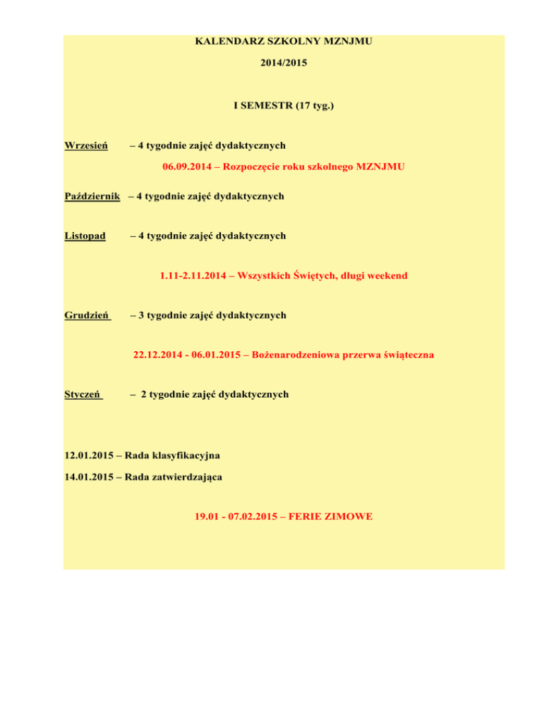 KALENDARZ SZKOLNY MZNJMU 2014/2015 I SEMESTR (17 tyg.) Wrzesień – 4 tygodnie zajęć dydaktycznych 06.09.2014 – Rozpoczęcie roku szkolnego MZNJMU Październik – 4 tygodnie zajęć dydaktycznych Listopad – 4 tygodnie zajęć dydaktycznych 1.11-2.11.2014 – Wszystkich Świętych, długi weekend Grudzień – 3 tygodnie zajęć dydaktycznych 22.12.2014 - 06.01.2015 – Bożenarodzeniowa przerwa świąteczna Styczeń – 2 tygodnie zajęć dydaktycznych 12.01.2015 – Rada klasyfikacyjna 14.01.2015 – Rada zatwierdzająca 19.01 - 07.02.2015 – FERIE ZIMOWE II SEMESTR (16 tyg.) Luty – 4 tygodnie zajęć dydaktycznych Marzec – 4 tygodnie zajęć dydaktycznych Kwiecień – 2 tygodnie zajęć dydaktycznych 02.04-07.04.2015 – Wielkanocna przerwa świąteczna 11.04-13.04.2015 – Wielkanoc w Ukrainie Maj – 4 tygodnie zajęć dydaktycznych 01.05-03.05.2015 – Weekend majowy Czerwiec – 2 tygodnie zajęć dydaktycznych 04.06-07.06.2015 – Boże Ciało, długi weekend 17.06.2015 – Rada klasyfikacyjna 19.06.2015 – Rada zatwierdzająca 20.06.2015 Uroczyste zakończenie roku szkolnego WAKACJE