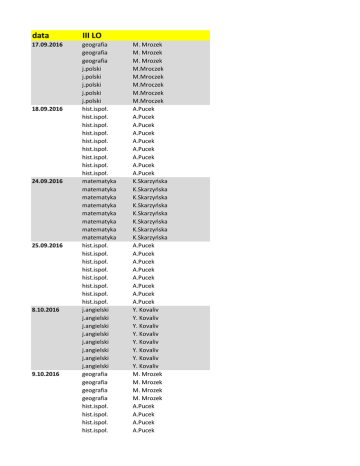 data III LO 17.09.2016 geografia geografia geografia j.polski j.polski j.polski j.polski j.polski hist.ispoł. hist.ispoł. hist.ispoł. hist.ispoł. hist.ispoł. hist.ispoł. hist.ispoł. hist.ispoł. hist.ispoł. matematyka matematyka matematyka matematyka matematyka matematyka matematyka matematyka hist.ispoł. hist.ispoł. hist.ispoł. hist.ispoł. hist.ispoł. hist.ispoł. hist.ispoł. hist.ispoł. j.angielski j.angielski j.angielski j.angielski j.angielski j.angielski j.angielski j.angielski geografia geografia geografia geografia hist.ispoł. hist.ispoł. hist.ispoł. hist.ispoł. 18.09.2016 24.09.2016 25.09.2016 8.10.2016 9.10.2016 M. Mrozek M. Mrozek M. Mrozek M.Mroczek M.Mroczek M.Mroczek M.Mroczek M.Mroczek A.Pucek A.Pucek A.Pucek A.Pucek A.Pucek A.Pucek A.Pucek A.Pucek A.Pucek K.Skarzyńska K.Skarzyńska K.Skarzyńska K.Skarzyńska K.Skarzyńska K.Skarzyńska K.Skarzyńska K.Skarzyńska A.Pucek A.Pucek A.Pucek A.Pucek A.Pucek A.Pucek A.Pucek A.Pucek Y. Kovaliv Y. Kovaliv Y. Kovaliv Y. Kovaliv Y. Kovaliv Y. Kovaliv Y. Kovaliv Y. Kovaliv M. Mrozek M. Mrozek M. Mrozek M. Mrozek A.Pucek A.Pucek A.Pucek A.Pucek 22.10.2016 23.10.2016 5.11.2016 6.11.2016 19.11.2016 20.11.2016 26.11.2016 j.angielski j.angielski j.angielski matematyka matematyka matematyka matematyka matematyka geografia geografia geografia geografia matematyka matematyka matematyka matematyka geografia geografia geografia geografia j. polski j. polski j. polski j. polski matematyka matematyka matematyka matematyka j. polski j. polski j. polski j. polski j.polski j.polski j.polski j.angielski j.angielski j.angielski j.angielski j.angielski geografia geografia geografia geografia matematyka matematyka matematyka matematyka matematyka matematyka Y. Kovaliv Y. Kovaliv Y. Kovaliv K.Skarzyńska K.Skarzyńska K.Skarzyńska K.Skarzyńska K.Skarzyńska M. Mrozek M. Mrozek M. Mrozek M. Mrozek K.Skarzyńska K.Skarzyńska K.Skarzyńska K.Skarzyńska M. Mrozek M. Mrozek M. Mrozek M. Mrozek M.Mroczek M.Mroczek M.Mroczek M.Mroczek K.Skarzyńska K.Skarzyńska K.Skarzyńska K.Skarzyńska M.Mroczek M.Mroczek M.Mroczek M.Mroczek M.Mroczek M.Mroczek M.Mroczek Y. Kovaliv Y. Kovaliv Y. Kovaliv Y. Kovaliv Y. Kovaliv M. Mrozek M. Mrozek M. Mrozek M. Mrozek K.Skarzyńska K.Skarzyńska K.Skarzyńska K.Skarzyńska K.Skarzyńska K.Skarzyńska 27.11.2016 3.12.2016 4.12.2016 17.12.2016 18.12.2016 14.01.2017 j. polski j. polski j.polski j.polski j.polski j.polski geografia geografia geografia geografia geografia j. polski j. polski j. polski matematyka matematyka matematyka matematyka geografia geografia geografia geografia geografia geografia geografia geografia matematyka matematyka j. angielski j. angielski j. polski j. polski j. polski j. polski j. polski j. polski j. polski j. polski j. angielski j. angielski j. angielski j. angielski j. polski j. polski j. polski j. polski j. angielski j. angielski matematyka matematyka M.Mroczek M.Mroczek M.Mroczek M.Mroczek M.Mroczek M.Mroczek M. Mrozek M. Mrozek M. Mrozek M. Mrozek M. Mrozek M.Mroczek M.Mroczek M.Mroczek K.Skarzyńska K.Skarzyńska K.Skarzyńska K.Skarzyńska M. Mrozek M. Mrozek M. Mrozek M. Mrozek M. Mrozek M. Mrozek M. Mrozek M. Mrozek K.Skarzyńska K.Skarzyńska Y. Kovaliv Y. Kovaliv M.Mroczek M.Mroczek M.Mroczek M.Mroczek M.Mroczek M.Mroczek M.Mroczek M.Mroczek Y. Kovaliv Y. Kovaliv Y. Kovaliv Y. Kovaliv M.Mroczek M.Mroczek M.Mroczek M.Mroczek Y. Kovaliv Y. Kovaliv K.Skarzyńska K.Skarzyńska 15.01.2016 28.01.2016 29.01.2016 j.polski j.polski j.polski j.polski j. polski j. polski j. polski j. angielski j.angielski j.angielski j.angielski j. angielski j.polski j.polski j.angielski j.angielski j.angielski j.angielski j.angielski M.Mroczek M.Mroczek M.Mroczek M.Mroczek M.Mroczek M.Mroczek M.Mroczek Y. Kovaliv Y. Kovaliv Y. Kovaliv Y. Kovaliv Y. Kovaliv M.Mroczek M.Mroczek Y. Kovaliv Y. Kovaliv Y. Kovaliv Y. Kovaliv Y. Kovaliv