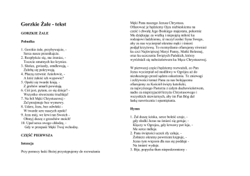 Gorzkie Żale - tekst GORZKIE ŻALE Pobudka 1. Gorzkie żale, przybywajcie, Serca nasze przenikajcie. 2. Rozpłyńcie się, me źrenice, Toczcie smutnych łez krynice. 3. Słońce, gwiazdy, omdlewają, Żałobą się pokrywają. 4. Płaczą rzewnie Aniołowie, A któż żałość ich wypowie? 5. Opoki się twarde krają. Z grobów umarli powstają. 6. Cóż jest, pytam, co się dzieje? Wszystko stworzenie truchleje! 7. Na ból Męki Chrystusowej Żal przejmuje bez wymowy. 8. Uderz, Jezu, bez odwłoki W twarde serc naszych opoki! 9. Jezu mój, we krwi ran Swoich Obmyj duszę z grzechów moich! 10. Upał serca swego chłodzę, Gdy w przepaść Męki Twej wchodzę. CZĘŚĆ PIERWSZA Intencja Przy pomocy łaski Bożej przystępujemy do rozważania Męki Pana naszego Jezusa Chrystusa. Ofiarować je będziemy Ojcu niebieskiemu na cześć i chwałę Jego Boskiego majestatu, pokornie Mu dziękując za wielką i niepojętą miłość ku rodzajowi ludzkiemu, iż raczył zesłać Syna Swego, aby za nas wycierpiał okrutne męki i śmierć podjął krzyżową. To rozmyślanie ofiarujemy również ku czci Najświętszej Maryi Panny, Matki Bolesnej, oraz ku uczczeniu Świętych Pańskich, którzy wyróżniali się nabożeństwem ku Męce Chrystusowej. W pierwszej części będziemy rozważali, co Pan Jezus wycierpiał od modlitwy w Ogrójcu aż do niesłusznego przed sądem oskarżenia. Te zniewagi i zelżywości temuż Panu za nas bolejącemu ofiarujemy za Kościół święty katolicki, za najwyższego Pasterza z całym duchowieństwem, nadto za nieprzyjaciół krzyża Chrystusowego i wszystkich niewiernych, aby im Pan Bóg dał łaskę nawrócenia i opamiętania. Hymn 1. Żal duszę ściska, serce boleść czuje, gdy słodki Jezus na śmierć się gotuje; Klęczy w Ogrojcu, gdy krwawy pot leje, Me serce mdleje. 2. Pana świętości uczeń zły całuje, Żołnierz okrutny powrózmi krępuje, Jezus tym więzom dla nas się poddaje Na śmierć wydaje. 3. Bije, popycha tłum nieposkromiony - Nielitościwie z tej i z owej strony, Za włosy targa; znosi w cierpliwości Król z wysokości. 4. Zsiniałe przedtem krwią zachodzą usta, Gdy zbrojną żołnierz rękawicą chlusta; Wnet się zmieniło w płaczliwe wzdychanie Serca kochanie. 5. Oby się serce we zły rozpływało, Że Cię mój Jezu, sprośnie obrażało! Żal mi, ach żal mi ciężkich moich złości Dla Twej miłości. Lament duszy nad cierpiącym Jezusem 1. Jezu, na zabicie okrutne, Cichy Baranku od wrogów szukany, Jezu mój kochany! 2. Jezu, za trzydzieści srebrników Od niewdzięcznego ucznia zaprzedany, Jezu mój kochany! 3. Jezu, w ciężkim smutku żałością, Jakoś sam wyznał, przed śmiercią nękany, Jezu mój kochany! 4. Jezu, na modlitwie w Ogrojcu Strumieniem potu krwawego zalany, Jezu mój kochany! 5. Jezu, całowaniem zdradliwym od niegodnego Judasza wydany, Jezu mój kochany! 6. Jezu, powrozami grubymi od swawolnego żołdactwa związany, Jezu mój kochany! 7. Jezu, od pospólstwa zelżywie Przed Annaszowym sądem znieważany, Jezu mój kochany! 8. Jezu, przez ulice sromotnie Przed sąd Kajfasza za włosy targany, Jezu mój kochany! 9. Jezu, od Malchusa srogiego Ręką zbrodniczą wypoliczkowany, Jezu mój kochany! 10. Jezu od fałszywych dwóch świadków Za zwodziciela niesłusznie podany, Jezu mój kochany! Bądź pozdrowiony, bądź pochwalony, Dla nas zelżony i pohańbiony! Bądź uwielbiony, bądź wysławiony, Boże nieskończony! Rozmowa duszy z Matką Bolesną 1. Ach! Ja Matka tak żałosna! Boleść Mnie ściska nieznośna, Miecz me serce przenika, Miecz me serce przenika. 2. Czemuś, Matko ukochana, Ciężko na sercu stroskana? Czemu wszystka truchlejesz? 3. Co mię pytasz? Wszystkam w mdłości, Mówić nie mogę w żałości, Krew mi serce zalewa. 4. Powiedz mi, o Panno moja, Czemu blednieje twarz Twoja? - Czemu gorzkie łzy lejesz? 5. Widzę, że Syn ukochany, W Ogrojcu cały zalany Potu krwawym potokiem. 6. O Matko, źródło miłości, Niech czuję gwałt Twej żałości! Dozwól mi z sobą płakać! (Jeżeli się śpiewa tylko jedną część, dodaje się 3 razy: Któryś za nas cierpiał rany...) CZĘŚĆ DRUGA Pobudka: "Gorzkie żale przybywajcie..." Intencja W drugiej części rozmyślania Męki Pańskiej będziemy rozważali, co Pan Jezus wycierpiał od niesłusznego przed sądem oskarżenia aż do okrutnego cierniem ukoronowania. Te zaś rany, zniewagi i zelżywości temuż Jezusowi cierpiącemu ofiarujemy, prosząc Go o pomyślność dla Ojczyzny naszej, o pokój i zgodę dla wszystkich narodów, a dla siebie o odpuszczenie grzechów, oddalenie klęsk i nieszczęść doczesnych, a szczególnie zarazy, głodu, ognia i wojny. Hymn 1. Przypatrz się; duszo, jak cię Bóg miłuje, Jako dla ciebie sobie nie folguje. - Przecież Go bardziej, niż katowska dręczy. Złość twoja męczy. 2. Stoi przed sędzia Pan wszego stworzenia, Cichy Baranek, z wielkiego wzgardzenia Dla białej szaty, którą jest odziany, Głupim nazwany. 3. Za moje złości grzbiet srodze biczują Pójdźmy grzesznicy oto nam gotują Ze Krwi Jezusa dla serca ochłody Zdrój żywej wody. 4. Pycha światowa niechaj, co chce wróży, Co na swe skronie wije wieniec z róży, W szkarłat na pośmiech, cierniem Król zraniony Jest ozdobiony! 5. Oby się serce we zły rozpływało, Że Cię, mój Jezu sprośnie obrażało! Żal mi, ach żal mi ciężkich moich złości Dla Twej miłości! Lament duszy nad cierpiącym Jezusem 1. Jezu, od pospólstwa niewinnie Jako łotr godzien śmierci obwołany, Jezu mój kochany! 2. Jezu, od złośliwych morderców Po ślicznej twarzy tak, sprośnie zeplwany, Jezu mój kochany! 3. Jezu, pod przysięgą od Piotra Po trzykroć z wielkiej bojaźni zaprzany, Jezu mój kochany 4. Jezu, od okrutnych oprawców Na sąd Piłata, jak zbójca szarpany, - Jezu mój.kochany! 5. Jezu, od Heroda i dworzan, Królu niebieski, zelżywie wyśmiany, Jezu mój kochany! 6. Jezu, w białą szatę szydersko Na większy pośmiech 
