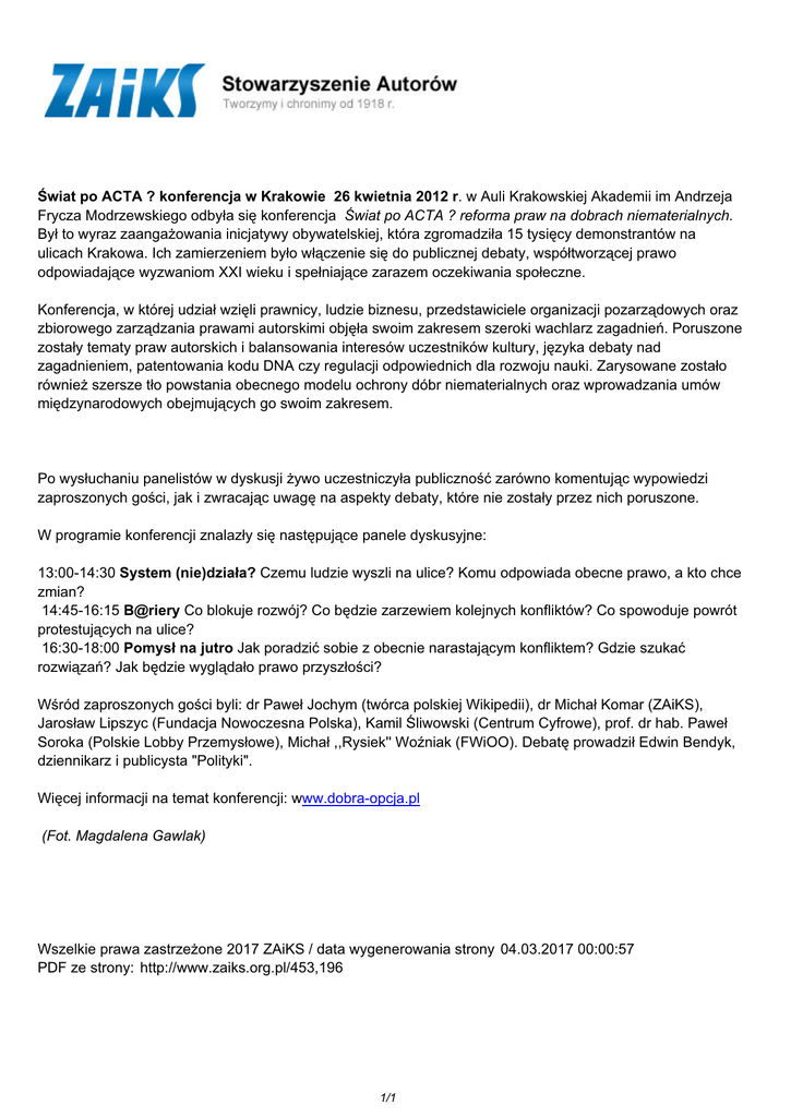 Świat po ACTA ? konferencja w Krakowie 26 kwietnia 2012 r. w Auli Krakowskiej Akademii im Andrzeja Frycza Modrzewskiego odbyła się konferencja Świat po ACTA ? reforma praw na dobrach niematerialnych. Był to wyraz zaangażowania inicjatywy obywatelskiej, która zgromadziła 15 tysięcy demonstrantów na ulicach Krakowa. Ich zamierzeniem było włączenie się do publicznej debaty, współtworzącej prawo odpowiadające wyzwaniom XXI wieku i spełniające zarazem oczekiwania społeczne. Konferencja, w której udział wzięli prawnicy, ludzie biznesu, przedstawiciele organizacji pozarządowych oraz zbiorowego zarządzania prawami autorskimi objęła swoim zakresem szeroki wachlarz zagadnień. Poruszone zostały tematy praw autorskich i balansowania interesów uczestników kultury, języka debaty nad zagadnieniem, patentowania kodu DNA czy regulacji odpowiednich dla rozwoju nauki. Zarysowane zostało również szersze tło powstania obecnego modelu ochrony dóbr niematerialnych oraz wprowadzania umów międzynarodowych obejmujących go swoim zakresem. Po wysłuchaniu panelistów w dyskusji żywo uczestniczyła publiczność zarówno komentując wypowiedzi zaproszonych gości, jak i zwracając uwagę na aspekty debaty, które nie zostały przez nich poruszone. W programie konferencji znalazły się następujące panele dyskusyjne: 13:00-14:30 System (nie)działa? Czemu ludzie wyszli na ulice? Komu odpowiada obecne prawo, a kto chce zmian? 14:45-16:15 B@riery Co blokuje rozwój? Co będzie zarzewiem kolejnych konfliktów? Co spowoduje powrót protestujących na ulice? 16:30-18:00 Pomysł na jutro Jak poradzić sobie z obecnie narastającym konfliktem? Gdzie szukać rozwiązań? Jak będzie wyglądało prawo przyszłości? Wśród zaproszonych gości byli: dr Paweł Jochym (twórca polskiej Wikipedii), dr Michał Komar (ZAiKS), Jarosław Lipszyc (Fundacja Nowoczesna Polska), Kamil Śliwowski (Centrum Cyfrowe), prof. dr hab. Paweł Soroka (Polskie Lobby Przemysłowe), Michał ,,Rysiek'' Woźniak (FWiOO). Debatę prowadził Edwin Bendyk, dziennikarz i publicysta "Polityki". Więcej informacji na temat konferencji: www.dobra-opcja.pl (Fot. Magdalena Gawlak) Wszelkie prawa zastrzeżone 2017 ZAiKS / data wygenerowania strony 04.03.2017 00:00:57 PDF ze strony: http://www.zaiks.org.pl/453,196 1/1
