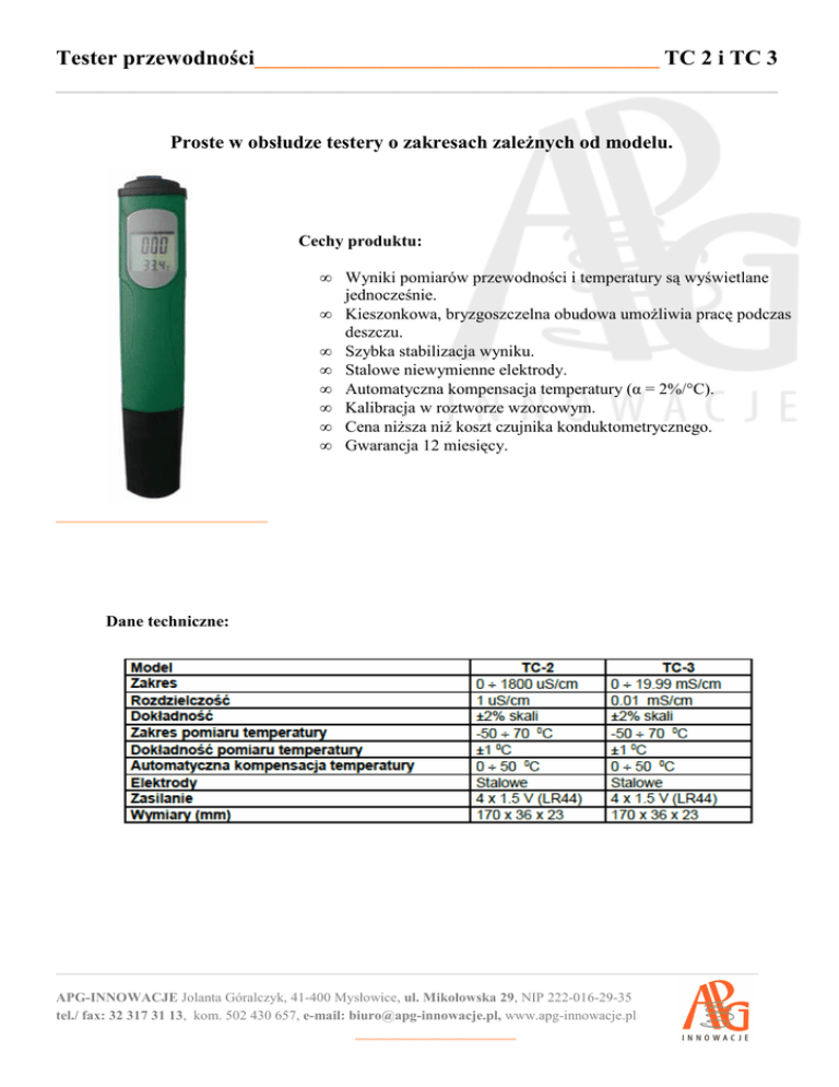 Tester przewodności_________________________________________ TC 2 i TC 3 ________________________________________________________________ Proste w obsłudze testery o zakresach zależnych od modelu. Cechy produktu: • • • • • • • • Wyniki pomiarów przewodności i temperatury są wyświetlane jednocześnie. Kieszonkowa, bryzgoszczelna obudowa umożliwia pracę podczas deszczu. Szybka stabilizacja wyniku. Stalowe niewymienne elektrody. Automatyczna kompensacja temperatury (α = 2%/°C). Kalibracja w roztworze wzorcowym. Cena niższa niż koszt czujnika konduktometrycznego. Gwarancja 12 miesięcy. _________________________ Dane techniczne: ___________________________________________________________________________________ APG-INNOWACJE Jolanta Góralczyk, 41-400 Mysłowice, ul. Mikołowska 29, NIP 222-016-29-35 tel./ fax: 32 317 31 13, kom. 502 430 657, e-mail: [email protected], www.apg-innowacje.pl ___________________