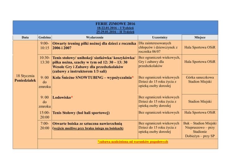 FERIE ZIMOWE 2016 18-22.01.2016 – I Tydzień 25-29.01.2016 – II Tydzień Data Godzina Wydarzenie Uczestnicy 9:00- Otwarty trening piłki nożnej dla dzieci z rocznika Dla zainteresowanych chłopców i dziewczynek z 10:15 2006 i 2007 Miejsce Hala Sportowa OSiR rocznika 06/07 10:30- Tenis stołowy/ unihokej/ siatkówka/ koszykówka/ Bez ograniczeń wiekowych, Gry i zabawy dla 13:30 piłka nożna, szachy w tym od 12: 30 – 13: 30 przedszkolaków Wesołe Gry i Zabawy dla przedszkolaków (zabawy z instruktorem 1/3 sali) 18 Stycznia Poniedziałek Hala Sportowa OSiR 9: 00 Koła Śnieżne SNOWTUBING – wypożyczalnia* do zmroku Bez ograniczeń wiekowych Dzieci do 15 roku życia z opieką osoby dorosłej 9: 00 Lodowisko* do zmroku Bez ograniczeń wiekowych Dzieci do 15 roku życia z opieką osoby dorosłej Stadion Miejski 15:00- Tenis Stołowy (hol hali sportowej) 20:00 Bez ograniczeń wiekowych Hala Sportowa OSiR 7:00- Otwarte boiska ze sztuczna nawierzchnią 20:00 (wejście możliwe przy braku śniegu na boiskach) Bez ograniczeń wiekowych Dzieci do 15 roku życia z opieką osoby dorosłej Buk – Stadion Miejski Niepruszewo – przy Stadionie Dobieżyn – przy SP *zabawa uzależniona od warunków pogodowych Górka saneczkowa Stadion Miejski 19 Stycznia Wtorek 10:30- Tenis stołowy/ unihokej/siatkówka/ koszykówka/ 13:30 piłka nożna, szachy w tym od 12: 30 – 13: 30 Wesołe Gry i Zabawy dla przedszkolaków (zabawy z instruktorem 1/3 sali) Bez ograniczeń wiekowych, Gry i zabawy dla Hala sportowa OSiR przedszkolaków 14:00- Otwarty trening piłki nożnej dla dzieci z 15:30 roczników 2008 i młodszych Dla zainteresowanych chłopców i dziewczynek Hala sportowa OSiR 9: 00 Koła Śnieżne SNOWTUBING – wypożyczalnia* do zmroku Bez ograniczeń Dzieci do 15 roku życia z opieką osoby dorosłej Górka saneczkowa Stadion Miejski 9:00 do Lodowisko* zmroku Bez ograniczeń Dzieci do 15 roku życia z opieką osoby dorosłej 15:00- Tenis Stołowy (hol hali sportowej) 20:00 Bez ograniczeń wiekowych Hala Sportowa OSiR 7:00- Otwarte boiska ze sztuczna nawierzchnią 20:00 (wejście możliwe przy braku śniegu na boiskach) Bez ograniczeń wiekowych Dzieci do 15 roku życia z opieką osoby dorosłej Buk – Stadion Miejski Niepruszewo – przy Stadionie Dobieżyn – przy SP Stadion Miejski *zabawa uzależniona od warunków pogodowych 9:00- Otwarty trening piłki nożnej dla dzieci z rocznika Dla zainteresowanych chłopców i dziewczynek z 10:30 2006 i 2007 Hala sportowa OSiR rocznika 06/07 20 stycznia Środa 10:30- Tenis stołowy/ unihokej/ siatkówka/ koszykówka/ Bez ograniczeń wiekowych, Gry i zabawy dla Hala sportowa OSiR 13:30 piłka nożna, szachy w tym od 12: 30 – 13: 30 przedszkolaków Wesołe Gry i Zabawy dla przedszkolaków (zabawy z instruktorem 1/3 sali) 9: 00 Koła Śnieżne SNOWTUBING do Wypożyczalnia* zmroku bez ograniczeń dzieci do 15 roku życia z opieką osoby dorosłej Górka saneczkowa Stadion Miejski 9: 00 Lodowisko* do zmroku Bez ograniczeń dzieci do 15 roku życia z opieką osoby dorosłej Stadion Miejski 15:00- Tenis Stołowy (hol hali sportowej) 20:00 Bez ograniczeń wiekowych Hala Sportowa OSiR 7:00- Otwarte boiska ze sztuczna nawierzchnią 20:00 (wejście możliwe przy braku śniegu na boiskach) Bez ograniczeń wiekowych Dzieci do 15 roku życia z opieką osoby dorosłej Buk – Stadion Miejski Niepruszewo – przy Stadionie Dobieżyn – przy SP *zabawa uzależniona od warunków pogodowych 10:00- Tenis stołowy/ unihokej/ siatkówka/ koszykówka/ Bez ograniczeń wiekowych, Gry i zabawy dla 13:00 piłka nożna, szachy w tym od 12: 30 – 13: 30 przedszkolaków Wesołe Gry i Zabawy dla przedszkolaków (zabawy z instruktorem 1/3 sali) 21 stycznia 14:00- Otwarty trening piłki nożnej dla dzieci z Czwartek 15:30 roczników 2008 i młodszych Hala sportowa OSiR Dla zainteresowanych chłopców i dziewczynek Hala sportowa OSiR 9:00 do Koła Śnieżne SNOWTUBING - wypożyczalnia* zmroku Bez ograniczeń Dzieci do 15 roku życia z opieką osoby dorosłej Górka saneczkowa Stadion Miejski 9:00 do Lodowisko* zmroku Bez ograniczeń Dzieci do 15 roku życia z opieką osoby dorosłej Stadion Miejski 15:00- Tenis Stołowy (hol hali sportowej) 20:00 Bez ograniczeń wiekowych 7:00- Otwarte boiska ze sztuczna nawierzchnią 20:00 (wejście możliwe przy braku śniegu na boiskach) Bez ograniczeń wiekowych Dzieci do 15 roku życia z opieką osoby dorosłej *zabawa uzależniona od warunków pogodowych 9:00- Otwarty trening piłki nożnej dla dzieci z rocznika Dla zainteresowanych chłopców i dziewczynek z 10:30 2006 i 2007 Hala sportowa OSiR rocznika 06/07 10:30- Tenis stołowy/ unihokej/ siatkówka/ koszykówka/ Bez ograniczeń wiekowych, Gry i zabawy dla 13:30 piłka nożna, szachy w tym od 12: 30 – 13: 30 przedszkolaków Wesołe Gry i Zabawy dla przedszkolaków (zabawy z instruktorem 1/3 sali) Hala sportowa OSiR Bez ograniczeń Dzieci do 15 roku życia z opieką osoby dorosłej Górka saneczkowa Stadion Miejski 9: 00 Lodowisko* do zmroku Bez ograniczeń Dzieci do 15 roku życia z opieką osoby dorosłej Stadion Miejski 15:00- Tenis Stołowy (hol hali sportowej) 20:00 Bez ograniczeń wiekowych Hala Sportowa OSiR 7:00- Otwarte boiska ze sztuczna nawierzchnią 20:00 (wejście możliwe przy braku śniegu na boiskach) Bez ograniczeń wiekowych Dzieci do 15 roku życia z opieką osoby dorosłej Buk – Stadion Miejski Niepruszewo – przy Stadionie Dobieżyn – przy SP 9: 00 Koła Śnieżne SNOWTUBING - Wypożyczalnia* do 22 stycznia zmroku Piątek *zabawa uzależniona od warunków pogodowych 23 Stycznia Sobota 9: 00 do Koła Śnieżne SNOWTUBING - Wypożyczalnia* zmroku Bez ograniczeń Dzieci do 15 roku życia z opieką osoby dorosłej Górka saneczkowa Stadion Miejski 9: 00 do Lodowisko* zmroku Bez ograniczeń Dzieci do 15 roku życia z opieką osoby dorosłej Stadion Miejski *zabawa uzależniona od warunków pogodowych 24 Stycznia Niedziela 9: 00 do Koła Śnieżne SNOWTUBING - Wyp