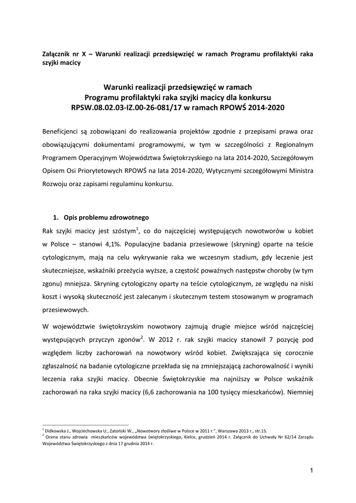 Załącznik nr X – Warunki realizacji przedsięwzięć w ramach Programu profilaktyki raka szyjki macicy Warunki realizacji przedsięwzięć w ramach Programu profilaktyki raka szyjki macicy dla konkursu RPSW.08.02.03-IZ.00-26-081/17 w ramach RPOWŚ 2014-2020 Beneficjenci są zobowiązani do realizowania projektów zgodnie z przepisami prawa oraz obowiązującymi dokumentami programowymi, w tym w szczególności z Regionalnym Programem Operacyjnym Województwa Świętokrzyskiego na lata 2014‐2020, Szczegółowym Opisem Osi Priorytetowych RPOWŚ na lata 2014-2020, Wytycznymi szczegółowymi Ministra Rozwoju oraz zapisami regulaminu konkursu. 1. Opis problemu zdrowotnego Rak szyjki macicy jest szóstym1, co do najczęściej występujących nowotworów u kobiet w Polsce – stanowi 4,1%. Populacyjne badania przesiewowe (skryning) oparte na teście cytologicznym, mają na celu wykrywanie raka we wczesnym stadium, gdy leczenie jest skuteczniejsze, wskaźniki przeżycia wyższe, a częstość poważnych następstw choroby (w tym zgonu) mniejsza. Skryning cytologiczny oparty na teście cytologicznym, ze względu na niski koszt i wysoką skuteczność jest zalecanym i skutecznym testem stosowanym w programach przesiewowych. W województwie świętokrzyskim nowotwory zajmują drugie miejsce wśród najczęściej występujących przyczyn zgonów2. W 2012 r. rak szyjki macicy stanowił 7 pozycję pod względem liczby zachorowań na nowotwory wśród kobiet. Zwiększająca się corocznie zgłaszalność na badanie cytologiczne przekłada się na zmniejszającą zachorowalność i wyniki leczenia raka szyjki macicy. Obecnie Świętokrzyskie ma najniższy w Polsce wskaźnik zachorowań na raka szyjki macicy (6,6 zachorowania na 100 tysięcy mieszkańców). Niemniej 1 Didkowska J., Wojciechowska U., Zatoński W., „Nowotwory złośliwe w Polsce w 2011 r.”, Warszawa 2013 r., str.15. Ocena stanu zdrowia mieszkańców województwa świętokrzyskiego, Kielce, grudzień 2014 r. Załącznik do Uchwały Nr 62/14 Zarządu Województwa Świętokrzyskiego z dnia 17 grudnia 2014 r. 2 1 jednak rocznie w regionie Świętokrzyskim stwierdza się 70 nowych zachorowań na ten nowotwór. Programy profilaktyczne przyczyniają się do wykrycia większej liczby nowotworów we wczesnych, dobrze rokujących stadiach zaawansowania. Główne czynniki ryzyka raka szyjki macicy: 1) infekcje wirusem brodawczaka ludzkiego o wysokim potencjale onkogennym (HR HPV), 2) wiek (zachorowalność zwiększa się wraz z wiekiem, szczyt zachorowań przypada pomiędzy 45 a 55 rokiem życia), 3) wczesne rozpoczęcie życia seksualnego, 4) duża liczba partnerów seksualnych, 5) duża liczba porodów, 6) niski status społeczny i ekonomiczny, 7) palenie papierosów, 8) stwierdzona wcześniej zmiana patologiczna w badaniu cytologicznym, 9) partnerzy seksualnie niemonogamiczni, z infekcją HPV (ryzyko zachorowania wzrasta 20-krotnie). Niezbędnym warunkiem efektywności skryningu cytologicznego jest jego długofalowe prowadzenie i masowość, szacuje się bowiem, że dopiero przy objęciu badaniami przesiewowymi 75% populacji można uzyskać 25% spadek umieralności. Badania naukowe dowodzą, iż 1,5%-2% rozmazów cytologicznych prezentuje nieprawidłowości wymagające dalszych procedur diagnostycznych. 2. Cel programu Celem realizacji programu jest zmniejszenie wskaźnika umieralności kobiet na raka szyjki macicy do poziomu osiągniętego w przodujących w tym zakresie krajach Unii Europejskiej w szczególności poprzez wykrywanie stanów przedrakowych oraz podniesienie poziomu wiedzy kobiet na temat profilaktyki i wprowadzenie na terenie całego kraju jednolitego modelu postępowania diagnostycznego. 2 3. Populacja, do której skierowany jest program Program skierowany jest do kobiet w wieku od 25 do 59 lat (przy określaniu wieku należy wziąć pod uwagę rok urodzenia). Badania będą przeprowadzane raz na 3 lata, a u kobiet obciążonych czynnikami ryzyka (zakażonych wirusem HIV przyjmujących leki immunosupresyjne, zakażonych HPV – typem wysokiego ryzyka) – co 12 miesięcy. Świadczeniobiorca leczony z powodu nowotworu złośliwego szyjki macicy po zakończeniu kontroli onkologicznej ponownie zostaje objęty skryningiem cytologicznym (decyzję podejmuje lekarz prowadzący leczenie onkologiczne). Kryteria wykluczające: 1) rozpoznanie nowotworu złośliwego szyjki macicy; 2) skierowane (poza programem) do dalszej diagnostyki lub leczenia, w przypadku rozpoznania nowotworu szyjki macicy lub innego schorzenia wymagającego leczenia specjalistycznego w zakresie onkologii. 4. Świadczenia zdrowotne w poszczególnych etapach realizacji programu Świadczeniodawca zobowiązany jest posiadać dostęp do internetu umożliwiający prowadzenie elektronicznej sprawozdawczości realizacji Programu w oparciu o narzędzie informatyczne udostępnione przez Narodowy Fundusz Zdrowia. Pobranie materiału do przesiewowego badania cytologicznego jest realizowane w ramach: a) ambulatoryjnej opieki specjalistycznej w zakresie położnictwa i ginekologii, jako porada z katalogu specjalistycznych świadczeń odrębnych, b) podstawowej opieki zdrowotnej przez położną POZ. Zasady pobierania wymazu opisane są w rozporządzeniu Ministra Zdrowia z dnia 6 listopada 2013 r. w sprawie świadczeń gwarantowanych z zakresu programów zdrowotnych oraz: a) w załączniku nr 5b do obowiązującego zarządzenia Prezesa Narodowego Funduszu Zdrowia w sprawie określenia warunków zawierania i realizacji umów w rodzaju ambulatoryjna opieka specjalistyczna, b) w rozdziale 6 obowiązującego zarządzenia Prezesa Narodowego Funduszu Zdrowia 3 w sprawie określenia warunków zawierania i realizacji umów o udzielanie świadczeń opieki zdrowotnej w zakresie podstawowej opieki zdrowotnej. Świadczeniodawca zobowiązany jest do zarejestrowania świadczeniobiorcy w systemie informatycznym udostępnionym przez Narodowy Fundusz Zdrowia nie później niż w dniu badania.