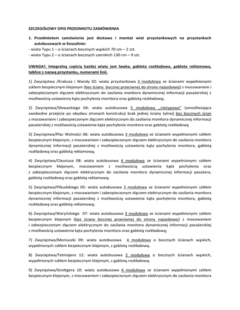 SZCZEGÓŁOWY OPIS PRZEDMIOTU ZAMÓWIENIA 1. Przedmiotem zamówienia jest dostawa i montaż wiat przystankowych na przystankach autobusowych w Koszalinie: - wiata Typu 1 – o ścianach bocznych wąskich 70 cm – 2 szt. - wiata Typu 2 – o ścianach bocznych szerokich 130 cm – 9 szt. UWAGA!: Integralną częścią każdej wiaty jest ławka, gablota rozkładowa, gablota reklamowa, tablice z nazwą przystanku, numerami linii. 1) Zwycięstwa /Krakusa i Wandy 02: wiata przystankowa 3 modułowa ze ścianami wypełnionymi szkłem bezpiecznym klejonym (bez ściany bocznej przeciwnej do strony najazdowej) z mocowaniem i zabezpieczonym złączem elektrycznym do zasilania monitora dynamicznej informacji pasażerskiej z możliwością ustawienia kąta pochylenia monitora oraz gablotą rozkładową; 2) Zwycięstwa/Słowackiego 04: wiata autobusowa 5 modułowa ,,nietypowa” (umożliwiająca swobodne przejście po obydwu stronach konstrukcji brak jednej ściany tylnej) bez bocznych ścian z mocowaniem i zabezpieczonym złączem elektrycznym do zasilania monitora dynamicznej informacji pasażerskiej z możliwością ustawienia kąta pochylenia monitora oraz gablotą rozkładową 3) Zwycięstwa/Plac Wolności 06: wiata autobusowa 3 modułowa ze ścianami wypełnionymi szkłem bezpiecznym klejonym, z mocowaniem i zabezpieczonym złączem elektrycznym do zasilania monitora dynamicznej informacji pasażerskiej z możliwością ustawienia kąta pochylenia monitora, gablotą rozkładową oraz gablotą reklamową; 4) Zwycięstwa/Clausiusa 08: wiata autobusowa 4 modułowa ze ścianami wypełnionymi szkłem bezpiecznym klejonym, mocowaniem z możliwością ustawienia kąta pochylenia oraz z zabezpieczonym złączem elektrycznym do zasilania monitora dynamicznej informacji pasażera, gablotą rozkładową oraz gablotą reklamową; 5) Zwycięstwa/Piłsudskiego 05: wiata autobusowa 3 modułowa ze ścianami wypełnionymi szkłem bezpiecznym klejonym, z mocowaniem i zabezpieczonym złączem elektrycznym do zasilania monitora dynamicznej informacji pasażerskiej z możliwością ustawienia kąta pochylenia monitora, gablotą rozkładową oraz gablotą reklamową; 6) Zwycięstwa/Waryńskiego 07: wiata autobusowa 3 modułowa ze ścianami wypełnionymi szkłem bezpiecznym klejonym (bez ściany bocznej przeciwnej do strony najazdowej) z mocowaniem i zabezpieczonym złączem elektrycznym do zasilania monitora dynamicznej informacji pasażerskiej z możliwością ustawienia kąta pochylenia monitora oraz gablotą rozkładową; 7) Zwycięstwa/Moniuszki 09: wiata autobusowa 4 modułowa o bocznych ścianach wąskich, wypełnionych szkłem bezpiecznym klejonym, z gablotą rozkładową. 8) Zwycięstwa/Tetmajera 12: wiata autobusowa 2 modułowa o bocznych ścianach wąskich, wypełnionych szkłem bezpiecznym klejonym, z gablotą rozkładową. 9) Zwycięstwa/Grottgera 10: wiata autobusowa 4 modułowa ze ścianami wypełnionymi szkłem bezpiecznym klejonym, z mocowaniem i zabezpieczonym złączem elektrycznym do zasilania monitora dynamicznej informacji pasażerskiej z możliwością ustawienia kąta pochylenia monitora, gablotą rozkładową oraz gablotą reklamową; 10) Stawisińskiego/Politechnika 04 : wiata autobusowa 3 modułowa ze ścianami wypełnionymi szkłem bezpiecznym klejonym, z mocowaniem i zabezpieczonym złączem elektrycznym do zasilania monitora dynamicznej informacji pasażerskiej z możliwością ustawienia kąta pochylenia monitora, gablotą rozkładową oraz gablotą reklamową; 11) Stawisińskiego/Racławicka 01: wiata autobusowa 4 modułowa ze ścianami wypełnionymi szkłem bezpiecznym klejonym, z mocowaniem i zabezpieczonym złączem elektrycznym do zasilania monitora dynamicznej informacji pasażerskiej z możliwością ustawienia kąta pochylenia monitora, gablotą rozkładową oraz gablotą reklamową; 2. Wiaty przystankowe – parametry techniczne: 1) Wiaty przystankowe, o których mowa w ust. 1, mają być wykonane z zamkniętych profili stalowych ze stali ocynkowanej ogniowo o przekroju kwadratu o wym. zbliżonych do wym. 50x50x3 mm i prostokąta – słupki nośne o wym. zbliżonych do wym. 75x50x3 mm (uzyskanie odpowiedniej wytrzymałości konstrukcji), umożliwiające tworzenie wiat o różnych długościach malowanych proszkowo na kolor szary RAL 7045 farbą do stosowania zewnętrznego, projekty wiat kształtem mają być wzorowane na rysunku poglądowym i wizualizacji załączonymi do SIWZ. 2) Konstrukcja wiaty segmentowa (złożona z pojedynczych segmentów o dł. pojedynczego segmentu ok 1,30 m (+/- 5%), z których można tworzyć przystanki dłuższe o kolejne segmenty) zaprojektowana pod kątem obciążeń w sposób umożliwiający zamontowanie monitora systemu dynamicznej informacji pasażera (mocowanie o udźwigu zbliżonym do wartości 100 kg z możliwością ustawienia kąta pochylenia oraz z zabezpieczonym złączem elektrycznym do zasilania monitora). 3) Głębokość wiat tj. ścianka boczna zbliżona do wymiarów - 1,30 m dla ścian bocznych szerokich i 0,70 m dla ścian bocznych wąskich (w zależności od lokalizacji wiat w przypadku braku ścian bocznych brak poprzeczek poziomych). 4) Wysokość mierzona od poziomu platformy (poziomu terenu) do dolnej krawędzi zadaszenia wiat min. 220 cm. 5) Dachy wiat mają mieć kształt wzorowany na rysunku poglądowym załączonym do SIWZ: a) mają być pokryte materiałem nieprzezroczystym o grubości zbliżonej do 10 mm (rodzaj materiału w uzgodnieniu z Zamawiającym), b) konstrukcja dachu wiat płaska nachylona pod kątem (spadek na ścianę tylną zbliżony do o 5 ) o głębokości 1,80 m należy wyposażyć w rynny o spadku zabezpieczającym swobodny odpływ wody poza tylną część wiaty, c) konstrukcja wiat powinna skutecznie chronić pasażerów przed opadami atmosferycznymi (deszcz, śnieg), przed nadmiernym nagrzewaniem przez słońce i przed wiatrem, zapewniając jednocześnie warunki do przewietrzenia oraz odpływu wody op