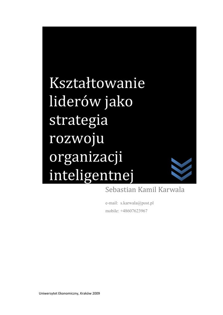 Kształtowanie liderów jako strategia rozwoju organizacji inteligentnej Sebastian Kamil Karwala e-mail: [email protected] mobile: +48607623967 Uniwersytet Ekonomiczny, Kraków 2009 1 Spis treści Wstęp .......................................................................................................................................3 Rozdział 1. Rozwój organizacji w gospodarce opartej na wiedzy ..................................... 5 1.1. Wyzwania stojące przed organizacjami w dobie XXI wieku ....................................... 6 1.2. Organizacje inteligentne w gospodarce opartej na wiedzy .......................................... 13 1.3. Filary sukcesu organizacji inteligentnej ...................................................................... 19 1.4. Zarządzanie kapitałem intelektualnym w organizacji inteligentnej ............................. 26 Rozdział 2. Kapitał ludzki w zarządzaniu organizacją inteligentną ............................... 32 2.1. Zarządzanie zasobami ludzkimi w czasach niepewności ............................................ 33 2.2. Kapitalizacja potencjału ludzkiego .............................................................................. 39 2.3. Rola i znaczenie kompetencji w organizacji................................................................ 44 2.4. Oddziaływanie przywództwa na uczestników organizacji .......................................... 51 Rozdział 3. Lider w kontekście zarządzania organizacją ................................................. 57 3.1. Efektywny i skuteczny lider w zarządzaniu organizacją ..............................................58 3.2. Kształtowanie liderów – znaczenie, korzyści i zalecenia .............................................66 3.3. Mentoring, ocena 360° oraz inne strategie i metody wspierające kształtowanie liderów ...................................................................................................72 3.4. Programy kształtowania liderów – przykłady ..............................................................81 Rozdział 4. Kształtowanie liderów w praktyce .................................................................. 87 4.1. Przywództwo w McKinsey&Company oraz charakterystyka programu McKinsey Leadership Seminar.....................................................................................88 4.2. Zakres badań – cele, hipoteza i metoda badawcza .......................................................93 4.3. Analiza wyników badań oraz wnioski ..........................................................................96 4.4. Strategia kształtowania liderów – propozycja implementacji ....................................110 Zakończenie .........................................................................................................................116 Bibliografia .......................................................................................................................... 118 Publikacje zwarte ..................................................................................................................118 Artykuły ................................................................................................................................120 Źródła internetowe ................................................................................................................121 Inne źródła ............................................................................................................................123 Spis rysunków i tabel ............................................................................................................123 Spis wykresów ......................................................................................................................124 Załączniki............................................................................................................................. 125 2 Wstęp We współczesnym świecie obserwujemy wzrost znaczenia kapitału intelektualnego. Przewartościowanie zasobów gospodarki stanowi nowe wyzwanie dla organizacji, które również coraz częściej dostrzegają konieczność poszukiwania nowych rozwiązań. Dynamicznie zmieniające się otoczenie promuje osoby innowacyjne, przedsiębiorcze i oddziałujące na innych – to właśnie one, liderzy, stanowią obecnie najsilniejszą kartę każdej organizacji. Zagadnienie kształtowania liderów wydaje się niezwykle ważne i aktualne, a jego kompleksowość i wielowymiarowość wymuszają pogłębioną analizę czynników skuteczności programów rozwijających kompetencje przywódcze. W pierwszym rozdziale zarysowano podstawowe problemy współczesnych organizacji, ze szczególnym uwzględnieniem zagadnienia zarządzania kapitałem intelektualnym. Omówiono nowe wyzwania, trudności oraz możliwości, jakie niesie ze sobą gospodarka oparta na wiedzy, a także wyróżniono najważniejsze cechy efektywnej organizacji inteligentnej. Rozdział drugi jest przybliżeniem tematyki kapitału intelektualnego w organizacji uczącej się. Wyjaśnia ogromne znaczenie zarządzania zasobami ludzkimi, a także wskazuje na podstawowe założenia teorii zarządzania kapitałem intelektualnym. Poddano w nim analizie również elementy, które stymulują kapitalizację potencjału pracowników i powinny zostać uwzględnione w organizacjach. Wiele uwagi poświęcono zagadnieniu kompetencji osobistych i społecznych, które mogą dynamizować rozwój jednostek i organizacji, a także zarysowano problematykę oddziaływania przywództwa na uczestników organizacji. W rozdziale trzecim skupiono się na osobie lidera oraz metodach kształtowania liderów. Zidentyfikowano podstawowe kompetencje, które przekładają się na efektywność lidera w organizacji. Przytoczono również podstawowe założenia teoretyczne i modele kształtowania liderów. Rozdział zakończono przykładowymi modelami takich pr