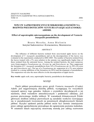 ZESZYTY NAUKOWE INSTYTUTU SADOWNICTWA I KWIACIARSTWA TOM 14 2006 WPŁYW SAPROTROFICZNYCH MIKROORGANIZMÓW NA ROZWÓJ PSEUDOTECJÓW VENTURIA INAEQUALIS (COOKE) ADERH. Effect of saprotrophic microorganisms on the development of Venturia inaequalis pseudothecia Beata Meszka, Anna Bielenin Instytut Sadownictwa i Kwiaciarstwa, Skierniewice ABSTRACT The influence of different bacteria isolated from urea-treated apple leaves on the development of V. inaequalis pseudothecia and on the decomposition of the leaves was evaluated in the experiments conducted in 2004-2005. The number of bacteria isolated from the leaves treated with a 5% urea solution in the autumn was significantly higher than of those isolated from the untreated leaves. Among the isolated bacteria, the most numerous were Gram-negative Pseudomonas sp., Erwinia sp. and Enterobacter sp. They suppressed the formation of V. inaequalis pseudothecia from 14% (Pseudomonas sp.) to 38% (Erwinia sp. and Enterobacter sp.). The use of a Pseudomonas sp. suspension in a 5% urea solution resulted in a strong inhibition of the formation (in 99%) and development of pseudothecia. The suspension was also the most effective in the decomposition of apple leaves. Key words: apple scab, urea, saprotrophic bacteria, pseudothecia development WSTĘP Parch jabł oni powodowany przez grzyb Venturia inaequalis (Cooke) Aderh. jest najgroźniejsząchorobąjabł oni, wystę pują cąwe wszystkich rejonach uprawy tego gatunku. Jednym z czynników decydują cych o jej nasileniu, obok warunków atmosferycznych i podatnoś ci odmiany, jest poziom pierwotnego ź ródł a infekcji. W warunkach klimatycznych Polski gł ównym ź ródł em infekcji pierwotnych sązarodniki workowe rozwijają ce sięw pseudotecjach tworzonych na poraż onych ubiegł orocznych liś ciach jabł oni. Ryzyko epidemii parcha jabł oni moż e byćistotnie zmniejszone przez zabiegi agrotechniczne prowadzą ce do ograniczenia poziomu inokulum. W ostatnich latach najczę ś ciej stosowanąmetodąjest zabieg roztworem Zeszyty Naukowe Instytutu Sadownictwa i Kwiaciarstwa, tom 14 mocznika wykonywany jesienią , w okresie opadania liś ci (Meszka i Bielenin 2001; Margraf i in. 1972; Gupta i Lele 1980; Montealegre i Gonzales 1983). Zabieg ten na traktowanych liś ciach jabł oni stymuluje rozwój mikroorganizmów, przede wszystkim bakterii. Celem pracy był a ocena zmian zachodzą cych w populacji bakterii zasiedlają cych opadł e liś cie jabł oni po zabiegu roztworem mocznika oraz zbadanie wpł ywu bakterii najczęś ciej izolowanych z liś ci traktowanych mocznikiem na formowanie i dojrzewanie pseudotecjów V. inaequalis, a takż e na dekompozycjęliś ci. MATERIAŁI METODY Doś wiadczenie przeprowadzono w latach 2004-2005 w Sadzie Doś wiadczalnym Instytutu Sadownictwa i Kwiaciarstwa w Dąbrowicach na liś ciach jabł oni odmiany ‘McIntosh’. Z liś ci nietraktowanych i traktowanych jesienią 5% roztworem mocznika izolowano bakterie i liczono uzyskane kolonie na pożywkach mikrobiologicznych. Bakterie identyfikowano uwzględniają c ich cechy fizjologiczne i biochemiczne. Badania taksonomiczne przeprowadzono na podstawie powszechnie stosowanych w tego typu pracach testach, które obejmował y: Testy podstawowe 1. Barwienie Grama (wg Manual of Microbiological Methods 1957, za Sobiczewskim 1998). 2. Występowanie fluorescencji (King i in. 1954). Testy LOPAT – na podstawie schematu Lelliott i innych 1966 1. Obecnoś ćoksydaz (Kovacs 1956). 2. Aktywnoś ćpektolityczna – zgnilizna na ziemniaku (Lelliott i in. 1966). 3. Obecnoś ćdihydrolazy argininy (Thornley 1960). 4. Redukcja azotanów (Kiraly i in. 1977). 5. Produkcja kwasu z glukozy (Hugh i Leifson 1953). Po wykonaniu wszystkich testów, identyfikacjębakterii przeprowadzono wg klucza Bradbury’ego (1988). Oceniono takż e wpł yw najczę ś ciej występują cych bakterii z rodzajów: Pseudomonas, Enterobacter i Erwinia na rozwój i dynamikędojrzewania owocników V. inaequalis. W tym celu zebrane jesieniąliś cie jabł oni odmiany ‘McIntosh’, silnie poraż one przez V. inaequalis, moczono przez 20 Wpł yw saprotroficznych mikroorganizmów na rozwój pseudotecjów… minut (28 października 2004) w wodnych zawiesinach testowanych bakterii oraz w 5% roztworze mocznika i zawiesinie bakterii Pseudomonas. Liś cie kontrolne moczono w wodzie. Każda kombinacja obejmował a 400 liś ci (po 100 liś ci w 4 powtórzeniach). Zawiesiny bakterii sporządzano zmywają c 24-godzinne kolonie bakterii z poż ywki agarowej (z pięciu skosów) 100 ml wody. Nastę pnie zawiesinęuzupeł niono wodąlub roztworem mocznika do obję toś ci 500 ml, ustalają c gę stoś ćzawiesiny za pomocąpomiaru transmitancji na 82%. Ponadto w celu dokł adnego okreś lenia liczby bakterii, w uż ywanych do badań zawiesinach, zastosowano metodęrozcieńczeń i posiewów pł ytkowych na poż ywkęagarową, zawierają cą2,5% agaru (Difco Nutrient Agar) z dodatkiem 5% sacharozy. Po 2 dobach inkubacji w temperaturze 25°C liczono kolonie bakteryjne i oznaczano ich liczbęw 1 ml zawiesiny. Wynosił a ona od 12 x 109 do 19 x 109 bakterii/ml zawiesiny. Potraktowane liś cie umieszczano w siatkach i pozostawiano na powierzchni gleby pod koronami drzew. Badania nad rozwojem pseudotecjów rozpoczynano okoł o poł owy marca, gdy w owocnikach zaczynałsięproces formowania worków. Próby losowe, po 10 liś ci z każ dego powtórzenia, pobierano bezpoś rednio z sadu, co 7 dni. Pod binokularem na każ dym liś ciu okreś lano liczbęwytworzonych owocników na 1 cm2 powierzchni plamy parcha, w czterech powtórzeniach. Nastę pnie z każdego liś cia, z róż nych plam parcha, preparowano po 10 owocników i umieszczano je na szkieł ku podstawowym w kropli wody. Po rozgnieceniu oznaczano stadium rozwojowe każdego z nich, używają c mikroskopu ś wietlnego przy 150-krotnym powiększeniu. W każ dym terminie oceniano rozwój 100 owocników pobranych z 10 liś ci w kombinacji. D