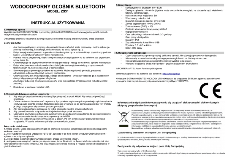 WODOODPORNY GŁOŚNIK BLUETOOTH MODEL: ZS31 INSTRUKCJA UŻYTKOWANIA 1. Informacje ogólne Wysokiej jakości WODOODPORNY i przenośny głośnik BLUETOOTH umożliwi w wygodny sposób odsłuch muzyki w każdym miejscu i czasie. Odtwarzacz-głośnik w eleganckiej zwartej obudowie odtwarza muzykę z telefonu/tabletu przez Bluetooth. Cechy produktu: • • • • • • • • • Jest bardzo praktyczny, poręczny, do postawienia na szafkę lub stolik, przenośny - można zabrać go ze sobą (na imprezę, na wakacje, do samochodu, do biura, ogrodu itp...). Dzięki swojej wodoodporności z głośnika można korzystać np. w łazience biorąc prysznic czy podczas kąpieli. Doskonały na wakacyjny pobyt nad jeziorem. Posiada mocną przyssawkę, dzięki której możesz przyczepić głośnik np do kafelków pod prysznicem, szyby, lustra itp. Charakteryzuje się czystym brzmieniem i dużą głośnością - nadaję się na biwak, ognisko lub na plażę. Dzięki wbudowanemu mikrofonowi może działać jako zestaw głośnomówiący przy rozmowach telefonicznych np. konferencjach lub w samochodzie. Sterowany jest za pomocą przycisków na obudowie. Można regulować głośność, pauzować odtwarzanie, odbierać i kończyć rozmowy telefoniczne. Głośnik zasilany jest z wewnętrznego, stałego akumulatorka - wystarczy ładować go 2-3 godziny by cieszyć się grającą muzyką przez długi czas. Akumulator ładuje się z komputerowego portu USB lub zasilacza 5V (zasilacz nie wchodzi w skład zestawu). Dodatkowo w zestawie: kabelek USB. 2. Wskazówki dotyczące obsługi urządzenia 1. Aby włączyć urządzenie należy nacisnąć i przytrzymać przycisk kłódki. Aby wyłączyć powtórzyć procedurę. 2. Odtwarzaniem można sterować za pomocą 3 przycisków usytuowanych w przedniej części urządzenia (do tyłu/pauza-stop/do przodu). Regulację głośności wykonuje się za pomocą przycisków < i > (należy je długo przytrzymać aby zmienić poziom głośności). 3. Aby odebrać/zakończyć połączenie (w trybie bluetooth) naciśnij przycisk słuchawki. 4. Aby ponowić ostatnie połączenie naciśnij dwukrotnie przycisk słuchawki. 5. Ładowanie akumulatora odbywa się automatycznie po podłączeniu urządzenia do ładowarki sieciowej (brak w zestawie) lub do komputera za pomocą kabla USB. 6. Pełny cykl ładowania powinien trwać około 2 godzin. Po tym okresie należy przerwać ładowanie urządzenia. W czasie ładowania pali się czerwona dioda „status”. Połączenie z telefonem: 1. Włącz głośnik. Dioda status zacznie migać na czerwono-niebiesko. Włącz łączność Bluetooth i rozpocznij szukanie urządzeń. 2. Jeśli Twój telefon znajdzie urządzenie “BTS-06”, oznacza to że Twój telefon wyszukał Głośnik Bluetooth – wybierz oraz połącz urządzenie. 3. Jeśli podczas łączenia będzie wymagane hasło, proszę wprowadzić „0000”. 4. Jeśli połączenie urządzeń zakończyło się sukcesem, ikona Bluetooth na Twoim telefonie zmieni kształt i/lub kolor (zależnie od systemu i modelu). Od teraz możesz odtwarzać muzykę z Twojego telefonu bezpośrednio w głośniku bluetooth.. 3. Specyfikacja • Kompatybilność: Bluetooth 3.0 + EDR • Zasięg urządzenia: 10 metrów (dystans może ulec zmianie ze względu na otoczenie bądź właściwości telefonu komórkowego). • Maksymalna moc wyjściowa: 3W • Wbudowany mikrofon: tak • Stosunek sygnału do szumu: S/N: ≥ 75dB • Zakres częstotliwości: 100Hz-20KHz • Zniekształcenia (THD): ≤ 1% • Zasilanie: akumulator litowo-jonowy 400mA • Napięcie ładowania: 5V • Czas całkowitego ładowania baterii: 2-3 godziny • Czas pracy: do 6 godzin • Klasa IP: IPx4 • Złącze ładowania: kabel Micro USB • Wymiary: 8,5 x 8,5 x 4,8cm • Kolor: żółto-szary 4. Uwagi i środki ostrożności • Czyść urządzenie za pomocą suchej, delikatnej szmatki. Nie używaj agresywnych detergentów. • Nie ustawiaj w urządzeniu maksymalnego poziomu głośności na dłuższy okres czasu. • Nie narażaj urządzenia na ekstremalnie niskie i wysokie temperatury. • Nie ładuj urządzenia dłużej niż 5 godzin – grozi uszkodzeniem akumulatora. IMPORTER: APTEL Adam Pawlak spółka jawna deklaracja zgodności do pobrania pod adresem: http://www.aptel.pl Niniejszym BOTHWINNER TECHNOLOGY LTD oświadcza, że urządzenie ZS31 jest zgodne z zasadniczymi wymogami oraz innymi stosownymi postanowieniami dyrektywy 1999/5/WE.
