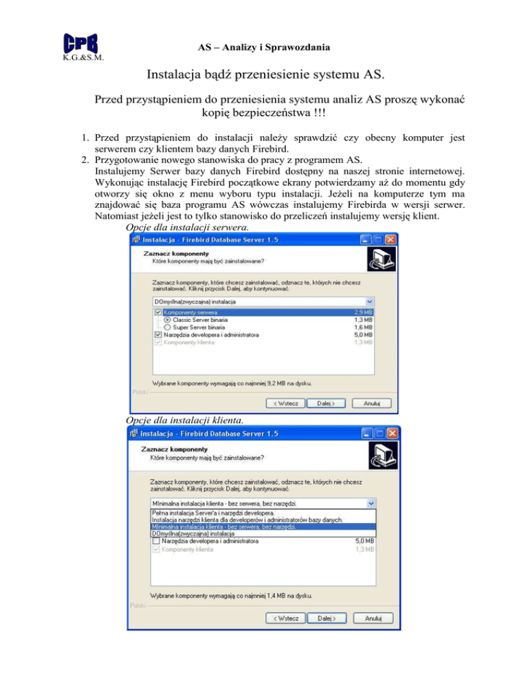 AS – Analizy i Sprawozdania K.G.&S.M. Instalacja bądź przeniesienie systemu AS. Przed przystąpieniem do przeniesienia systemu analiz AS proszę wykonać kopię bezpieczeństwa !!! 1. Przed przystąpieniem do instalacji naleŜy sprawdzić czy obecny komputer jest serwerem czy klientem bazy danych Firebird. 2. Przygotowanie nowego stanowiska do pracy z programem AS. Instalujemy Serwer bazy danych Firebird dostępny na naszej stronie internetowej. Wykonując instalację Firebird początkowe ekrany potwierdzamy aŜ do momentu gdy otworzy się okno z menu wyboru typu instalacji. JeŜeli na komputerze tym ma znajdować się baza programu AS wówczas instalujemy Firebirda w wersji serwer. Natomiast jeŜeli jest to tylko stanowisko do przeliczeń instalujemy wersję klient. Opcje dla instalacji serwera. Opcje dla instalacji klienta. AS – Analizy i Sprawozdania K.G.&S.M. 3. Dodanie plików do Firebirda Po zainstalowaniu Firebirda naleŜy dodać pliki do katalogu UDF w katalogu Firebirda. Pliki te znajdują się w spakowanym pliku o nazwie UDF na naszej stronie. 4. Udostępnienie połączenia dla serwera bazy danych. Wchodzimy na pasek Start - Panel Sterowania – Zapora systemu Windows Udostępniamy port 3050. JeŜeli na stanowisku zainstalowany jest dodatkowy Firewall w nim równieŜ naleŜy udostępnić port 3050. 5. JeŜeli przenoszony jest program AS z innego komputera wówczas kopiujemy cały katalog „AS” z „Program Files” i wklejamy go na nowym komputerze w tym samym miejscu. RównieŜ z pulpitu naleŜy skopiować i przenieść skróty na nowe stanowisko. JeŜeli stanowisko to ma być serwerem udostępniamy cały katalog „AS”.