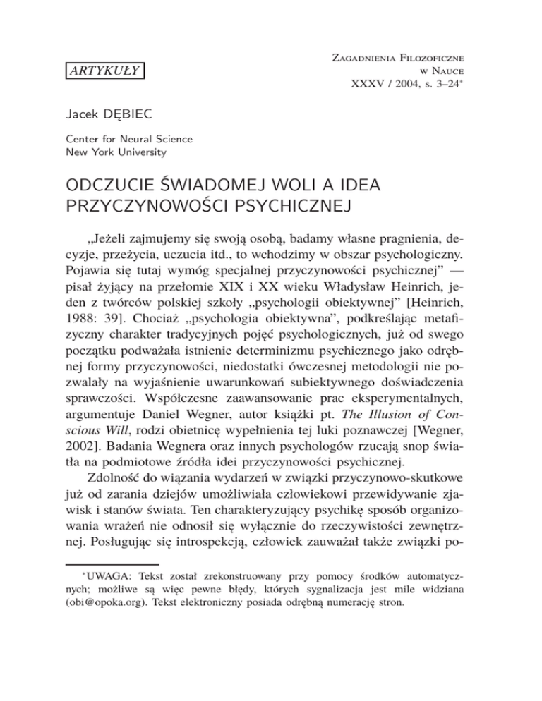 ARTYKUŁY Zagadnienia Filozoficzne w Nauce XXXV / 2004, s. 3–24∗ Jacek DĘBIEC Center for Neural Science New York University ODCZUCIE ŚWIADOMEJ WOLI A IDEA PRZYCZYNOWOŚCI PSYCHICZNEJ „Jeżeli zajmujemy się swoją osobą, badamy własne pragnienia, decyzje, przeżycia, uczucia itd., to wchodzimy w obszar psychologiczny. Pojawia się tutaj wymóg specjalnej przyczynowości psychicznej” — pisał żyjący na przełomie XIX i XX wieku Władysław Heinrich, jeden z twórców polskiej szkoły „psychologii obiektywnej” [Heinrich, 1988: 39]. Chociaż „psychologia obiektywna”, podkreślając metafizyczny charakter tradycyjnych pojęć psychologicznych, już od swego początku podważała istnienie determinizmu psychicznego jako odrębnej formy przyczynowości, niedostatki ówczesnej metodologii nie pozwalały na wyjaśnienie uwarunkowań subiektywnego doświadczenia sprawczości. Współczesne zaawansowanie prac eksperymentalnych, argumentuje Daniel Wegner, autor książki pt. The Illusion of Conscious Will, rodzi obietnicę wypełnienia tej luki poznawczej [Wegner, 2002]. Badania Wegnera oraz innych psychologów rzucają snop światła na podmiotowe źródła idei przyczynowości psychicznej. Zdolność do wiązania wydarzeń w związki przyczynowo-skutkowe już od zarania dziejów umożliwiała człowiekowi przewidywanie zjawisk i stanów świata. Ten charakteryzujący psychikę sposób organizowania wrażeń nie odnosił się wyłącznie do rzeczywistości zewnętrznej. Posługując się introspekcją, człowiek zauważał także związki po∗ UWAGA: Tekst został zrekonstruowany przy pomocy środków automatycznych; możliwe są więc pewne błędy, których sygnalizacja jest mile widziana ([email protected]). Tekst elektroniczny posiada odrębną numerację stron. 2 Jacek DĘBIEC między doświadczanymi stanami umysłu a zachowaniem swego ciała w otaczającym świecie. O ile dostrzegane w zewnętrznej rzeczywistości przyczyny i skutki cechują się „jednakową naturą” (kategoryzowane są jako zjawiska zewnętrznego świata), o tyle relacje przyczynowe, w które zaangażowane jest ludzkie „ja” mają już bardziej złożony charakter. Przyczynowość w odniesieniu do subiektywnego doświadczenia może dotyczyć wyłącznie treści wewnątrzpsychicznych, jak emocje i myśli (np. radość powoduje optymistyczne myśli). Skutkami umysłowych (wewnętrznych) przyczyn mogą być także wydarzenia zewnętrznego świata (np. chęć podniesienia dłoni powoduje ruch tego fizycznego obiektu), albo odwrotnie, zewnętrzne przyczyny mogą powodować określone wewnątrzpsychiczne następstwa (np. niekorzystna zmiana pogody może rodzić uczucie smutku i przygnębienia). Doświadczenie „ja” sprawia, iż równolegle do wydarzeń zachodzących w otaczającej rzeczywistości, pojawiają się zdarzenia wewnętrzne, umysłowe. Ich obecność skłania do wyróżnienia przyczynowości psychicznej jako odrębnej i niezależnej kategorii przyczynowości. Rozwój wiedzy wynikający z ewolucji metod nauki spowodował zmianę rozumienia determinizmu. Współcześnie, porządkując wydarzenia zewnętrznego świata, zamiast określania ciągów przyczynowoskutkowych, poszukuje się raczej występujących między zjawiskami praw, czyli stałych związków. Ta reguła odnosi się w większym stopniu do dyscyplin o ustalonej metodologii. Dziedziny, w których za podstawę wiedzy służy introspekcja, w dużej mierze wciąż jeszcze posługują się terminologią właściwą wewnątrzpsychicznym przeżyciom, a także, na co zwracał uwagę Heinrich i inni pionierzy psychologii doświadczalnej, w nieuprawniony sposób posługują się pojęciami metafizycznymi tłumacząc obserwowalne zjawiska. Takie okoliczności w pewnym sensie usprawiedliwiają powszechną akceptację koncepcji przyczynowości psychicznej. Subiektywne doświadczenie woli pozostawia przecież w nas wrażenie, że uświadomione treści mogą zarówno powodować określone stany psychiczne, jak i wywoływać różne formy zachowania. Ten typ poznania przyczynowości psychicznej ma jednak ODCZUCIE ŚWIADOMEJ WOLI A IDEA... 3 bardzo ograniczony charakter. Nie wykracza poza subiektywne doznanie. Krytyka doświadczenia woli jako źródła wiedzy o przyczynowości psychicznej, obecna w pracach pierwszych psychologów eksperymentalnych, a także i wcześniej, wraz z rozwojem metod badawczych podparta została empirycznymi argumentami. Szczególny postęp w badaniu uwarunkowań odczucia woli nastąpił u schyłku dwudziestego stulecia. Jeden z czołowych współczesnych krytyków koncepcji wolnej woli, Daniel Dennett stwierdził wręcz, że „problem wolnej woli w dużej mierze może być artefaktem, wynikającym z przyjętych metod badawczych” [Dennet: 1999, 17]. Bez względu na to, czy Dennett ma rację, otwartym pozostaje pytanie o mechanizmy psychiczne powodujące wrażenie, że myśl może mieć siłę sprawczą. Jakie są związki między sferą poznawczą a wolą? A jeżeli, jak chce Dennett, problem wolnej woli jest jedynie „artefaktem”, to jakie ten „artefakt” pełni funkcje, które mogłyby uzasadnić jego tak powszechne występowanie? 2. REFLEKSJA NAD RELACJAMI POMIĘDZY POZNANIEM A DZIAŁANIEM W KONTEKŚCIE HISTORYCZNYM Rozważania nad związkami pomiędzy funkcjami poznawczymi ludzkiej psychiki a wolą i wolnością obecne były w kulturze europejskiej już od zarania. Problemy determinizmu moralnego oraz indywidualnej odpowiedzialności, jak podkreśla w książce pt. Free Will: a historical and philosophical introduction jej autor, Ilham Dilman, przenikają karty najstarszych dzieł literatury greckiej [Dilman, 1999]. Bohaterowie Homerowej Iliady po podjęciu decyzji o uczestnictwie w wojnie trojańskiej, poddani zostają żądzy niszczenia innych i ostatecznie popadają „w niekończący się cykl działania i przeciwdziałania” [tamże: 12-13]. Opisany przez Sofoklesa tragiczny los Edypa ukazuje bez