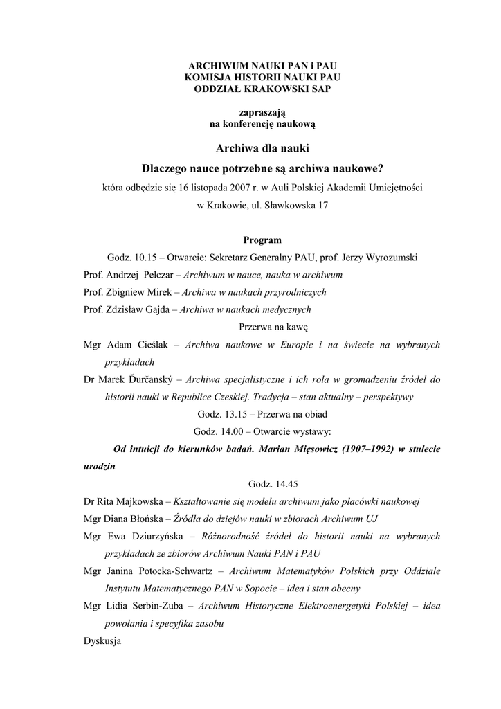 ARCHIWUM NAUKI PAN i PAU KOMISJA HISTORII NAUKI PAU ODDZIAŁ KRAKOWSKI SAP zapraszają na konferencję naukową Archiwa dla nauki Dlaczego nauce potrzebne są archiwa naukowe? która odbędzie się 16 listopada 2007 r. w Auli Polskiej Akademii Umiejętności w Krakowie, ul. Sławkowska 17 Program Godz. 10.15 – Otwarcie: Sekretarz Generalny PAU, prof. Jerzy Wyrozumski Prof. Andrzej Pelczar – Archiwum w nauce, nauka w archiwum Prof. Zbigniew Mirek – Archiwa w naukach przyrodniczych Prof. Zdzisław Gajda – Archiwa w naukach medycznych Przerwa na kawę Mgr Adam Cieślak – Archiwa naukowe w Europie i na świecie na wybranych przykładach Dr Marek Ďurčanský – Archiwa specjalistyczne i ich rola w gromadzeniu źródeł do historii nauki w Republice Czeskiej. Tradycja – stan aktualny – perspektywy Godz. 13.15 – Przerwa na obiad Godz. 14.00 – Otwarcie wystawy: Od intuicji do kierunków badań. Marian Mięsowicz (1907–1992) w stulecie urodzin Godz. 14.45 Dr Rita Majkowska – Kształtowanie się modelu archiwum jako placówki naukowej Mgr Diana Błońska – Źródła do dziejów nauki w zbiorach Archiwum UJ Mgr Ewa Dziurzyńska – Różnorodność źródeł do historii nauki na wybranych przykładach ze zbiorów Archiwum Nauki PAN i PAU Mgr Janina Potocka-Schwartz – Archiwum Matematyków Polskich przy Oddziale Instytutu Matematycznego PAN w Sopocie – idea i stan obecny Mgr Lidia Serbin-Zuba – Archiwum Historyczne Elektroenergetyki Polskiej – idea powołania i specyfika zasobu Dyskusja