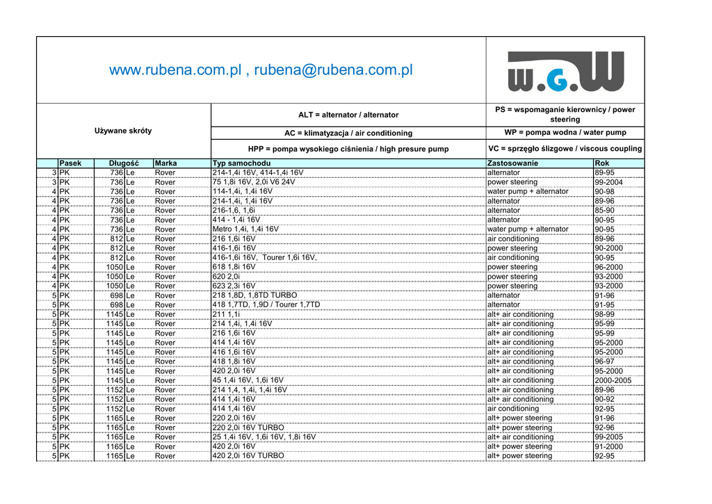 www.rubena.com.pl , [email protected] Używane skróty 3 3 4 4 4 4 4 4 4 4 4 4 4 5 5 5 5 5 5 5 5 5 5 5 5 5 5 5 5 5 5 Pasek PK PK PK PK PK PK PK PK PK PK PK PK PK PK PK PK PK PK PK PK PK PK PK PK PK PK PK PK PK PK PK Długość 736 Le 736 Le 736 Le 736 Le 736 Le 736 Le 736 Le 812 Le 812 Le 812 Le 1050 Le 1050 Le 1050 Le 698 Le 698 Le 1145 Le 1145 Le 1145 Le 1145 Le 1145 Le 1145 Le 1145 Le 1145 Le 1152 Le 1152 Le 1152 Le 1165 Le 1165 Le 1165 Le 1165 Le 1165 Le Marka Rover Rover Rover Rover Rover Rover Rover Rover Rover Rover Rover Rover Rover Rover Rover Rover Rover Rover Rover Rover Rover Rover Rover Rover Rover Rover Rover Rover Rover Rover Rover ALT = alternator / alternator PS = wspomaganie kierownicy / power steering AC = klimatyzacja / air conditioning WP = pompa wodna / water pump HPP = pompa wysokiego ciśnienia / high presure pump VC = sprzęgło ślizgowe / viscous coupling Typ samochodu 214-1,4i 16V, 414-1,4i 16V 75 1,8i 16V, 2,0i V6 24V 114-1,4i, 1,4i 16V 214-1,4i, 1,4i 16V 216-1,6, 1,6i 414 - 1,4i 16V Metro 1,4i, 1,4i 16V 216 1,6i 16V 416-1,6i 16V 416-1,6i 16V, Tourer 1,6i 16V, 618 1,8i 16V 620 2,0i 623 2,3i 16V 218 1,8D, 1,8TD TURBO 418 1,7TD, 1,9D / Tourer 1,7TD 211 1,1i 214 1,4i, 1,4i 16V 216 1,6i 16V 414 1,4i 16V 416 1,6i 16V 418 1,8i 16V 420 2,0i 16V 45 1,4i 16V, 1,6i 16V 214 1,4, 1,4i, 1,4i 16V 414 1,4i 16V 414 1,4i 16V 220 2,0i 16V 220 2,0i 16V TURBO 25 1,4i 16V, 1,6i 16V, 1,8i 16V 420 2,0i 16V 420 2,0i 16V TURBO Zastosowanie alternator power steering water pump + alternator alternator alternator alternator water pump + alternator air conditioning power steering air conditioning power steering power steering power steering alternator alternator alt+ air conditioning alt+ air conditioning alt+ air conditioning alt+ air conditioning alt+ air conditioning alt+ air conditioning alt+ air conditioning alt+ air conditioning alt+ air conditioning alt+ air conditioning air conditioning alt+ power steering alt+ power steering alt+ air conditioning alt+ power steering alt+ power steering Rok 89-95 99-2004 90-98 89-96 85-90 90-95 90-95 89-96 90-2000 90-95 96-2000 93-2000 93-2000 91-96 91-95 98-99 95-99 95-99 95-2000 95-2000 96-97 95-2000 2000-2005 89-96 90-92 92-95 91-96 92-96 99-2005 91-2000 92-95 5 5 5 5 5 5 5 6 6 PK PK PK PK PK PK PK PK PK 1165 1165 1165 1165 1165 1165 1165 1180 1180 Le Le Le Le Le Le Le Le Le Rover Rover Rover Rover Rover Rover Rover Rover Rover 420 TOURER 2,0i 16V 45 1,8i 16V 820 2,0i 16V 820 2,0i 16V TURBO Cabriolet 1,6i 16V Coupé 1,6i 16V, 1,8i VVC 16V Streetwise 1,4i 16V 220 2,0TD 420 2,0TD alt+ power steering alt+ air conditioning alt+ power steering alt+ power steering alt+ air conditioning alt+ air conditioning alt+ air conditioning alternator alt+ power steering 94-95 2000-2005 91-98 91-99 96-99 96-99 2003-2005 95-99 95-00 AVX10 AVX10 AVX10 AVX10 AVX10 AVX10 1075 825 825 813 750 750 La La La La La La Rover Rover Rover Rover Rover Rover 800 827 24V, 827 24V I/SI/KAT, 827 SI/Sterling, 827 Vitesse Mini MK I 1000 Mini MK I 1300 Mini MK I 1300 (automat) Montego 2,0GTi Montego 2,0GTi/LXi power steering alternator alternator alternator power steering power steering 88-99 92-93 919288-91 90-93