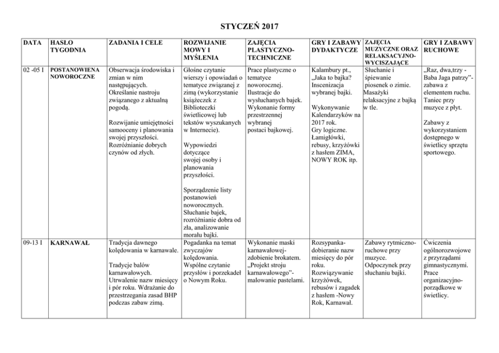 STYCZEŃ 2017 DATA HASŁO TYGODNIA 02 -05 I POSTANOWIENA NOWOROCZNE ZADANIA I CELE Obserwacja środowiska i zmian w nim następujących. Określanie nastroju związanego z aktualną pogodą. Rozwijanie umiejętności samooceny i planowania swojej przyszłości. Rozróżnianie dobrych czynów od złych. 09-13 I KARNAWAŁ ROZWIJANIE MOWY I MYŚLENIA ZAJĘCIA PLASTYCZNOTECHNICZNE GRY I ZABAWY ZAJĘCIA GRY I ZABAWY MUZYCZNE ORAZ DYDAKTYCZE RUCHOWE Głośne czytanie wierszy i opowiadań o tematyce związanej z zimą (wykorzystanie książeczek z Biblioteczki świetlicowej lub tekstów wyszukanych w Internecie). Prace plastyczne o tematyce noworocznej. Ilustracje do wysłuchanych bajek. Wykonanie formy przestrzennej wybranej postaci bajkowej. Kalambury pt., „Jaka to bajka? Inscenizacja wybranej bajki. Wykonanie maski karnawałowejzdobienie brokatem. „Projekt stroju karnawałowego”malowanie pastelami. Rozsypankadobieranie nazw miesięcy do pór roku. Rozwiązywanie krzyżówek, rebusów i zagadek z hasłem -Nowy Rok, Karnawał. Wypowiedzi dotyczące swojej osoby i planowania przyszłości. Sporządzenie listy postanowień noworocznych. Słuchanie bajek, rozróżnianie dobra od zła, analizowanie morału bajki. Tradycja dawnego Pogadanka na temat kolędowania w karnawale. zwyczajów kolędowania. Tradycje balów Wspólne czytanie karnawałowych. przysłów i porzekadeł Utrwalenie nazw miesięcy o Nowym Roku. i pór roku. Wdrażanie do przestrzegania zasad BHP podczas zabaw zimą. RELAKSACYJNOWYCISZAJĄCE Wykonywanie Kalendarzyków na 2017 rok. Gry logiczne. Łamigłówki, rebusy, krzyżówki z hasłem ZIMA, NOWY ROK itp. Słuchanie i śpiewanie piosenek o zimie. Masażyki relaksacyjne z bajką w tle. „Raz, dwa,trzy Baba Jaga patrzy”zabawa z elementem ruchu. Taniec przy muzyce z płyt. Zabawy z wykorzystaniem dostępnego w świetlicy sprzętu sportowego. Zabawy rytmicznoruchowe przy muzyce. Odpoczynek przy słuchaniu bajki. Ćwiczenia ogólnorozwojowe z przyrządami gimnastycznymi. Prace organizacyjnoporządkowe w świetlicy. 16-20 I HU...HU..HA... NASZA ZIMA ZŁA Dbanie o higienę zdrowotną podczas zimy. Obserwacja przyrody podczas zimy. Wypowiedzi dotyczące tematyki. Słuchanie literatury pięknej mówiącej o zimie, o prawidłowym dbaniu o siebie podczas zimy. Zagadki i rebusy zimowe. Zabawy konstrukcyjne Twórczość o tematyce klockami Lego. zimowej. Zimowa Rozwiązywanie dekoracja sali. krzyżówek „Kostka do gry” tematycznych. -wykonanie formy przestrzennej wg wzoru. 23-27 I ZWIERZĘTA WOKÓŁ NAS Kształtowanie właściwego stosunku do zwierząt. Poznajemy zwierzęta domowe na wsi i w mieście. Poznajemy zwierzęta z innych kontynentów. Uwrażliwienie dzieci na los zwierząt. Pogadanka „Moje zwierzątko” wypowiedzi uczniów. Czytanie ciekawostek o zwierzętach z różnych źródeł. Słuchanie wierszy i opowiadań o życiu zwierząt. „Mój przyjaciel pies”rzeźba z plasteliny. „Orgiami - pieski, kotki, żabki”. „Rybki w akwarium” naklejanka. Słuchanie i nauka piosenek o zimie. Masażyki relaksacyjne z bajką w tle. Zabawy ruchowe na świeżym powietrzu. Zgaduj-zgadula- Zabawy wyciszające Zabawy ruchowe „Zwierzęta”. przy muzyce. w sali. Układamy puzzleróżne zwierzaki. Rozwiązywanie rebusów i krzyżówek związanych z tematem tygodnia