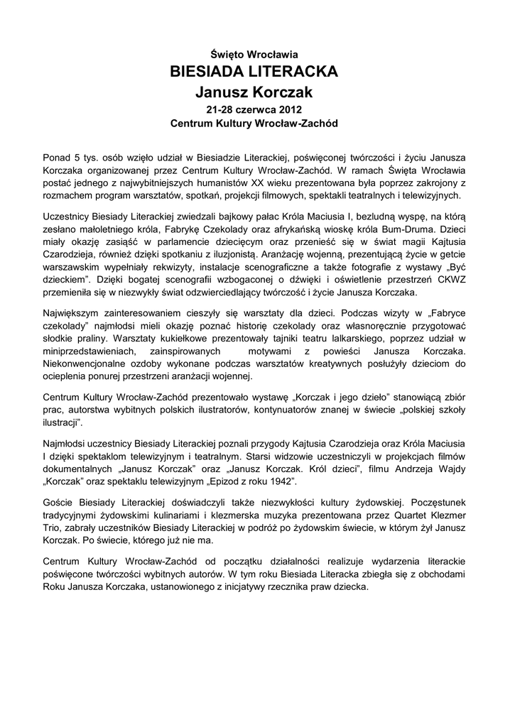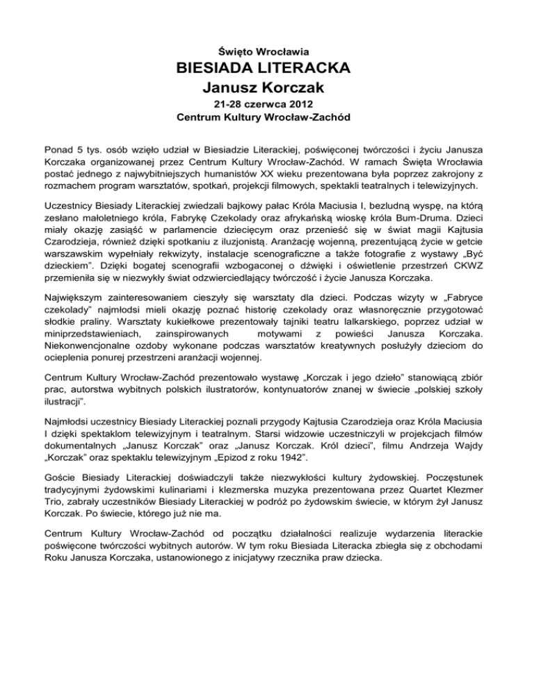 Święto Wrocławia BIESIADA LITERACKA Janusz Korczak 21-28 czerwca 2012 Centrum Kultury Wrocław-Zachód Ponad 5 tys. osób wzięło udział w Biesiadzie Literackiej, poświęconej twórczości i życiu Janusza Korczaka organizowanej przez Centrum Kultury Wrocław-Zachód. W ramach Święta Wrocławia postać jednego z najwybitniejszych humanistów XX wieku prezentowana była poprzez zakrojony z rozmachem program warsztatów, spotkań, projekcji filmowych, spektakli teatralnych i telewizyjnych. Uczestnicy Biesiady Literackiej zwiedzali bajkowy pałac Króla Maciusia I, bezludną wyspę, na którą zesłano małoletniego króla, Fabrykę Czekolady oraz afrykańską wioskę króla Bum-Druma. Dzieci miały okazję zasiąść w parlamencie dziecięcym oraz przenieść się w świat magii Kajtusia Czarodzieja, również dzięki spotkaniu z iluzjonistą. Aranżację wojenną, prezentującą życie w getcie warszawskim wypełniały rekwizyty, instalacje scenograficzne a także fotografie z wystawy „Być dzieckiem”. Dzięki bogatej scenografii wzbogaconej o dźwięki i oświetlenie przestrzeń CKWZ przemieniła się w niezwykły świat odzwierciedlający twórczość i życie Janusza Korczaka. Największym zainteresowaniem cieszyły się warsztaty dla dzieci. Podczas wizyty w „Fabryce czekolady” najmłodsi mieli okazję poznać historię czekolady oraz własnoręcznie przygotować słodkie praliny. Warsztaty kukiełkowe prezentowały tajniki teatru lalkarskiego, poprzez udział w miniprzedstawieniach, zainspirowanych motywami z powieści Janusza Korczaka. Niekonwencjonalne ozdoby wykonane podczas warsztatów kreatywnych posłużyły dzieciom do ocieplenia ponurej przestrzeni aranżacji wojennej. Centrum Kultury Wrocław-Zachód prezentowało wystawę „Korczak i jego dzieło” stanowiącą zbiór prac, autorstwa wybitnych polskich ilustratorów, kontynuatorów znanej w świecie „polskiej szkoły ilustracji”. Najmłodsi uczestnicy Biesiady Literackiej poznali przygody Kajtusia Czarodzieja oraz Króla Maciusia I dzięki spektaklom telewizyjnym i teatralnym. Starsi widzowie uczestniczyli w projekcjach filmów dokumentalnych „Janusz Korczak” oraz „Janusz Korczak. Król dzieci”, filmu Andrzeja Wajdy „Korczak” oraz spektaklu telewizyjnym „Epizod z roku 1942”. Goście Biesiady Literackiej doświadczyli także niezwykłości kultury żydowskiej. Poczęstunek tradycyjnymi żydowskimi kulinariami i klezmerska muzyka prezentowana przez Quartet Klezmer Trio, zabrały uczestników Biesiady Literackiej w podróż po żydowskim świecie, w którym żył Janusz Korczak. Po świecie, którego już nie ma. Centrum Kultury Wrocław-Zachód od początku działalności realizuje wydarzenia literackie poświęcone twórczości wybitnych autorów. W tym roku Biesiada Literacka zbiegła się z obchodami Roku Janusza Korczaka, ustanowionego z inicjatywy rzecznika praw dziecka.