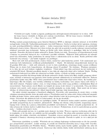 Koniec ±wiata 2012 Michalina Mrowicka 26 marca 2013 Czªowiek jest m¡dry. Ludzie s¡ t¦pymi, panikuj¡cymi, niebezpiecznymi zwierz¦tami i ty to wiesz. 1500 lat temu wszyscy wiedzieli, »e Ziemia jest centrum wszech±wiata. Ziemia jest pªaska (...). Kay, Faceci w czerni, 1997 500 lat temu wszyscy wiedzieli, »e Wedªug sonda»u przeprowadzonego przez Instytut Badawczy IPOS co dziesi¡ty czªowiek uwierzyª, i» 21.12.2012 nast¡pi koniec ±wiata [2]. Najbardziej przekonani o tym byli Chi«czycy. Liczba ta wydaje si¦ by¢ ogromna, zwa»aj¡c na maªe prawdopodobie«stwo takiego zaj±cia »aden renomowany instytut naukowo-badawczy nie potwierdziª informacji o ko«cu ±wiata. Kluczowe jest sªowo wydaje si¦, gdy» tak na prawd¦ to media szukaj¡ce sensacji próbuj¡ zwi¦kszy¢ znaczenie tego wydarzenia. S¡dz¡c po liczbie osób, które uwierzyªy w apokalips¦, idzie im to bardzo sprawnie. Powodów dla których ludzie uwierzyli w Koniec wiata jest wiele. Zaczynaj¡c od bezpodstawnych teorii a ko«cz¡c na powodach bior¡cych si¦ z wyobra¹ni i psychiki czªowieka. Wi¦kszo±¢ ludzi próbowaªa si¦ uchroni¢ przed tym zdarzeniem, b¦d¡c przekonana do samego ko«ca o zako«czeniu »ycia na ziemi. Ka»dy próbowaª sobie wyobrazi¢ ow¡ sytuacj¦ jak b¦dzie wygl¡da¢ czy przebiega¢. Skoro tyle osób byªo przekonanych o ko«cu ±wiata, musiaª by¢ jaki± konkretny powód. Caªe zamieszanie spowodowane byªo kalendarzem cywilizacji prekolumbijskich Majów. Ich kalendarz niespodziewanie sko«czyª si¦ 21 grudnia 2012 roku wiele osób uwierzyªo, »e jest to data symboliczna, zwiastuj¡ca koniec naszej cywilizacji. Wiemy ju», »e obawy byªy bezpodstawne, ale dlaczego akurat 21 grudnia? »e ta data nie jest pod »adnym wzgl¦dem wyj¡tkowa. Nie wiadomo. Wiadomo natomiast, Ukªad planet tego dnia powtarzaª si¦ ju» trzykrotnie w ostatnich 200 latach. Równie» przesilenie zimowe w tym dniu nie odgrywaªo du»ej roli w kulturze Majów. Wedªug zachowanych inskrypcji ten dzie« nie wskazywaª na koniec ±wiata, a jedynie na koniec pewnej epoki. Kolejnym powodem dla którego ludzie tak licznie uwierzyli w koniec ±wiata byªy lmy, ksi¡»ki, programy telewizyjne, artykuªy w internecie oraz gazetach, które bardzo sprawnie oddziaªywaªy na wyobra¹nie odbiorców. Dobrym przykªadam b¦dzie tutaj lm 2012, który przedstawiaª dosy¢ realistycznie wizje ko«ca ±wiata. Im bardziej przekonywuj¡cy lm lub ksi¡»ka, tym bardziej oddziaªuje na ludzk¡ wyobra¹ni¦ i tym samym wi¦cej osób wierzy w taki obrót zdarze«. Pami¦ta¢ nale»y o tym, »e wci¡» istniej¡ osoby, które maj¡ problem z odró»nieniem kcji od rzeczywisto±ci. Sami autorzy owych lmów czy ksi¡»ek nie musz¡ wcale wierzy¢ w t¡ katastrof¦. Chc¡ oni dobrze wykona¢ swój zawód, czyli czerpa¢ przyjemno±¢ i zarobi¢ pieni¡dze na swoim dziele. Mo»e nawet nie do ko«ca wiedz¡c, i» wykorzystuj¡ oni naiwno±¢ i ufno±¢ innych ludzi sugeruj¡c wizje katastroczne. Nie nale»y równie» zapomina¢ o fanatykach religijnych. Przywódcy sekt namawiaj¡ do swojej wiary, a swoim czªonkom wmawiaj¡ historie, które nie miaªy miejsca. Przykªadem mo»e by¢ jedna sekta, której zaªo»yciel oznajmiª, i» zbli»a si¦ koniec ±wiata, zatem nale»y si¦ pozby¢ caªego dobytku i uda¢ si¦ na pewn¡ gór¦, by tam doczeka¢ ko«ca ±wiata. Oczywi±cie dla niektórych byªo to zaskoczeniem, ale si¦ nie doczekali... Troch¦ wspólnego z ko«cem ±wiata ma apokalipsa zombie. W internecie mo»na znale¹¢ mnóstwo przykªadów, jak ludzie przygotowuj¡ si¦ na nadej±cie nieumarªych. Buduj¡ oni schrony, robi¡ kryjówki, magazynuj¡ zapasy, kupuj¡ bro« i szkol¡ si¦ z pomoc¡ ró»norakich poradników survivalowych. Zdrowy rozs¡dek podpowiada im , i» taka sytuacja nie wydarzy si¦ lecz w gª¦bi duszy chc¡ w to wierzy¢. Podejrzewam, »e jest to spowodowane po prostu nud¡ brakiem ekscytacji w »yciu. Wiele osób przej¦ªo si¦ tym, »e w grudniu mo»e sko«czy¢ si¦ ±wiat. Wszyscy zapewne wyobra»aj¡ sobie jak by to wygl¡daªo, co by si¦ staªo, czy zalaªoby nas lub nast¡piªby wybuch. Nie zdaj¡ sobie natomiast sprawy z tego, »e ludzie zgin¡, ich rodziny, wªa±ciwie caªa ludzko±¢. Normalnie, wszyscy powinni si¦ smuci¢, »e wszystko si¦ sko«czy, natomiast ci fanatycy odczuwaj¡ ekscytacj¦ na punkcie tego wydarzenia. Pozwala to s¡dzi¢, »e co± z nimi jest nie tak. Pokrewnym zjawiskiem s¡ wró»ki. j¡cy przepowiada¢ przyszªo±¢. Wªa±ciwie nie ma »adnego logicznego wytªumaczenia na ich dar pozwala- Ludzie uwa»aj¡, »e zostali oni obdarzeni niezwykª¡ moc¡ i mog¡ robi¢ wszystko. Doskonaªym przykªadem jest Wró»bita Maciej... Wró»bici mówi¡ cz¦sto bardzo ogólnie, specjalnie tak, »eby ich przepowiednia pasowaªa do ka»dej sytuacji. Zazwyczaj taka taktyka dziaªa, ludzie nie±wiadomie nabieraj¡ si¦ na 1 ich bujdy. Szczególnie wierz¡ wtedy, gdy mówi im si¦ o czym± miªym, przyjemnym i rozkosznym. Najcz¦±ciej s¡ to przepowiednie wielkiej miªo±ci lub wielkiej wygranej. Hasªo: poprawa sytuacji pasuje doskonale do ka»dej z wymienionych wcze±niej wydarze«. Oczywi±cie wró»bici doskonale wiedz¡ jak i co powiedzie¢ klientowi, »eby wyszedª on od nich zadowolony oraz nie szcz¦dziª pieni¦dzy za tak¡ przepowiednie. Wiara w koniec ±wiata nie ma »adnego naukowego podªo»a. To kwestia wewn¦trznej potrzeby. To poszukiwanie jakiego± gª¦bszego sensu. Nie wiadomo czego poszukuj¡ ci ludzie to zadanie dla psychologów. Jednak jest pewne nie traaj¡ do nich »adne argumenty, ka»dy przytomnie my±l¡cy czªowiek widzi jak si¦ sytuacja ma. Wiele ju» byªo w naszej historii rzekomych ko«ców ±wiata. Jak wida¢, na razie »adne przepowiednie si¦ nie speªniªy. Mo»na zatem zaryzykowa¢ sarkastyczne stwierdzenie: Koniec ±wiata to ±wi¦to ruchome. Literatura [1] http://pl.wikipedia.org/wiki/Kalendarz_Maj%C3%B3w [2] Focus, Czekaj¡c na koniec ±wi
