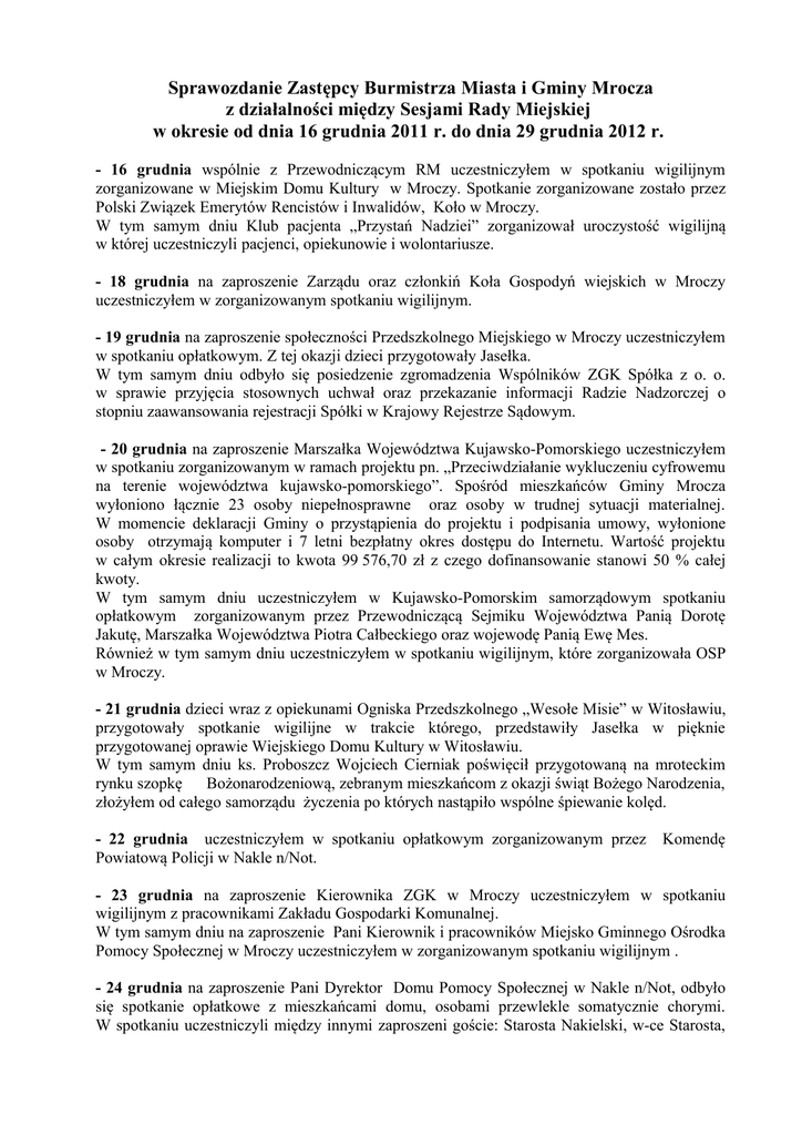 Sprawozdanie Zastępcy Burmistrza Miasta i Gminy Mrocza z działalności między Sesjami Rady Miejskiej w okresie od dnia 16 grudnia 2011 r. do dnia 29 grudnia 2012 r. - 16 grudnia wspólnie z Przewodniczącym RM uczestniczyłem w spotkaniu wigilijnym zorganizowane w Miejskim Domu Kultury w Mroczy. Spotkanie zorganizowane zostało przez Polski Związek Emerytów Rencistów i Inwalidów, Koło w Mroczy. W tym samym dniu Klub pacjenta „Przystań Nadziei” zorganizował uroczystość wigilijną w której uczestniczyli pacjenci, opiekunowie i wolontariusze. - 18 grudnia na zaproszenie Zarządu oraz członkiń Koła Gospodyń wiejskich w Mroczy uczestniczyłem w zorganizowanym spotkaniu wigilijnym. - 19 grudnia na zaproszenie społeczności Przedszkolnego Miejskiego w Mroczy uczestniczyłem w spotkaniu opłatkowym. Z tej okazji dzieci przygotowały Jasełka. W tym samym dniu odbyło się posiedzenie zgromadzenia Wspólników ZGK Spółka z o. o. w sprawie przyjęcia stosownych uchwał oraz przekazanie informacji Radzie Nadzorczej o stopniu zaawansowania rejestracji Spółki w Krajowy Rejestrze Sądowym. - 20 grudnia na zaproszenie Marszałka Województwa Kujawsko-Pomorskiego uczestniczyłem w spotkaniu zorganizowanym w ramach projektu pn. „Przeciwdziałanie wykluczeniu cyfrowemu na terenie województwa kujawsko-pomorskiego”. Spośród mieszkańców Gminy Mrocza wyłoniono łącznie 23 osoby niepełnosprawne oraz osoby w trudnej sytuacji materialnej. W momencie deklaracji Gminy o przystąpienia do projektu i podpisania umowy, wyłonione osoby otrzymają komputer i 7 letni bezpłatny okres dostępu do Internetu. Wartość projektu w całym okresie realizacji to kwota 99 576,70 zł z czego dofinansowanie stanowi 50 % całej kwoty. W tym samym dniu uczestniczyłem w Kujawsko-Pomorskim samorządowym spotkaniu opłatkowym zorganizowanym przez Przewodniczącą Sejmiku Województwa Panią Dorotę Jakutę, Marszałka Województwa Piotra Całbeckiego oraz wojewodę Panią Ewę Mes. Również w tym samym dniu uczestniczyłem w spotkaniu wigilijnym, które zorganizowała OSP w Mroczy. - 21 grudnia dzieci wraz z opiekunami Ogniska Przedszkolnego „Wesołe Misie” w Witosławiu, przygotowały spotkanie wigilijne w trakcie którego, przedstawiły Jasełka w pięknie przygotowanej oprawie Wiejskiego Domu Kultury w Witosławiu. W tym samym dniu ks. Proboszcz Wojciech Cierniak poświęcił przygotowaną na mroteckim rynku szopkę Bożonarodzeniową, zebranym mieszkańcom z okazji świąt Bożego Narodzenia, złożyłem od całego samorządu życzenia po których nastąpiło wspólne śpiewanie kolęd. - 22 grudnia uczestniczyłem w spotkaniu opłatkowym zorganizowanym przez Powiatową Policji w Nakle n/Not. Komendę - 23 grudnia na zaproszenie Kierownika ZGK w Mroczy uczestniczyłem w spotkaniu wigilijnym z pracownikami Zakładu Gospodarki Komunalnej. W tym samym dniu na zaproszenie Pani Kierownik i pracowników Miejsko Gminnego Ośrodka Pomocy Społecznej w Mroczy uczestniczyłem w zorganizowanym spotkaniu wigilijnym . - 24 grudnia na zaproszenie Pani Dyrektor Domu Pomocy Społecznej w Nakle n/Not, odbyło się spotkanie opłatkowe z mieszkańcami domu, osobami przewlekle somatycznie chorymi. W spotkaniu uczestniczyli między innymi zaproszeni goście: Starosta Nakielski, w-ce Starosta, Burmistrz Kcyni, Burmistrz Nakła oraz Ks. Grzegorz Nowak proboszcz parafii p.w. św Wawrzyńca w Nakła. - 28 grudnia w tym dniu miałem przyjemność wręczyć Pani Agnieszce Wojtczak akt nadania stopnia awansu zawodowego nauczyciela - na stopień nauczyciela mianowanego. Pani Agnieszka w dniu 19 grudnia uzyskała zaświadczenie o zdaniu egzaminu przed Komisją Egzaminacyjną powołaną zarządzeniem Burmistrza MiG Mrocza, do przeprowadzenia postępowania egzaminacyjnego dla nauczyciela kontraktowego. Zastępca Burmistrza Miasta i Gminy Mrocza (-) Leszek Klesiński