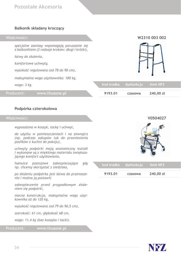 Pozostałe Akcesoria Balkonik składany kroczący W2310 003 002 Właściwości: specjalne zawiasy wspomagają poruszanie się z balkonikiem (2 rodzaje kroków: długi i krótki), łatwy do złożenia, komfortowe uchwyty, wysokość regulowana (od 78 do 90 cm), maksymalna waga użytkownika: 100 kg, waga: 3 kg. Producent: www.thuasne.pl kod środka dysfunkcja limit NFZ 9193.01 czasowa 240,00 zł Podpórka czterokołowa V0504027 Właściwości: wyposażona w koszyk, tackę i uchwyt, do użytku w pomieszczeniach i na zewnątrz (np. podczas zakupów lub do przeniesienia posiłków z kuchni do pokoju), uchwyty podpórki mają anatomiczny kształt i wykonane są z miękkiego materiału zwiększającego komfort użytkowania, hamulce postojowe zabezpieczające np. chcemy skorzystać z siedziska, gdy po złożeniu podpórka jest łatwa do przenoszenia i można ją postawić zabezpieczenie przed przypadkowym złożeniem się podpórki, mocna konstrukcja, maksymalna waga użytkownika aż do 120 kg, wysokość regulowana (od 79 do 96,5 cm), szerokość: 61 cm, głębokość 68 cm, waga: 11,4 kg (bez koszyka i tacki). Producent: 34 www.thuasne.pl kod środka dysfunkcja limit NFZ 9193.01 czasowa 240,00 zł Transportowanie i poruszanie się Kule Globe-Trotter®+ W2017 001 006 Właściwości: estetyczny wygląd i doskonały komfort, niezwykle komfortowe dzięki zastosowaniu specjalnego tworzywa w miejscu oparcia dłoni i przedramienia, tworzywo to pełni również rolę zabezpieczenia przeciw poślizgowi dłoni, światło odblaskowe z przodu, regulowana wysokość (od 78 do 105 cm), waga: 510 g (jedna kula), kod środka dysfunkcja limit NFZ 9192.01 czasowa 22,00 zł maksymalna waga użytkownika: 150 kg. Producent: www.thuasne.pl Kule dziecięce W2015 002 001 Zastosowanie: miękka część dłoniowa, światło odblaskowe z przodu i z tyłu części dłoniowej dla większego bezpieczeństwa w nocy, końcówki minimalizujące odgłosy w trakcie chodzenia, nastawna wysokość części łokciowej, regulowana wysokość (od 58 do 75 cm), kod środka dysfunkcja limit NFZ 9192.01 czasowa 22,00 zł waga: 470 g (jedna kula), maksymalna waga użytkownika: 60 kg. Producent: www.reh4mat.com 35 Pozostałe Akcesoria Materac ortopedyczny przeciwodleżynowy, bąbelkowy VCM202 Właściwości: profilaktyka oraz wspomaganie leczenia odleżyn, długość: 200 cm, szerokość: 90 cm, wysokość: 6 cm, nośność materaca: 110 kg. Producent: www.mdh.pl kod środka dysfunkcja limit NFZ 9194.02 czasowa 550,00 zł Pneumatyczny materac zmiennociśnieniowy z kompresorem W3015 003 001 Właściwości: profilaktyka oraz wspomaganie leczenia odleżyn, długość: 280 cm, szerokość: 90 cm, wysokość: 6,5 cm, nośność materaca: 120 kg. Producent: 36 www.thuasne.pl kod środka dysfunkcja limit NFZ 9194.02 czasowa 550,00 zł Poruszanie się i rehabilitacja Kula ortopedyczna łokciowa Evolution VCBP0042 Właściwości: wykonane z aluminium, elementy odblaskowe zapewniają bezpieczeństwo poruszania się w miejscach zaciemnionych, regulacja skokowa wysokości co 2,5 cm, dostępne w kolorach: niebieski, szary, wysokość regulowana (od 77 do 97 cm), waga: 600 g, maksymalne obiążenie: 110 kg. Producent: kod środka dysfunkcja limit NFZ 9192.01 czasowa 22,00 zł www.mdh.pl 37 Pozostałe Akcesoria Inkontynencja (nietrzymanie moczu) kod NFZ: Produkty: 9244.05 / 9245.03 Podkłady higieniczne Seni Soft 90x60 Pieluchy anatomiczne San Seni Plus, Uni, Normal, Prima, Maxi 9244.01 / 9244.02 / 9244.03 9245.01 / 9245.02 Pieluchomajtki dla dorosłych Super Seni Small, Medium, Large, Extra Large 9244.04 / 9245.01 / 9245.02 Pieluchomajtki dla dorosłych Super Seni Trio Extra Large, Large, Medium, Small 9244.04 / 9245.01 / 9245.02 Pieluchomajtki Plus Extra Medium, Large, Extra Large, Small, 9244.04 / 9245.01 / 9245.02 Anatomiczne wkładki urologiczne Seni Lady Normal, Mini, Mini Plus, Mikro, Plus, Super, Extra 9244.06 / 9245.04 Majtki chłonne Seni Active Extra Large, Large, Medium, Small 9244.04 / 9245.01 / 9245.02 Majtki chłonne Seni Active Normal Medium, Large 9244.04 / 9245.01 / 9245.02 Anatomiczne wkładki urologiczne Seni Man Super, Normal, Active 9244.06 / 9245.04 Small, Seni Care Lotion do ciała Seni Care krem do mycia ciała 3w1 Kosmetyki dla dorosłych Seni Care Seni Care olejek pielęgnacyjny Termometry Produkty: Termometr bezdotykowy Termoflash Termometr elektroniczny mebby Flexo Termometr elektroniczny Medel Thermo New 38 lista pozostałych produktów Stomia kod NFZ: Produkty: Pasta stomijna Coloplast w tubce Zmywacz Coloplast do pielęgnacji skóry Krem przeciwodparzeniowy Coloplast Płytka stomijna Sensura Click z uszkami 9243.01 / 9243.02 / 9243.03 Płytka stomijna Sensura Xpro 9243.01 / 9243.02 / 9243.03 Worek otwarty Sensura Click cielisty 50mm 9243.01 / 9243.02 / 9243.03 Worek otwarty Sensura Click przeźroczysty 50mm 9243.01 / 9243.02 / 9243.03 Worek stomijny 1-cz przeźroczysty maxi hide-away 9243.01 / 9243.02 / 9243.03 Worek stomijny 1-cz otwarty hide-away cielisty maxi 9243.01 / 9243.02 / 9243.03 otwarty Sensura worek stomijny 1-cz otwarty Hide-Away przeźroczysty i cielisty Stomex pas brzuszny (stomijny) Pas brzuszny stomijny Ciśnieniomierze Produkty: Ciśnieniomierz Elektroniczny Medel Display Top Ciśnieniomierz elektroniczny Medel Elite Ciśnieniomierz elektroniczny Medel Palm Self Medel Dynamic Medel Display Medel Manual Medel Palm Pro 39 Pozostałe Akcesoria Pomoc w życiu codziennym Produkty: Uchwyt łazienkowy Uchwyt prosty 30cm / 45cm / 60cm Ławka do wanny – szybko złączka Siedzisko do wanny Poduszka ortopedyczna Cervi+ Torebka chłodząca Lampa nagrzewająca Stetoskop Littmann Classic Opatrunek Medisorb Inhalator Magic Care GHibli Inhalator Philips Respironics Family lub Pro Czwórnóg Laska aluminiowa Laska z uchwytem T Laska z uchwytem ergonomicznym Materac pneumatyczny przeciwodleżynowy z pompą Wkładki korekcyjne i supinacyjne Chwytak 80cm Zestaw do zmiany opatrunku poziom III Plastry Irygator Medel Blueje