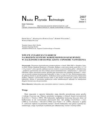 N auka P rzyroda T echnologie 2007 Tom 1 Zeszyt 1 Dział: Rolnictwo ISSN http://www.npt.up-poznan.net/tom1/zeszyt1/art_1.pdf Copyright ©Wydawnictwo Akademii Rolniczej im. Augusta Cieszkowskiego w Poznaniu PIOTR SZULC1, MAGDALENA RYBUS-ZAJĄC2, HUBERT WALIGÓRA1, WITOLD SKRZYPCZAK1 1 Katedra Uprawy Roli i Roślin Katedra Fizjologii Roślin Akademia Rolnicza im. Augusta Cieszkowskiego w Poznaniu 2 WPŁYW FUSARIUM CULMORUM NA ROZWÓJ SYSTEMU KORZENIOWEGO KUKURYDZY W ZALEśNOŚCI OD DAWKI AZOTU I SPOSOBU NAWOśENIA Streszczenie. Wazonowe doświadczenie przeprowadzono w latach 2004-2005 w Katedrze Uprawy Roli i Roślin Akademii Rolniczej w Poznaniu. Badano w nim cztery dawki azotu (0,6, 1,2, 1,8 i 2,4 g·wazon-1), dwa sposoby aplikacji nawozu (rzutowy na powierzchnię gleby i zlokalizowany – punktowy pod korzeń) oraz dwa rodzaje nasion (nieinokulowane i inokulowane F. culmorum). Określano wpływ nawoŜenia azotem, sposobu jego stosowania oraz inokulacji grzybem F. culmorum na rozwój systemu korzeniowego kukurydzy w fazie 3-4 oraz 4-5 liści. Korzystniejszą metodą aplikacji okazał się sposób punktowy. Inokulacja nasion grzybem była przyczyną zmniejszenia średnicy, długości i powierzchni korzeni roślin w obu fazach rozwojowych. Lepsze odŜywienie kukurydzy azotem w nawoŜeniu punktowym roślin inokulowanych wpłynęło na zmniejszenie długości korzeni oraz ich powierzchni. Słowa kluczowe: kukurydza, azot, nawoŜenie startowe i rzutowe, inokulacja Wstęp DuŜe znaczenie w uprawie kukurydzy mają choroby powodowane przez grzyby z rodzaju Fusarium ssp. Objawy poraŜenia występują w róŜnych fazach rozwojowych (LISOWICZ i TEKIELA 2003). Dla kukurydzy najbardziej krytyczną fazą jest okres od kiełkowania aŜ do wytworzenia pierwszych liści. Jak podają CZAPLIŃSKA i JASA (1980 a), CZAPLIŃSKA i MAGRYŚ (1984) oraz PARRY i IN. (1995), obecność w glebie F. culmorum wpływa na poraŜenie nasion i siewek kukurydzy oraz gnicie systemu korzeniowego, czego wyraźnym wynikiem jest zahamowany wzrost i rozwój roślin. 2 Szulc P., Rybus-Zając M., Waligóra H., Skrzypczak W., 2007. Wpływ Fusarium culmorum na rozwój systemu korzeniowego kukurydzy w zaleŜności od dawki azotu i sposobu nawoŜenia. Nauka Przyr. Technol. 1, 1, #1. Stosowanie zapraw nasiennych zmniejsza wprawdzie zagroŜenie infekcją materiału siewnego, ale nie eliminuje całkowicie gnicia kiełków, czego wyraźnym symptomem są puste miejsca po obumarłych siewkach na plantacjach produkcyjnych kukurydzy. Podjęto badania, których celem było stwierdzenie, czy obecność w glebie grzyba F. culmorum wpłynie na rozwój systemu korzeniowego kukurydzy i części nadziemnej rośliny w zaleŜności od dawki azotu i sposobu nawoŜenia. Metodyka W latach 2004-2005 w dwóch seriach doświadczeń wazonowych, przeprowadzonych w Katedrze Uprawy Roli i Roślin Akademii Rolniczej im. Augusta Cieszkowskiego w Poznaniu, badano rozwój systemu korzeniowego kukurydzy w fazach młodocianych w zaleŜności od zasobności gleby w azot, sposobu stosowania azotu oraz inokulacji materiału siewnego grzybem F. culmorum. ZałoŜono je w układzie split-plot w czterech powtórzeniach, zgodnie z metodyką doświadczeń wazonowych (śURBICKI 1974). W doświadczeniu wysiano mieszańca PR 39 T 68 hodowli Pioneer. Badanymi czynnikami były: cztery dawki azotu w formie saletry amonowej (0,6, 1,2, 1,8 i 2,4 g·wazon-1), dwa sposoby aplikacji nawozu (rzutowy na powierzchnię gleby i punktowy, zlokalizowany 5 cm poniŜej i 5 cm z boku nasienia), dwa rodzaje nasion (bez inokulacji oraz inokulowane F. culmorum). Do inokulacji nasion wykorzystano zawiesinę wodną (woda destylowana) F. culmorum z zarodnikami i grzybnią przygotowaną z 21-dniowych kultur hodowanych na poŜywce glukozowo-ziemniaczanej (CZAPLIŃSKA i MAGRYŚ 1984). Wyhodowane kultury miksowano, uzyskując mieszaninę infekcyjną z grzybni, zarodników i metabolitów grzybów. Nasiona moczono w zawiesinie zarodników przez okres 5 min. W doświadczeniu wykorzystano glebę o następującym składzie chemicznym: P – 13 mg·100 g-1 s.m. gleby, K – 16,9 mg·100 g-1 s.m. gleby, Mg – 15,2 mg·100 g-1 s.m. gleby, pH w KCl = 6,75. Siew kukurydzy wykonano 20 kwietnia do wazonów Mitscherlicha o objętości 10 litrów. Do kaŜdego wazonu przeznaczono pięć nasion, a po wschodach wykonano przerywkę, pozostawiając jedną roślinę. Pomiary biometryczne wykonano w fazach 3-4 i 4-5 liści. W tym celu oddzielono część nadziemną rośliny od systemu korzeniowego. Mokre korzenie umieszczono na płaskim, szklanym naczyniu z niewielką ilością wody. Pod naczynie włoŜono papier milimetrowy. Korzenie wyprostowano tak, aby nie zachodziły na siebie i przez nałoŜenie szklanej płyty utrzymywały się w stałym połoŜeniu. Następnie zmierzono, z dokładnością do 1 mm, długość wybranych korzeni lub ich fragmentów. Średnicę korzeni zmierzono suwmiarką elektroniczną na tych samych próbach, na których sprawdzano ich długość. Wykonano 20 pojedynczych pomiarów, z których wyliczono średnią. Powierzchnię systemu korzeniowego wyznaczono na podstawie długości systemu korzeniowego i średnicy korzeni. Części nadziemne roślin umieszczono w suszarce i po wysuszeniu zwaŜono. 3 Szulc P., Rybus-Zając M., Waligóra H., Skrzypczak W., 2007. Wpływ Fusarium culmorum na rozwój systemu korzeniowego kukurydzy w zaleŜności od dawki azotu i sposobu nawoŜenia. Nauka Przyr. Technol. 1, 1, #1. Wyniki i dyskusja Zmienność analizowanych cech dla poszczególnych faz rozwojowych przedstawiono w tabeli 1. Długość korzeni oraz ich powierzchnia w fazie 3-4 liści ulegała największym wahaniom (odpowiednio od 81,94 cm do 285,32 cm i od 18,37 cm2 do 72,01 cm2), natomiast w fazie 4-5 liści największa zmienność dotyczyła powierzchni korzeni – od 75,76 cm2 do 157,89 cm2. Były to cechy odznaczające się największą zmiennością spośród wszystkich badanych. Cechą najbardziej stabi
