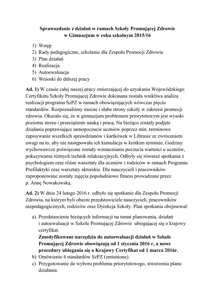 Sprawozdanie z działań w ramach Szkoły Promującej Zdrowie w Gimnazjum w roku szkolnym 2015/16 1) 2) 3) 4) 5) 6) Wstęp Rady pedagogiczne, szkolenie dla Zespołu Promocji Zdrowia Plan działań Realizacja Autoewaluacja Wnioski do dalszej pracy Ad. 1) W czasie całej naszej pracy zmierzającej do uzyskania Wojewódzkiego Certyfikatu Szkoły Promującej Zdrowie dokonana została wnikliwa analiza realizacji programu SzPZ w ramach obowiązujących wówczas pięciu standardów. Rozpoznaliśmy mocne i słabe strony szkoły w zakresie promocji zdrowia. Okazało się, że w gimnazjum problemem priorytetowym jest wysoki poziomu stresu i przeciążenie nauką i pracą. Na bieżąco zostały podjęte działania poprawiające samopoczucie uczniów poprzez min. terminowe zapisywanie wszelkich sprawdzianów i kartkówek w Librusie ze zwróceniem uwagi na to, aby nie następowała ich kumulacja w krótkim terminie. Godziny wychowawcze poświęcone zostały wzmacnianiu poczucia wartości u uczniów, pokazywaniu różnych technik relaksacyjnych. Odbyły się również spotkania z psychologiem oraz różne warsztaty dla uczniów i rodziców w ramach Programu Profilaktyki oraz warsztaty aktorskie. Dla nauczycieli i pracowników zaproponowane zostały zajęcia popołudniowe fitness prowadzone przez p. Annę Nowakowską. Ad. 2) W dniu 24 lutego 2016 r. odbyło się spotkanie dla Zespołu Promocji Zdrowia, na którym byli obecni przedstawiciele nauczycieli, pracowników niepedagogicznych, rodziców oraz Dyrekcja Szkoły. Plan spotkania obejmował: a) Przedstawienie bieżących informacji na temat planowania, działań i autoewaluacji w Szkole Promującej Zdrowie ubiegającej się o krajowy certyfikat. Zmodyfikowane narzędzia do autoewaluacji działań w Szkole Promującej Zdrowie obowiązują od 1 stycznia 2016 r, a nowe procedury ubiegania się o Krajowy Certyfikat od 1 marca 2016r. b) Omówienie 4 standardów SzPZ (zmienione). c) Przygotowanie do wyboru problemu priorytetowego, stworzenia planu działania. d) Podział obowiązków, utworzenie podzespołów. Spotkanie prowadziła Dyrekcja Szkoły oraz koordynator Aneta Wąsowicz – Ciechomska, która była w dniach 22 – 23.10.2015 r. na szkoleniu dla regionalnych i szkolnych koordynatorów szkół promujących zdrowie. W całym roku szkolnym na radach pedagogicznych omawiane były sprawy związane z promocją zdrowia w naszej szkole i przekazywane bieżące informacje o podejmowanych działaniach przez członków zespołu. Główną inicjatorką i pomysłodawczynią w tym roku była p. Małgorzata Cendrowska. Ad. 3) W roboczym planie działań uwzględnione zostały następujące przedsięwzięcia: a) Ewaluacja programu szkoły promującej zdrowie według zmienionych standardów i wyłonienie problemów priorytetowych – odpowiedzialni: wychowawcy klas II SP oraz klas IV SP i II Gimnazjum, nauczyciele w – fu, opracowanie wyników i wnioski – p. Agnieszka Grajewska, b) Projekty edukacyjne np. mające na celu ocieplenie wizerunku szkoły poprzez stworzenie kącika wypoczynku oraz artystyczne zagospodarowanie pustych ścian i drzwi oraz inne – uczniowie klas II gimnazjum, p. Małgorzata Cendrowska, c) Współpraca z PSSE w Pruszkowie w ramach profilaktyki zdrowia – p. Aneta Wąsowicz, p. Ewa Pius we współpracy z PSSE d) Całoroczny konkurs plastyczny „Zdrowe odżywianie, sport i czytanie” – p. Małgorzata Cendrowska e) Udział w 6 edycji programu edukacyjnego „Żyj smacznie i zdrowo” – p. Aneta Wąsowicz f) Udział w ogólnopolskim konkursie o zdrowiu MEDITEST – p. Aneta Wąsowicz, p. Beata Czyżewska g) Organizacja Tygodnia Zdrowia – p. Beata Czyżewska, p. Aneta Wąsowicz we współpracy z PSSE h) Organizacja Dnia Sportu – nauczyciele w – fu, p. Aneta Wąsowicz, zespół promocji zdrowia i) Warsztaty aktorskie, pomagające uczniom zdobywać pewność siebie, wyrażać emocje (zdrowie psychiczne) – p. dyrektor Monika Mikunda j) Dzień Pustej Klasy – p. Małgorzata Cendrowska, uczniowie gimnazjum k) Film o promocji zdrowia w naszym gimnazjum – p. Aneta Wąsowicz oraz uczniowie klas trzecich gimnazjum Ad. 4) W bieżącym roku szkolnym zrealizowaliśmy wszystkie zaplanowane zadania: a) Ewaluacja programu szkoły promującej zdrowie - załącznik Wyniki analizy ORE b) Projekty edukacyjne: Projekt „Znak na Zachętę” 12 i 13 października uczniowie klasy II B Gimnazjum im. Księcia Józefa Poniatowskiego w Michałowicach brali udział w projekcie „Znak na Zachętę”. Jest to projekt Stowarzyszenia Monopol Warszawski w partnerstwie z Zachętą Narodową Galerią Sztuki i Fundacją Grupa Twórcza, dofinansowany przez Ministerstwo Kultury i Dziedzictwa Narodowego skierowany do szkół z terenów wiejskich i z małych miast. Mieliśmy szczęście – gimnazjum w Michałowicach wybrane zostało spośród wielu innych zgłoszonych szkół. Naszą szkołę odwiedzili: Anna Owsiany, Agnieszka Szostakiewicz i Kamil Niedziałek - edukatorzy sztuki współczesnej. Dzięki nim i zaangażowaniu wszystkich uczestników zajęć udało się stworzyć dzieło sztuki, które nie tylko należy podziwiać i oglądać z daleka, ale które będzie „żyć” i zmieniać się. Praca gimnazjalistów będzie służyć wszystkim uczniom, jako miejsce przekazywania wiadomości i wymiany poglądów. Każdy może dopisać czy dorysować coś od siebie. Zajęcia trwały dwa dni. W pierwszym dniu uczniowie zapoznali się z akcjami artystycznymi w przestrzeni publicznej, które odbywają się na świecie. Wspólnie budowali szałas, stworzyli emocjonalną mapę szkoły. Zastanawiali się co im się w niej podoba i co się nie podoba, co możnaby zmienić. Przeprowadzili też ankietę wśród mieszkańców Michałowic, pytając, jakich kulturalnych, artystycznych wydarzeń im brakuje, co chcieliby ulepszyć w swoim otoczeniu. Ten pierwszy dzień warsztatów zakończyli spacerem po szkole, wybraniem miejsca akcji i decyzją , co chcieliby zrobić