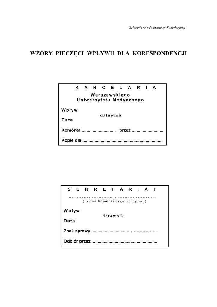 Załącznik nr 4 do Instrukcji Kancelaryjnej WZORY PIECZĘCI WPŁYWU DLA KORESPONDENCJI K A N C E L A R I A Warszawskiego Uniw ersytetu Med ycznego W p ł yw datownik Data Komórka ............................ przez .......................... Kopie dla .................................................................. S E K R E T A R I A T …..….…………………………………….. (nazwa komórki organizacyjnej) W p ł yw datownik Data Znak sprawy .............................………………… Odbiór przez .....................................................