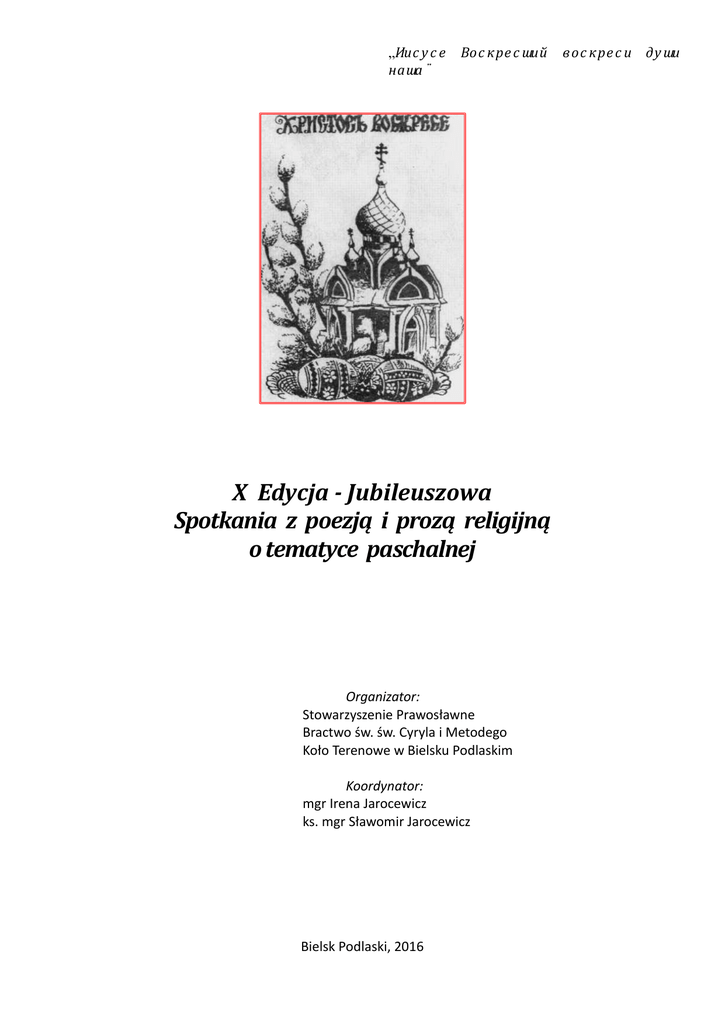 „Иис у с е наша ” Вос к ре с ший X Edycja - Jubileuszowa Spotkania z poezją i prozą religijną o tematyce paschalnej Organizator: Stowarzyszenie Prawosławne Bractwo św. św. Cyryla i Metodego Koło Terenowe w Bielsku Podlaskim Koordynator: mgr Irena Jarocewicz ks. mgr Sławomir Jarocewicz Bielsk Podlaski, 2016 в ос к ре с и ду ши Serdecznie zapraszamy do udziału w X Edycji „Spotkania z poezją i prozą religijną o tematyce paschalnej” Cele konkursu: • odkrycie piękna prawosławnej poezji i prozy o tematyce paschalnej • rozwijanie zainteresowań poezją i prozą religijną, • poznawanie Boga poprzez piękno słowa, • zachęcanie do poznawanie i upowszechniania tematyki paschalnej • rozwijanie zdolności recytatorskich, • szerzenie kultury języka, piękna żywego słowa. Uczestnicy konkursu uczestnikiem może być każdy przedszkolak, uczeń szkoły podstawowej, gimnazjum i ponadgimnazjalnej z powiatu bielskiego w 5 kategoriach wiekowych: przedszkolnej klas I-III szkoły podstawowej klas IV-VI szkoły podstawowej gimnazjum szkół ponadgimnazjalnych w każdej kategorii wiekowej, z danej szkoły, może być zakwalifikowanych tylko 5 uczniów. Warunki uczestnictwa: każdy uczestnik powinien przygotować i zaprezentować wiersz lub fragment prozy o tematyce związanej z okresem paschalnym. Wymagania konkursu: uczestnik powinien zaprezentować wiersz lub prozę w języku słowiańskim (polskim, białoruskim, rosyjskim, ukraińskim). Termin zgłoszenia i miejsce konkursu: termin zgłoszenia do 06.05.2016r. (proszę przestrzegać terminu-jest to konieczne ze względów organizacyjnych) opiekun wypełnia kartę zgłoszenia uczestników zaakceptowaną przez dyrektora szkoły, odsyła na adres: Stowarzyszenie Prawosławne Bractwo św. św. Cyryla i Metodego Koło Terenowe w Bielsku Podlaskim ul. Rejtana 24 17-100 Bielsk Podlaski z dopiskiem „Konkurs” tel. 510 149 028, 515 291 305 [email protected] spotkanie z prozą i poezją odbędzie się 14.05.2016r. w Domu Parafialnym Parafii Prawosławnej pod wezwaniem św. Michała w Bielsku Podlaskim przy ul. Mickiewicza 36 o godz.9:00 UWAGA. Do zgłoszenia prosimy dołączyć kopię prezentowanego utworu Organizatorzy zapraszają do czynnego udziału w spotkaniu