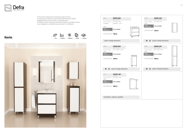 37 Kontrastowe połączenie ciemnego wenge luiziana na korpusach i białych frontów mebli łazienkowych KEVIN wygląda bardzo nowocześnie i nieszablonowo. To między innymi zasługa zachowania lekkiej, oszczędnej formy oraz rezygnacji z uchwytów przy drzwiach i szufladach. szafka KEVIN D60 0D2S nóżki 59 x 80 x 45,5 PLAN 60 – 1722 x x (cm) umywalka index wenge luiziana-biały 034-D-06001 cena netto szafki 750 zł szafka KEVIN A35 1D0S wisząca 35 x 60 x 21,7 x x (cm) index wenge luiziana-biały 034-A-03502 cena netto szafki 230 zł Kevin system cichego domykania szafka KEVIN B35 1D0S nóżki 35,1 x 98,4 x 30,3 x x (cm) index L P system cichego domykania szafka KEVIN C35 2D0S nóżki 35 x 180 x 30,1 x x (cm) index wenge luiziana-biały 034-B-03502 wenge luiziana-biały 034–C-03502 cena netto szafki 440 zł cena netto szafki 790 zł L P system cichego domykania lustro x x (cm) KEVIN L60* z półką 60 x 80 x 15,6 index wenge luiziana-biały 034-L-06002 cena netto lustra 260 zł *oświetlenie, włącznik, gniazdko L P system cichego domykania