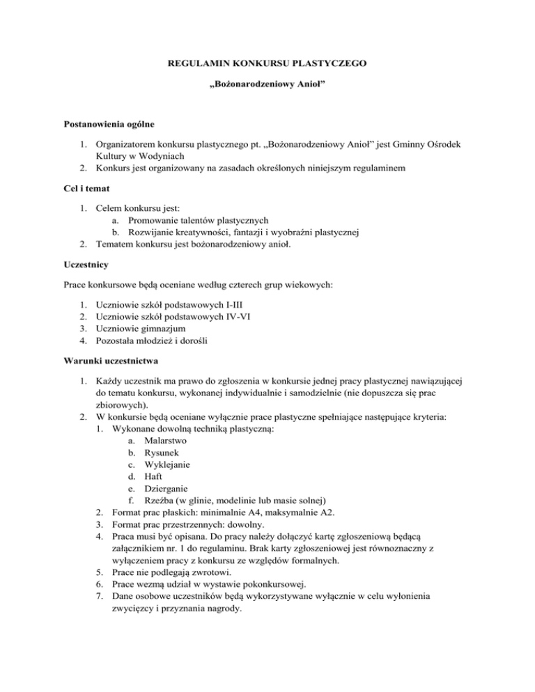 REGULAMIN KONKURSU PLASTYCZEGO „Bożonarodzeniowy Anioł” Postanowienia ogólne 1. Organizatorem konkursu plastycznego pt. „Bożonarodzeniowy Anioł” jest Gminny Ośrodek Kultury w Wodyniach 2. Konkurs jest organizowany na zasadach określonych niniejszym regulaminem Cel i temat 1. Celem konkursu jest: a. Promowanie talentów plastycznych b. Rozwijanie kreatywności, fantazji i wyobraźni plastycznej 2. Tematem konkursu jest bożonarodzeniowy anioł. Uczestnicy Prace konkursowe będą oceniane według czterech grup wiekowych: 1. 2. 3. 4. Uczniowie szkół podstawowych I-III Uczniowie szkół podstawowych IV-VI Uczniowie gimnazjum Pozostała młodzież i dorośli Warunki uczestnictwa 1. Każdy uczestnik ma prawo do zgłoszenia w konkursie jednej pracy plastycznej nawiązującej do tematu konkursu, wykonanej indywidualnie i samodzielnie (nie dopuszcza się prac zbiorowych). 2. W konkursie będą oceniane wyłącznie prace plastyczne spełniające następujące kryteria: 1. Wykonane dowolną techniką plastyczną: a. Malarstwo b. Rysunek c. Wyklejanie d. Haft e. Dzierganie f. Rzeźba (w glinie, modelinie lub masie solnej) 2. Format prac płaskich: minimalnie A4, maksymalnie A2. 3. Format prac przestrzennych: dowolny. 4. Praca musi być opisana. Do pracy należy dołączyć kartę zgłoszeniową będącą załącznikiem nr. 1 do regulaminu. Brak karty zgłoszeniowej jest równoznaczny z wyłączeniem pracy z konkursu ze względów formalnych. 5. Prace nie podlegają zwrotowi. 6. Prace wezmą udział w wystawie pokonkursowej. 7. Dane osobowe uczestników będą wykorzystywane wyłącznie w celu wyłonienia zwycięzcy i przyznania nagrody. 8. Organizator zastrzega sobie prawo do wyłączenia z konkursu prac zrolowanych, złożonych i pogniecionych. 9. Nadesłanie pracy oznacza akceptację warunków konkursu i regulaminu. 3. Prace na konkurs należy dostarczyć do 1 grudnia 2014 r. do siedziby Organizatora: Gminny Ośrodek Kultury w Wodyniach ul. Siedlecka 41 08-117 Wodynie Zasady przyznawania nagród 1. Oceny prac dokona komisja konkursowa powołana przez Organizatora. W skład komisji konkursowej nie mogą wchodzić osoby spokrewnione z uczestnikami konkursu. 2. Komisja Konkursowa przyzna nagrody i ewentualne wyróżnienia w każdej kategorii wiekowej. 3. Nagrody rzeczowe nie podlegają wymianie na inne ani zamianie na ekwiwalent pieniężny. 4. Ogłoszenie wyników konkursu i wręczenie nagród odbędzie się podczas finału w Gminnym ośrodku Kultury w Wodyniach w dniu 6 grudnia 2014 r. O dokładnym terminie uczestnicy konkursu zostaną powiadomieni telefonicznie. 5. Laureaci konkursu, którzy nie będą mogli uczestniczyć w uroczystości wręczenia nagród, będą mogli odebrać nagrody w terminie późniejszym w siedzibie Organizatora. 6. Wyniki konkursu i zwycięskie prace zostaną opublikowane na stronie internetowej Organizatora konkursu: www.gok-wodynie.pl 7. Organizator zastrzega sobie prawo do bezpłatnego wykorzystania prac w celach popularyzatorskich. Postanowienia końcowe 1. Udział w konkursie jest jednoznaczny z akceptacją niniejszego regulaminu, oraz zgodą na publikację materiałów z przebiegu konkursu w tym wizerunku fotografowanych osób. 2. Regulamin konkursu jest dostępny w siedzibie Organizatora, oraz na stronie internetowej www.gok-wodynie.pl. Szczegółowe informacje o konkursie można uzyskać pod numerem telefonu: (25) 631-20-11, lub za pośrednictwem poczty elektronicznej: [email protected]