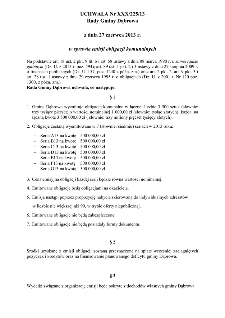 UCHWAŁA Nr XXX/225/13 Rady Gminy Dąbrowa z dnia 27 czerwca 2013 r. w sprawie emisji obligacji komunalnych Na podstawie art. 18 ust. 2 pkt. 9 lit. b i art. 58 ustawy z dnia 08 marca 1990 r. o samorządzie gminnym (Dz. U. z 2013 r. poz. 594); art. 89 ust. 1 pkt. 2 i 3 ustawy z dnia 27 sierpnia 2009 r. o finansach publicznych (Dz. U. 157, poz. 1240 z późn. zm.) oraz art. 2 pkt. 2, art. 9 pkt. 3 i art. 28 ust. 1 ustawy z dnia 29 czerwca 1995 r. o obligacjach (Dz. U. z 2001 r. Nr 120 poz. 1300, z późn. zm.) Rada Gminy Dąbrowa uchwala, co następuje: §1 1. Gmina Dąbrowa wyemituje obligacje komunalne w łącznej liczbie 3 500 sztuk (słownie: trzy tysiące pięćset) o wartości nominalnej 1 000,00 zł (słownie: tysiąc złotych) każda, na łączną kwotę 3 500 000,00 zł ( słownie: trzy miliony pięćset tysięcy złotych). 2. Obligacje zostaną wyemitowane w 7 (słownie: siedmiu) seriach w 2013 roku: − − − − − − − Seria A13 na kwotę Seria B13 na kwotę Seria C13 na kwotę Seria D13 na kwotę Seria E13 na kwotę Seria F13 na kwotę Seria G13 na kwotę 500 000,00 zł 500 000,00 zł 500 000,00 zł 500 000,00 zł 500 000,00 zł 500 000,00 zł 500 000,00 zł 3. Cena emisyjna obligacji każdej serii będzie równa wartości nominalnej. 4. Emitowane obligacje będą obligacjami na okaziciela. 5. Emisja nastąpi poprzez propozycję nabycia skierowaną do indywidualnych adresatów w liczbie nie większej niż 99, w trybie oferty niepublicznej. 6. Emitowane obligacje nie będą zabezpieczone. 7. Emitowane obligacje nie będą posiadały formy dokumentu. §2 Środki uzyskane z emisji obligacji zostaną przeznaczone na spłatę wcześniej zaciągniętych pożyczek i kredytów oraz na finansowanie planowanego deficytu gminy Dąbrowa. §3 Wydatki związane z organizację emisji będą pokryte z dochodów własnych gminy Dąbrowa. §4 Wydatki związane z wykupem obligacji i wypłatą odsetek od obligacji zostaną pokryte z dochodów gminy Dąbrowa pochodzących z podatku od nieruchomości. §5 1. Obligacje zostaną wykupione przez gminę Dąbrowa w następujących terminach: − − − − − − − obligacje serii A13 po upływie 8 lat od daty emisji, obligacje serii B13 po upływie 9 lat od daty emisji, obligacje serii C13 po upływie 10 lat od daty emisji, obligacje serii D13 po upływie 10 lat od daty emisji, obligacje serii E13 po upływie 11 lat od daty emisji, obligacje serii F13 po upływie 11 lat od daty emisji, obligacje serii G13 po upływie 11 lat od daty emisji. 2. Jeżeli termin wykupu obligacji określony w ust. 1 przypadnie na sobotę lub dzień ustawowo wolny od pracy, wykup obligacji nastąpi w najbliższym dniu roboczym. 3. Wykup obligacji następować będzie według ich wartości nominalnej. 4. Dopuszcza się nabycie przez gminę Dąbrowa obligacji dowolnej serii przed terminem wykupu w celu ich umorzenia. 5. Termin i tryb umorzenia obligacji określi Wójt Gminy Dąbrowa. §6 1. Oprocentowanie obligacji będzie zmienne, ustalone przed rozpoczęciem każdego półrocznego (6- miesięcznego) okresu odsetkowego, jako stawka bazowa WIBOR 6M ustalana na podstawie notowania na dwa dni robocze przed rozpoczęciem danego okresu odsetkowego, powiększona o marżę dla inwestorów. 2. Oprocentowanie wypłaca się w okresach półrocznych (6- miesięcznych) liczonych od daty emisji, w następnym dniu roboczym dniu po upływie okresu odsetkowego, co określone zostanie w propozycji nabycia obligacji. Jeżeli termin wypłaty przypadnie w sobotę lub dzień ustawowo wolny od pracy, wypłata oprocentowania nastąpi w pierwszym dniu roboczym przypadającym po dniu wolnym od pracy. 3. Obligacje nie będą oprocentowane poczynając od dnia wykupu. §7 Wykonanie uchwały powierza się Wójtowi Gminy Dąbrowa, który jest upoważniony do dokonywania czynności związanych z przygotowaniem i przeprowadzeniem emisji obligacji oraz do wypełnienia świadczeń wynikających z obligacji. §8 Uchwała wchodzi w życie z dniem podjęcia. Przewodniczący Rady Gminy/-/ prof. dr hab. inż. Piotr Wieczorek