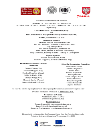 Welcome to the International Conference QUALITY OF LIFE AND SPATIAL COHESION INTERACTION OF DEVELOPMENT AND WELL-BEING IN THE LOCAL CONTEXT organized by Central Statistical Office of Poland (CSO) and The Cardinal Stefan Wyszynski University in Warsaw (CSWU) Warsaw, November 17-18, 2016 Honorary Committee Dominik Rozkrut, President of the CSO Rev. Prof. Stanisław Dziekoński, Rector of the CSWU Abp. Henryk Hoser Prof. Józefa Hrynkiewicz, Parliament RP Adam Struzik, Marshal of Masovian Voivodeship Jerzy Kwieciński, Secretary of State – Ministry of Development Keynote Speakers Graham Kalton (Westat, USA) Filomena Maggino (University of Florence, Italy) International Scientific Advisory Committee Graham Kalton (USA) Filomena Maggino (Italy) Czesław Domański (Poland) Misha Belkindas (USA) Zhanjun Xing (China) Sławomir Zaręba (Poland) Semen Matkowski (Ukraine) Scientific Organization Committee Włodzimierz Okrasa Dominika Rogalińska Renata Bielak Elżbieta Bojanowska Andrzej Ochocki Marek Cierpiał-Wolan Henryk Skorowski Krzysztof Zagórski Tomasz Korczyński Grigoris Zarotiadis To view the call for papers please visit: https://qualityoflifeandspatialcohesion.wordpress.com/ Deadline for abstract submission is 15 October, 2016. Conference co-Chairs Włodzimierz Okrasa (CSWU) Dominika Rogalińska (CSO) Contact persons: Tomasz Korczyński: [email protected] Iwona Miziołek: [email protected] Katarzyna Pomianowska: [email protected] The project is co-financed by the European Union from the Cohesion Fund under Technical Assistance Operational Programme 2014-2020.