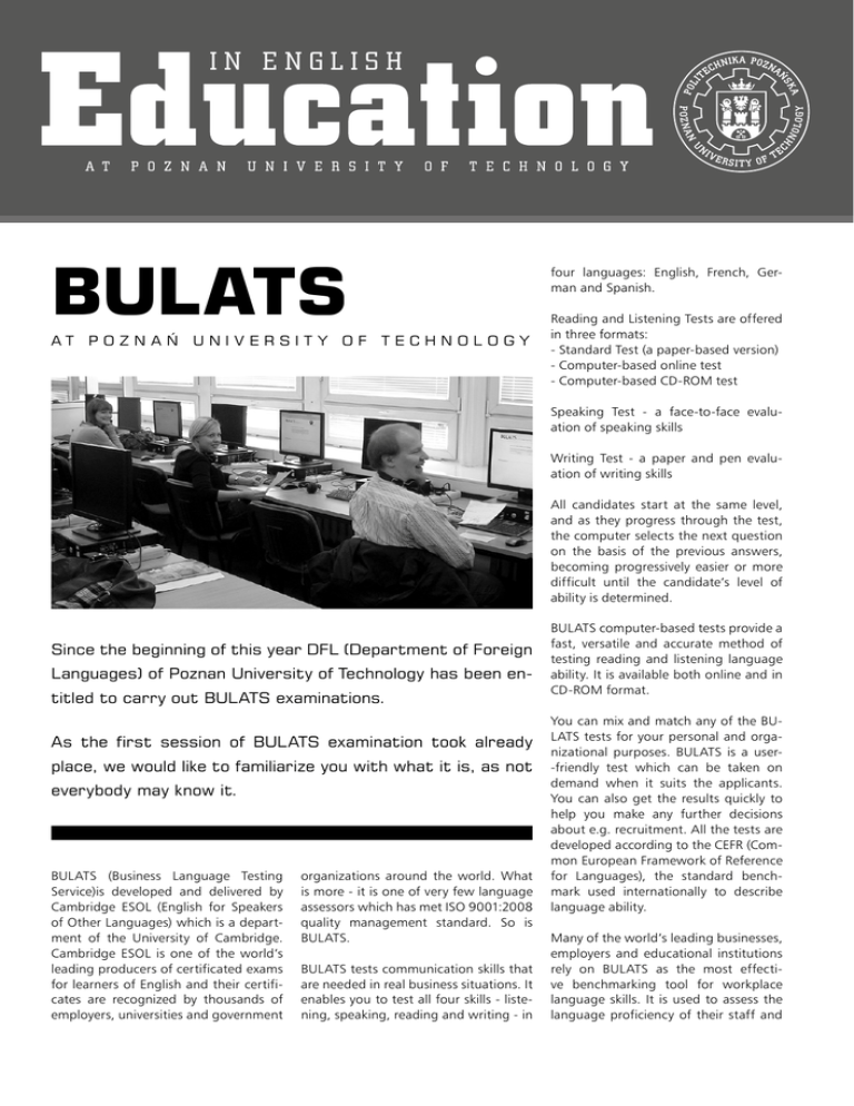 IN ENGLISH BULATS AT POZNAŃ UNIVERSIT Y OF TECHNOLOGY four languages: English, French, German and Spanish. Reading and Listening Tests are offered in three formats: - Standard Test (a paper-based version) - Computer-based online test - Computer-based CD-ROM test Speaking Test - a face-to-face evaluation of speaking skills Writing Test - a paper and pen evaluation of writing skills All candidates start at the same level, and as they progress through the test, the computer selects the next question on the basis of the previous answers, becoming progressively easier or more difficult until the candidate’s level of ability is determined. Since the beginning of this year DFL (Department of Foreign Languages) of Poznan University of Technology has been entitled to carry out BULATS examinations. As the first session of BULATS examination took already place, we would like to familiarize you with what it is, as not everybody may know it. BULATS (Business Language Testing Service)is developed and delivered by Cambridge ESOL (English for Speakers of Other Languages) which is a department of the University of Cambridge. Cambridge ESOL is one of the world’s leading producers of certificated exams for learners of English and their certificates are recognized by thousands of employers, universities and government organizations around the world. What is more - it is one of very few language assessors which has met ISO 9001:2008 quality management standard. So is BULATS. BULATS tests communication skills that are needed in real business situations. It enables you to test all four skills - listening, speaking, reading and writing - in BULATS computer-based tests provide a fast, versatile and accurate method of testing reading and listening language ability. It is available both online and in CD-ROM format. You can mix and match any of the BULATS tests for your personal and organizational purposes. BULATS is a user-friendly test which can be taken on demand when it suits the applicants. You can also get the results quickly to help you make any further decisions about e.g. recruitment. All the tests are developed according to the CEFR (Common European Framework of Reference for Languages), the standard benchmark used internationally to describe language ability. Many of the world’s leading businesses, employers and educational institutions rely on BULATS as the most effective benchmarking tool for workplace language skills. It is used to assess the language proficiency of their staff and students and it is helpful in making key decisions about recruitment, training, promotion and placement of staff. If you would like to see a demonstration of the BULATS Online test or get more detail on technical specification or to know much more about exam, visit: www.BULATS.org www.dfl.put.poznan.pl We are pleased to inform you that the first BULATS session took place on 9.02.2012 and 21 candidates seated the exam. Because this was the first session the candidates were asked to share their impressions and all remarks on preparation and organization of the exam. they said, it was very convenient. Also the test was clear and easy to operate and the speakers did not talk to fast. For others it was long and a bit stressful and the noise of computer distracting ... But the final results of the exam were really satisfying. Congratulations! For some students the test was quite difficult, a specially the reading part, but they liked the computerized version and Adapted by Wiktoria Tyszka-Ulężałka Saint Patrick’s Day S aint Patrick’s Day is a Catholic festival celebrated nowadays all over the world. However, Saint Patrick is a patron saint of Ireland and it is there where the celebration is the most vivid and the most famous. It is a national holiday in the Republic of Ireland and Northern Ireland. St. Patrick's Day is usually celebrated on March 17, but Ireland's bishops have shifted the feast day in 2008, in honor of the national saint, to Saturday, March 15. On this day, there are big parades in most of the Irish cities. Saint Patrick's Day parades in Ireland date from the late 19th century, originating in the growing sense of Irish nationalism. People usually drink some alcoholic beverages (lager dyed green, Beyond the Language! E N G L I S H - S P E A K I N G Irish beer such as Murphys, Smithwicks, Harp or Guinness, or Irish whiskey, Irish Coffee or Baileys Irish Cream) and wear at least one article of green-colored clothing. According to the legend, Saint Patrick used the shamrock, a three-leaved plant, to explain the Holy Trinity to the pre-Christian Irish people. As well as being a celebration of Irish culture, Saint Patrick's Day is a Christian festival celebrated in the Catholic Church, the Church of Ireland and some other denominations. The day always falls in the season of Lent and sometimes during Holy Week. C O U N T R I E S Q U I Z ENGLAND M any students thrive on competition! Contests encourage them to push themselves to their limits. Therefore, every year the Department of Modern Languages (DML), reaching out to its students, organizes Contests on the Knowledge of Culture of Different Language Areas (Konkurs Wiedzy o Krajach Różnych Obszarów Językowych). It all started 3 years ago and every year there are at least 6-7 editions. Contests regard current events, literature, civil engineering, art, architecture and broadly defined culture, e.g. Halloween, Thanksgiving, Famous Bridges, Famous Places in London, British Royal Family, British Writers or Christmas Wishes, New Wonders of the World. 2 GŁOS POLITECHNIKI | MARZEC 2012 The contest is designed to encourage students to include culture in their language education, spark student interest in the subject, and increase their awareness of the fact that language should be conceived of as culturally embedded rather than as abstract. The contest editions usually last about 4 weeks and are displayed in a showcase, however, last year we also launched an 