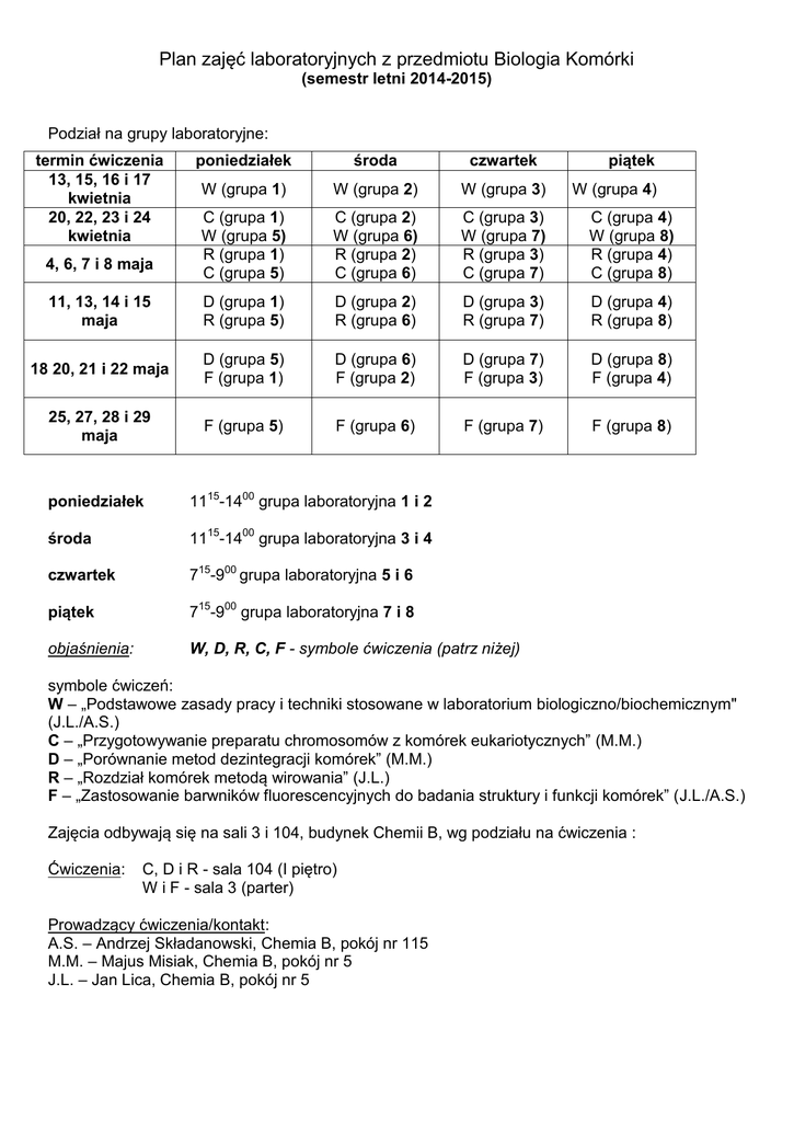 Plan zajęć laboratoryjnych z przedmiotu Biologia Komórki (semestr letni 2014-2015) Podział na grupy laboratoryjne: termin ćwiczenia 13, 15, 16 i 17 kwietnia 20, 22, 23 i 24 kwietnia poniedziałek środa czwartek W (grupa 1) W (grupa 2) W (grupa 3) C (grupa 1) W (grupa 5) R (grupa 1) C (grupa 5) C (grupa 2) W (grupa 6) R (grupa 2) C (grupa 6) C (grupa 3) W (grupa 7) R (grupa 3) C (grupa 7) C (grupa 4) W (grupa 8) R (grupa 4) C (grupa 8) 11, 13, 14 i 15 maja D (grupa 1) R (grupa 5) D (grupa 2) R (grupa 6) D (grupa 3) R (grupa 7) D (grupa 4) R (grupa 8) 18 20, 21 i 22 maja D (grupa 5) F (grupa 1) D (grupa 6) F (grupa 2) D (grupa 7) F (grupa 3) D (grupa 8) F (grupa 4) 25, 27, 28 i 29 maja F (grupa 5) F (grupa 6) F (grupa 7) F (grupa 8) 4, 6, 7 i 8 maja poniedziałek 1115-1400 grupa laboratoryjna 1 i 2 środa 1115-1400 grupa laboratoryjna 3 i 4 czwartek 715-900 grupa laboratoryjna 5 i 6 piątek 715-900 grupa laboratoryjna 7 i 8 objaśnienia: W, D, R, C, F - symbole ćwiczenia (patrz niżej) piątek W (grupa 4) symbole ćwiczeń: W – „Podstawowe zasady pracy i techniki stosowane w laboratorium biologiczno/biochemicznym" (J.L./A.S.) C – „Przygotowywanie preparatu chromosomów z komórek eukariotycznych” (M.M.) D – „Porównanie metod dezintegracji komórek” (M.M.) R – „Rozdział komórek metodą wirowania” (J.L.) F – „Zastosowanie barwników fluorescencyjnych do badania struktury i funkcji komórek” (J.L./A.S.) Zajęcia odbywają się na sali 3 i 104, budynek Chemii B, wg podziału na ćwiczenia : Ćwiczenia: C, D i R - sala 104 (I piętro) W i F - sala 3 (parter) Prowadzący ćwiczenia/kontakt: A.S. – Andrzej Składanowski, Chemia B, pokój nr 115 M.M. – Majus Misiak, Chemia B, pokój nr 5 J.L. – Jan Lica, Chemia B, pokój nr 5 Warunki BHP i zasady zaliczenia przedmiotu Biologia Komórki - laboratorium 1. Ze względu na przepisy BHP oraz ochronę odzieży, studenci obowiązani są do noszenia fartuchów ochronnych w czasie trwania ćwiczeń. Proszę również ściśle przestrzegać wskazówek prowadzącego ćwiczenia w zakresie sposobu i bezpieczeństwa pracy podczas wykonywania ćwiczeń. 2. Podczas zajęć podgrupy ćwiczeniowe (3-4 osoby) wykonują ćwiczenia na podstawie instrukcji i przy pomocy prowadzących. Obowiązuje także przygotowanie teoretyczne do zajęć na podstawie materiałów dostępnych u prowadzącego ćwiczenie lub na stronie domowej Katedry Technologii Leków i Biochemii. Przygotowanie studentów do zajęć jest sprawdzane przez prowadzącego ćwiczenie w formie krótkiego (5 minut) testu pisemnego ocenianego w skali 0-5 punktów. 3. Każda podgrupa ćwiczeniowa przygotowuje raport wg zasad podanych przez prowadzącego (oprócz ćwiczenia nr 1). Raport przygotowywany jest wspólnie przez całą grupę a ocena punktowa w skali 0-10 (patrz zasady oceny poniżej) wystawiana dla wszystkich członków grupy. Raport powinien dotrzeć do prowadzącego dane ćwiczenie w ciągu najpoźniej 2 tygodni od dnia, w którym wykonywano ćwiczenie. Sposób przekazania raportu jest dowolny (osobiście, wysłać pocztą, e-mail) musi być jednak skuteczny. Nieoddanie sprawozdania w podanym terminie jest równoznaczne z otrzymaniem przez całą grupę 0 punktów z raportu. Sposób oceny raportów z wykonania ćwiczenia wstęp teoretyczny opis wykonania ćwiczenia prezentacja wyników (obliczenia, przygotowanie wykresów itp.) wnioski 2 pkt 2 pkt 3 pkt 3 pkt razem max. 10 pkt Raport z ćwiczenia nr 4 oceniany jest odmiennie tzn. pomysł opis graficzna strona raportu źródło informacji (internet, książka, artykuł z czasopisma naukowego itp. 3 pkt 2 pkt 2 pkt 3 pkt razem max. 10 pkt 4. Nieusprawiedliwiona nieobecność podczas ćwiczenia powoduje jego niezaliczenie (nie ma możliwości odrabiania ćwiczeń!) i otrzymanie 0 pkt zarówno z kartkówki jak i raportu. W przypadku usprawiedliwionej nieobecności ćwiczenie należy zaliczyć (ustnie lub pisemnie) u prowadzącego ćwiczenie. Prowadzący wyznaczy godziny konsultacji, w czasie których można będzie zaliczać ćwiczenia. W tym wypadku nie przyznawane są punkty za przygotowanie raportu. 5. Ocena końcowa wystawiana jest na podstawie całkowitej ilości punktów uzyskanych z poszczególnych ćwiczeń, wynikających z obecności na zajęciach, ocen ze sprawozdań, ocen z kontroli przygotowania do ćwiczeń, innych uwag prowadzącego ćwiczenia.