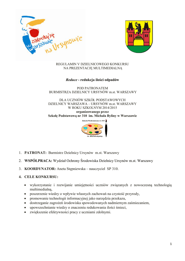 REGULAMIN V DZIELNICOWEGO KONKURSU NA PREZENTACJĘ MULTIMEDIALNĄ Reduce - redukcja ilości odpadów POD PATRONATEM BURMISTRZA DZIELNICY URSYNÓW m.st. WARSZAWY DLA UCZNIÓW SZKÓŁ PODSTAWOWYCH DZIELNICY WARSZAWA – URSYNÓW m.st. WARSZAWY W ROKU SZKOLNYM 2014/2015 organizowanego przez Szkołę Podstawową nr 310 im. Michała Byliny w Warszawie 1. PATRONAT: Burmistrz Dzielnicy Ursynów m.st. Warszawy 2. WSPÓŁPRACA: Wydział Ochrony Środowiska Dzielnicy Ursynów m.st. Warszawy 3. KOORDYNATOR: Aneta Stępniewska – nauczyciel SP 310. 4. CELE KONKURSU: wykorzystanie i rozwijanie umiejętności uczniów związanych z nowoczesną technologią multimedialną, poszerzenie wiedzy o wpływie własnych zachowań na czystość przyrody, promowanie technologii informacyjnej jako narzędzia przekazu, dostrzeganie zagrożeń środowiska spowodowanych nadmiernym zaśmiecaniem, upowszechnianie wiedzy o znaczeniu redukowania ilości śmieci, zwiększenie efektywności pracy z uczniami zdolnymi. 1 5. TEMAT KONKURSU: Reduce - redukcja ilości odpadów 6. WARUNKI UCZESTNICTWA: Konkurs adresowany jest dla uczniów klas IV-VI szkół podstawowych na Ursynowie. Przedmiotem konkursu jest przygotowanie prezentacji multimedialnej w programie PowerPoint lub OpenOffice Impress na powyższy temat (rozszerzenie pliku .pps lub .ppt; nazwa pliku według wzoru: imię i nazwisko autora_ Szkoła_ nazwisko opiekuna). Pracę uczniowie wykonują samodzielnie pod nadzorem nauczyciela. Prezentacja powinna zawierać maksymalnie 15 slajdów. Wskazane jest, aby treści zawarte w prezentacji zilustrowane zostały opracowanymi komputerowo elementami multimedialnymi: podkład muzyczny, głos narratora, fragmenty filmów, rysunki, zdjęcia. Można wykorzystać inne programy graficzne czy programy do tworzenia animacji komputerowych. Na ostatnim slajdzie należy zamieścić informacje dotyczące wykorzystanych tekstów, rysunków, zdjęć, muzyki, itp. (źródło, tytuł i autor). Prace konkursowe nie mogą być plagiatami prac zamieszczonych w sieci Internet oraz nie mogą naruszać zasad praw autorskich – naruszenie tego warunku spowoduje automatyczne usunięcie takiej prezentacji z naszego konkursu. Prezentacje należy przesłać wraz z zeskanowanymi załącznikami na adres: [email protected] Do etapu międzyszkolnego (dzielnicowego) składamy nie więcej niż pięć prac ze szkoły. Organizator przyjmuje prace szkolnych laureatów wraz z protokołem zgłoszenia i zgodami rodziców (patrz załączniki) w formie elektronicznej (zeskanowane). Prace bez protokołu zgłoszenia nie będą podlegać ocenie. Prace zbiorowe nie będą oceniane. Ocenie podlegać będzie: estetyka, oryginalność, ciekawe rozwiązania tematyczne, interesująca puenta, zgodność pracy z tematem, przejrzystość i spójność prezentacji. 7. FINAŁ: Prace wraz ze zeskanowanymi załącznikami należy przesłać do dnia 24 marca 2015 r.(do Pani Anety Stępniewskiej) na adres mailowy: [email protected] 8. OPRACOWANIE REGULAMINU KONKURSU: Maria Kosińska, Aneta Stępniewska 9. KOMISJA KONKURSOWA: Przewodniczący: Aneta Stępniewska Członkowie Komisji: Beata Żak Joanna Wyczółkowska Mateusz Dudek Katarzyna Wardawa - Stec 2 Załączniki do regulaminów Załącznik nr 1 DEKLARACJA DLA RODZICÓW / PRAWNYCH OPIEKUNÓW UCZNIA Ja niżej podpisany, działający w imieniu i na rzecz mojego dziecka .............................................................................................................................................. (imię i nazwisko dziecka) Matka (opiekun dziecka)/.................................................................................................................... Imię, nazwisko Adres zamieszkania ...................................................................................................................... .... Matka (opiekun dziecka)/.................................................................................................................... Imię, nazwisko Adres zamieszkania .................................................................................................................... ..... wyrażam zgodę na publikowanie danych osobowych oraz publiczne udostępnianie, wystawianie i odtwarzanie prac mojego dziecka wykonanych na konkurs „Dla Ziemi” „Reduce-redukcja ilości odpadów” - organizowany przez Szkołę Podstawową nr 310 w Warszawie w roku szkolnym 2014/2015. ……………………………………… ……...……………..………….……………………… Data …………………………………………………………. Czytelny podpis rodziców(opiekunów) 3 Załącznik nr 2 Do wiadomości: Nauczyciel SP 310 Aneta Stępniewska PROTOKÓŁ ZGŁOSZENIA LAUREATA DO KONKURSU NA PREZENTACJĘ MULTIMEDIALNĄ „Reduce-redukcja ilości odpadów” DLA UCZNIÓW klas IV – VI SZKÓŁ PODSTAWOWYCH DZIELNICY WARSZAWA – URSYNÓW W ROKU SZKOLNYM 2014/2015 Pieczątka szkoły ……………………………………………………… Imię i nazwisko laureata LP. Imię i nazwisko nauczyciela, który przygotował ucznia 1 2 3 4 5 Pieczątka i podpis Dyrektora Szkoły ………………………………………….. Skład i podpisy Komisji Konkursowej: ………………………………………………. ……………………………………………….. ……………………………………………….. Uwaga! PROSZĘ WYPEŁNIĆ WYŁĄCZNIE LITERAMI DRUKOWANYMI LUB KOMPUTEROWO 4