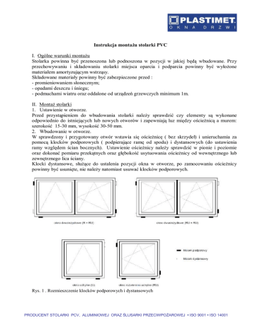 Instrukcja montażu stolarki PVC I. Ogólne warunki montażu Stolarka powinna być przenoszona lub podnoszona w pozycji w jakiej będą wbudowane. Przy przechowywaniu i składowaniu stolarki miejsca oparcia i podparcia powinny być wyłożone materiałem amortyzującym wstrząsy. Składowane materiały powinny być zabezpieczone przed : - promieniowaniem słonecznym; - opadami deszczu i śniegu; - podmuchami wiatru oraz oddalone od urządzeń grzewczych minimum 1m. II. Montaż stolarki 1. Ustawienie w otworze. Przed przystąpieniem do wbudowania stolarki należy sprawdzić czy elementy są wykonane odpowiednio do istniejących lub nowych otworów i zapewniają luz między ościeżnicą a murem: szerokość 15-30 mm, wysokość 30-50 mm. 2. Wbudowanie w otworze. W sprawdzony i przygotowany otwór wstawia się ościeżnicę ( bez skrzydeł) i unieruchamia za pomocą klocków podporowych ( podpierające ramę od spodu) i dystansowych (do ustawienia ramy względem ścian bocznych). Ustawienie ościeżnicy należy sprawdzić w pionie i poziomie oraz dokonać pomiaru przekątnych oraz głębokość usytuowania ościeżnicy od wewnętrznego lub zewnętrznego lica ściany. Klocki dystansowe, służące do ustalenia pozycji okna w otworze, po zamocowaniu ościeżnicy powinny być usunięte, nie należy natomiast usuwać klocków podporowych. Rys. 1 . Rozmieszczenie klocków podporowych i dystansowych PRODUCENT STOLARKI PCV, ALUMINIOWEJ ORAZ ŚLUSARKI PRZECIWPOŻAROWEJ • ISO 9001 • ISO 14001 3. Zamocowanie w otworze. Zamocowania powinny być rozmieszczone na całym obwodzie ościeżnicy zgodnie z rys.2 Rys. 2. Rozmieszczenie punktów mocowania na elementach poziomych okna A – odstęp miedzy punktami mocowania max 700 mm E – odstęp od narożnika wewnętrznego kształtownika – min. 150 mm P – odstęp od krawędzi słupka i ślemienia – min. 150 mm Podstawową techniką mocowania jest montaż za pomocą kotew montażowych, które jednym końcem przytwierdza się do zewnętrznej ścianki ościeżnicy np. przez zakleszczenie w specjalnym wyżłobieniu. Drugim końcem kotwę montuje się do ościeża za pomocą kołków lub śrub o średnicy co najmniej 8 mm.( w przypadku Porothermu zastosować 2 śruby o średnicy co najmniej 8 mm i długości min.120 mm Zamiennie dopuszcza się mocowanie za pomocą tulei rozprężnych, kołków rozporowych (dybli) lub wkrętów ( śrub) wprowadzanych do ościeża przez przewierconą ościeżnicę. Uwaga! Dolny profil ościeżnicy można mocować wyłącznie za pomocą kotew montażowych. Po zamocowaniu ościeżnicy należy na niej zawiesić skrzydła. 4. Uszczelnienie. Uszczelnienie przestrzeni pomiędzy ościeżnicą a ościeżem wykonuje się za pomocą pianki poliuretanowej w taki sposób, by pianka po spęcznieniu wypełniła całą szczelinę, nie rozlewając się jednak na boczne powierzchnie ościeżnicy. Przy wyborze pianki montażowo – uszczelniającej należy uwzględnić temperaturę przy jakiej będzie wykonywany montaż. W okresie zimowym należy bezwzględnie stosować piankę przystosowaną w niskich temperaturach ( należy przestrzegać zalecenia producenta pianki). Montaż może być prowadzony w temperaturze do – 10oC. Po zawiązaniu pianki obciąć nadmiar równo z ramą okna i sprawdzić sprawność działania skrzydeł i dokonać ewentualnej regulacji III. Prace wykończeniowe ( dotyczy ekip tynkujących i sprzątających) Przy wykonywaniu robót tynkarskich po zamontowaniu okien muszą być one zabezpieczone przed zabrudzeniem i zarysowaniem taśmą lub folią zabezpieczającą. Podokiennik od zewnątrz zamocować nie zakrywając otworów odwadniających. Po wykonaniu wszystkich prac związanych z wbudowaniem, montażem , wykończeniem wszystkie elementy okien należy wyczyścić odpowiednimi środkami oraz usunąć taśmę zabezpieczającą. Folie ochronną należy zerwać najpóźniej po upływie 3 miesięcy od zamontowania okna. Ełk, wrzesień 20008 PRODUCENT STOLARKI PCV, ALUMINIOWEJ ORAZ ŚLUSARKI PRZECIWPOŻAROWEJ • ISO 9001 • ISO 14001