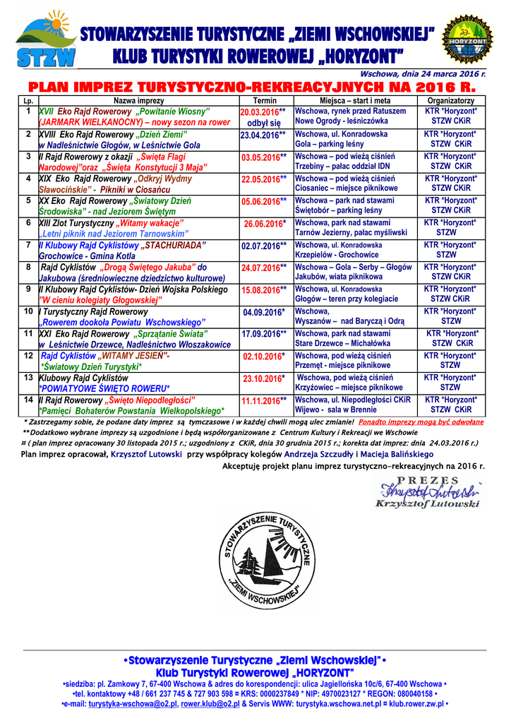 Plan imprez na 2016 rok - "Horyzont" Wschowa