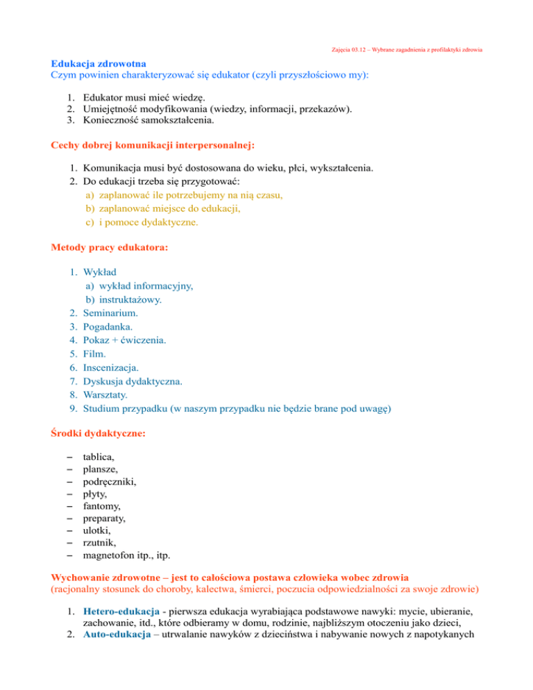 Zajęcia 03.12 – Wybrane zagadnienia z profilaktyki zdrowia Edukacja zdrowotna Czym powinien charakteryzować się edukator (czyli przyszłościowo my): 1. Edukator musi mieć wiedzę. 2. Umiejętność modyfikowania (wiedzy, informacji, przekazów). 3. Konieczność samokształcenia. Cechy dobrej komunikacji interpersonalnej: 1. Komunikacja musi być dostosowana do wieku, płci, wykształcenia. 2. Do edukacji trzeba się przygotować: a) zaplanować ile potrzebujemy na nią czasu, b) zaplanować miejsce do edukacji, c) i pomoce dydaktyczne. Metody pracy edukatora: 1. Wykład a) wykład informacyjny, b) instruktażowy. 2. Seminarium. 3. Pogadanka. 4. Pokaz + ćwiczenia. 5. Film. 6. Inscenizacja. 7. Dyskusja dydaktyczna. 8. Warsztaty. 9. Studium przypadku (w naszym przypadku nie będzie brane pod uwagę) Środki dydaktyczne: – – – – – – – – – tablica, plansze, podręczniki, płyty, fantomy, preparaty, ulotki, rzutnik, magnetofon itp., itp. Wychowanie zdrowotne – jest to całościowa postawa człowieka wobec zdrowia (racjonalny stosunek do choroby, kalectwa, śmierci, poczucia odpowiedzialności za swoje zdrowie) 1. Hetero-edukacja - pierwsza edukacja wyrabiająca podstawowe nawyki: mycie, ubieranie, zachowanie, itd., które odbieramy w domu, rodzinie, najbliższym otoczeniu jako dzieci, 2. Auto-edukacja – utrwalanie nawyków z dzieciństwa i nabywanie nowych z napotykanych w okresie dojrzewania wzorców (od rówieśników, z mediów, w czasie szukania swoich autorytetów) 3. Hetero-edukacja odwrócona – jest to moment, w którym zaczynamy edukować inne osoby (wygłaszamy opinie, informujemy o według nas dobrych nawykach, wzorach do naśladowania itd.) Zakażenia wewnątrz szpitalne Jest to zakażenie, które nastąpiło w szpitalu, ujawniło się podczas hospitalizacji (podczas pobytu minimum 48 godz. od chwili przyjęcia), lub po wypisaniu się ze szpitala i zostało udokumentowane epidemiologicznie (czynnik chorobotwórczy pochodził od innego pacjenta, personelu, lub złych warunków higienicznych panujących w szpitalu, itd.) Źródła zakażeń: – pacjent – personel – odwiedzający – otoczenie (narzędzia, sprzęt, przybory pacjenta itd.) Drogi siania się (roznoszenia) zakażeń: 1. Złe warunki pracy (socjalne itd.) 2. Niewłaściwy podział pracy (przykładowo złe rozplanowanie w salach „brudnych” i „czystych” pracy). 3. Przyjmowanie chorych wymagających szczególnych warunków hospitalizacji, bez możliwości zapewnienia tych warunków. 4. Stałe noszenie biżuterii (zegarków, bransoletek, kolczyków itp.) 5. Zbyt długie paznokcie 6. itd. ODLEŻYNY Odleżyna – długotrwały ucisk powodujący miejscowe zaburzenia ukrwienia, a tym samym niedotlenienie i niedożywienie tkanek. Rezultatem tych czynników jest martwica. Przyczyny powstawania odleżyn: – długotrwałe unieruchomienie, – nietrzymanie moczu i stolca, – zaburzenie, lub brak czucia bólu, – stan ogólny odżywienia pacjenta (nadwaga, niedowaga), – dodatkowe choroby (cukrzyca, miażdżyca, …), – zakażenia skóry i wewnętrzne. Dodatkowymi przyczynami są: – tarcie (przesuwanie ciała bez unoszenia go), – przesuwanie części lub całego ciała w sposób powodujący fałdowanie skóry, – no i zapewne wszelkie pofałdowania bielizny pościelowej, osobistej, okruchy, resztki papieru, waciki znajdujące się w pościeli. Klasyfikacja odleżyn! 1. Blednące zaczerwienienia, rumień (skóra nie jest uszkodzona). 2. Nieblednące powiększające się zaczerwienienia, powierzchowna nadżerka, przerwanie ciągłości skóry (naskórka), mogą pojawić się pęcherze i pierwszy ból (szczypanie, pieczenie). 3. Głębokie uszkodzenie skóry (naskórka i skóry właściwej), widoczne ubytki tkanki, rana otoczona rumieniem i obrzękiem. (dno rany może być wypełnione czerwoną ziarnicą (proces gojenia się rany), lub żółtą masą (rozpadające się tkanki). 4. Uszkodzenia, które dochodzą aż do kości, występujące martwice, odczyn zapalny kości i stawów (dno takiej odleżyny jest często pokryte czarną martwicą) 5. Zaawansowana martwica, obejmuje oprócz tkanek skórnych powięzie, co już jest dużym ryzykiem wystąpienia zakażenia, sepsy. Wskazówki dla pacjentów, narażonych na wystąpienie odleżyn: 1. Bardzo dokładne, codzienne mycie całego ciała i dokładne jego wysuszenie 2. Raz dziennie powinno się obejrzeć miejsca narażone na odleżyny 3. Cała bielizna osobista, pościelowa powinny być bawełniane (u osób zagrożonych odleżynami wszystko powinno być bezszwowe) 4. Używamy tylko i wyłącznie pościeli niekrochmalonej 5. Nie wolno stosować wilgotnej pościeli i bielizny 6. Prześcieradło i podkłady, muszą być naciągnięte na materac (bez fałd) 7. U chorego zagrożonego odleżynami prześcieradło i podkłady muszą być wytrzepane, lub zmiecione myjką dla pozbycia się okruchów, czy innych szczątków papierów, bądź wacików 8. Nie wolno masować wyniosłości kostnych 9. Zmiana pozycji ciała pacjenta zagrożonego ryzykiem odleżyn, musi się odbyć co 2 godz. !!! 10. Stosowanie zapobiegawczych udogodnień – kółko pod pośladki, wałki, kliny, krążki pod łokcie, pod pięty (jedynym niestosowanym jest wałek pod kolana) 11. Unikamy jednoczesnego stosowania pudru i oliwki 12. Wietrzenie miejsc narażonych na odleżyny (odkrycie pacjenta, zrobienie „namiociku”) 13. Materac obowiązkowo przeciwodleżynowy – zmiennociśnieniowy, pneumatyczny, bąbelkowy itd. 14. Ruszanie się – ćwiczenia bierne i czynne 15. Odżywianie pacjenta zagrożonego – obowiązuje dieta wysokobiałkowa i wysokowitaminowa (ograniczenie spożycia cukru) 16. Miejsca narażone na odleżyny należy natłuścić Praca domowa: najczęstsze miejsca występowania odleżyn u leżących na wznak i na boku.