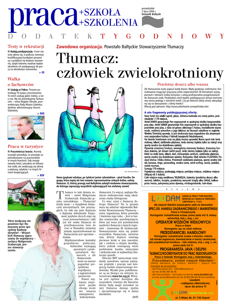 praca +SZKOŁA +SZKOLENIA D O D A T E K T Y G poniedzia∏ek 3 lipca 2006 r. Dziennik Ba∏tycki O D N I O W Y Testy w rekrutacji Zawodowa organizacja. Powsta∏o Ba∏tyckie Stowarzyszenie T∏umaczy Badajà predyspozycje. Coraz cz´Êciej zdarza si´, i˝ podczas rozmowy kwalifikacyjnej kandydaci proszeni sà o poddanie si´ badaniu testowemu, dzi´ki któremu mo˝liwe b´dzie okreÊlenie ich predyspozycji do pracy na okreÊlonym stanowisku. Tłumacz: człowiek zwielokrotniony > III Walka o fachowców Przelotny deszcz albo wanna Z∏e t∏umaczenie mo˝e popsuç ka˝dy biznes. B∏´dy j´zykowe, niefortunne sformu∏owania mogà byç przyczynà wielu nieporozumieƒ. W formalnych wystàpieniach i tekstach trzeba korzystaç z us∏ug profesjonalnie przygotowanych do t∏umaczeƒ osób. Przyk∏adem niech b´dzie polskoj´zyczna wersja internetowej strony jednego z tureckich hoteli. Czy po lekturze takiej strony zdecydujemy si´ na skorzystanie z oferty hotelu? Wiecej pod adresem: http://www.seherhotels.com/pol/index.htm Szukajà w Polsce. Finowie potrzebujà 10 tysi´cy stoczniowców. To niech szukajà gdzie indziej, a nie u nas. My te˝ potrzebujemy fachowców – mówi Bogdan Oleszek, przewodniczàcy Rady Miasta Gdaƒska, dyrektor administracyjny Stoczni Gdaƒskiej A oto fragmenty polskoj´zycznej oferty: Praca w turystyce Pracotwórcza bran˝a. Rozwój turystyki powoduje, ˝e powstaje zapotrzebowanie na pracowników w innych bran˝ach. Gdy zostaje otwarty hotel, zatrudnia on kilkanaÊcie osób, ale zwi´kszajà si´ obroty u piekarzy, rybaków i w innych firmach kooperujàcych. > XIV Rys. Bart∏omiej Brosz Iloma j´zykami w∏adasz, po tylekroç jesteÊ cz∏owiekiem – pisa∏ Goethe. Do grupy, która lepiej ni˝ inni rozumie reprezentantów ró˝nych kultur, nale˝à t∏umacze. Ci, którzy pracujà nad Ba∏tykiem za∏o˝yli niedawno stowarzyszenie, do którego zapraszajà wszystkich wykonujàcych ten nie∏atwy zawód. T Tekst medyczny nie powinien byç t∏umaczony przez specjalist´ budowy okr´tów! – Wszystkich t∏umaczy zapraszamy do wspó∏pracy – zach´ca Ma∏gorzata Grabarczyk, prezes stowarzyszenia. ∏umacz to taki dziwny zawód – mówi Ma∏gorzata Grabarczyk, t∏umaczka j´zyka szwedzkiego. – T∏umaczyç ka˝dy mo˝e – z wyjàtkiem t∏umaczeƒ wierzytelnych, tzw. przysi´g∏ych, bo nikt nie pyta t∏umacza o dyplomy, dokumenty. ZnajomoÊç j´zyków obcych staje si´ coraz powszechniejsza i nikt ju˝ nie szuka t∏umacza do przet∏umaczenia listu do cioci w Kanadzie, niemniej jednak, zapotrzebowanie na t∏umaczenia jest ogromne – dodaje. Mi´dzynarodowe kontakty gospodarcze, polityczne, kulturalne wymagajà sprawnych i profesjonalnych t∏umaczeƒ, a z∏e t∏umaczenie mo˝e na zawsze pogrzebaç perspektyw´ wspó∏pracy z zagranicznym partnerem. Nawet najlepsza znajomoÊç j´zyka obcego wcale nie oznacza umiej´tnoÊci wykonywania Nasz hotel ma wielki ogród, plaza. Glówna budowla ma cztery pietro, podniesienie i 179 miejsce. Hotel SEHER gwarantuje Pan wyposzynek w spokojnej okolicy bezposrednio przy plaz. Hotel SEHER gwarantuje Pan wyposzynek w spokojnej okolicy bezposrednio przy plaz, z dala od gwaru ulieznego i halasu, krystalieznie ezysta wode, rodzinna atmosfere a jego bliskosc do lieznysh zabytkow w regionie Riwiery Tureckiej sprawia, iz jest doskonala baza wypadowa dla aktywnysh oraz pasjonalow kultury i historii (wyejeszki fakultatywne). Na terenie hotelowym oraz na pla˝y mozna uprawiaç liezne sport min tenis stolowy, bilard, siatkówke pla˝owa, tenis ziemny (oplata tylko za raiety) oraz sporty wodne (za dodatkowa oplata). Plywanie zrzeszony fundusz, wewn´trzny zrzeszony fundusz, Zrzeszony fundusz dziecka, jet stream (whirl pool), tenis ziemny (oplata tylko za raiety), k∏aÊç na stole tenis, bilard, dart, Gimnastyka centrum, siatkówke pla˝owa, sporty wodne (za dodatkowa oplata), Rozrywka, Klub dziecka PLA˚OWA: Parasol s∏oƒca i ∏ó˝ka s∏oƒca. Przestrzeƒ siatkówke pla˝owa, sporty wodne (Jet ski, banana, ringo, parasailing, wodna narta, wind surfing, canoe, pedalo), statek tournee. Sumujà 179 miejsce. Pojedynczy miejsce, podwajajà miejsce, potrójna miejsce, rodzinna miejsce (Wi´cej ni˝ 3 ludzie). Ca∏e miejsce majà satelitowa TELEWIZJA, ∏azienka (przelotny deszcz albo wanna), telefon, muzyka, powietrzny warunek (ciep∏y albo ch∏ód), balkon przez morze, pokrywany przez dywany, minizagrodzenie, hair-dryer. R t∏umaczeƒ. Co wi´cej, najlepsi t∏umacze niekoniecznie majà ukoƒczone studia filologiczne. Co wi´c czyni z t∏umacza dobrego t∏umacza? Na to pytanie stara si´ udzielaç odpowiedzi Ba∏tyckie Stowarzyszenie T∏umaczy – nowa organizacja, która powsta∏a 1 kwietnia tego roku. – Jest to bardzo nowatorskie przedsi´wzi´cie, które ju˝ teraz jest przedmiotem zazdroÊci t∏umaczy z innych regionów – komentuje M. Grabarczyk. Stowarzyszenie stara si´ pomóc wszystkim t∏umaczom, zarówno tym, którzy dopiero stawiajà pierwsze kroki w tym zawodzie, jak i osobom o du˝ym dorobku, które jednak rozwiàzujà wiele problemów bardzo intuicyjnie i niekoniecznie w najbardziej skuteczny sposób. Obecnie BST opracowuje standardy zawodowe, opisuje najlepsze praktyki i pracuje nad integracjà bardzo rozproszonego Êrodowiska. Wyniki prac publikowane sà na bie˝àco na witrynie internetowej www.bst.org.pl. Witryna jest ogólnie dost´pna dla wszystkich, równie˝ dla klientów, którzy b´dà mogli wyszukaç na niej t∏umacza danego j´zyka i specjalizujàcego si´ w danej dziedzinie. (pub) E K L A M A AGENCJA PRACY TYMCZASOWEJ, REKRUTACJA I SELEKCJA PERSONELU CERTYFIKAT nr 713/3 dla naszych Klientów poszukujemy osób na stanowiska: SPEC.DS. HANDLU ZAGRANICZNEGO I MARKETINGU Praca w Chwaszczynie Wymagania: wykszta∏cenie wy˝sze, prawo jazdy kat. B, w∏asny samochód, znaj. j. ang., j. ros. OPERATOR WÓZKÓW WID¸OWYCH Praca w Gdyni Wymagania: upr. na wózki wid∏owe. PRZEDSTAWICIEL H