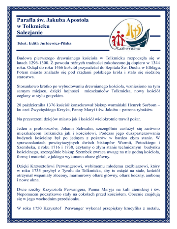 Parafia św. Jakuba Apostoła w Tolkmicku Salezjanie Tekst: Edith Jurkiewicz-Pilska Budowa pierwszego drewnianego kościoła w Tolkmicku rozpoczęła się w latach 1296-1300. Z powodu różnych trudności zakończono ją dopiero w 1344 roku. Odtąd do roku 1466 kościół przynależał do Szpitala Św. Ducha w Elblągu. Potem miasto znalazło się pod rządami polskiego króla i stało się siedzibą starostwa. Stosunkowo krótko po wybudowaniu drewnianego kościoła, wzniesiono na tym samym miejscu, dzięki hojności mieszkańców Tolkmicka, nowy kościół ceglany w stylu gotyckim. 28 października 1376 kościół konsekrował biskup warmiński Henryk Sorbom – ku czci Zwycięskiego Krzyża, Panny Maryi i św. Jakuba – patrona rybaków. Na przestrzeni dziejów miasto jak i kościół wielokrotnie trawił pożar. Jeden z proboszczów, Johann Schwahn, szczególnie zasłużył się zarówno mieszkańcom Tolkmicka jak i kościołowi. Podczas jego duszpasterzowania budynek kościelny był po jednym z pożarów w bardzo złym stanie. W sprawozdaniach powizytacyjnych dwóch biskupów Warmii, Potockiego i Szembeka, z roku 1716 i 1738, czytamy o złym stanie technicznym budynku kościelnego, szczególnie biskup Szembek zwraca uwagę na nie godną kościoła, formę i materiał, z jakiego wykonano ołtarz główny. Dzięki Krzysztofowi Perwangerowi, wybitnemu młodemu rzeźbiarzowi, który w roku 1735 przybył z Tyrolu do Tolkmicka, aby tu osiąść na stałe, kościół otrzymał wspaniały złocony, marmurowy ołtarz główny, ołtarz boczny, ambonę i nowe okna. Dwie rzeźby Krzysztofa Perwangera, Panna Maryja na kuli ziemskiej i św. Nepomucen początkowo stały na cokołach przed kościołem. Obecnie znajdują się w jego wschodnim przedsionku. W roku 1750 Krzysztof Perwanger wykonał przepiękny krucyfiks z metalu, ozdobiony bursztynami. Corpus Christi został wyrzeźbiony z kości słoniowej. Rzeźbiarz podarował krucyfiks zasłużonemu proboszczowi Johannowi Schwahnowi. W 1996 roku krucyfiks został poddany pracom konserwatorskim i obecnie znajduje się w małej absydzie nad tabernakulum w ołtarzu głównym. Niestety w roku 1767 miasto i kościół nawiedza kolejny wielki pożar. Z wielkich dzieł Perwangera ocalał jedynie krucyfiks i dwie rzeźby Panny Maryi i św. Nepomucena. Po tym pożarze wieża kościelna była bardzo zniszczona. Trzeba było ją częściowo rozebrać i odbudować. Odbudowa możliwa była dopiero w roku 1782. Wieżę zwieńczono hełmem namiotowym. W tej formie wieża pozostaje do dziś. W czasach proboszcza Teodora Matthee, a więc już pod koniec XIX wieku, liczba katolików w Tolkmicku znacznie wzrosła i budynek kościelny nie był wystarczający wobec istniejących potrzeb. Dlatego postanowiono go powiększyć. Po zakończeniu wszystkich prac budowlanych w roku 1902, powstała wspaniała trójnawowa świątynia z transeptem, który na ścianach zamykających go od północy i południa, przyozdobiony został w ogromne witrażowe rozety, powiększonym prezbiterium i dwiema zakrystiami. Prezbiterium zamykają od strony zachodniej trzy ściany, w których, w ich górnych częściach, umieszczono piękne witrażowe okna. W centrum prezbiterium znajduje się witraż przedstawiający postać Jezusa (Najświętsze Serce Jezusa), po lewej stronie: Św. Katarzyna z Aleksandrii i św. Andrzej, po prawej stronie: Św. Jakub i św. Roch. Kościół jest utrzymany w stylu neogotyckim: Ołtarz główny, dwa boczne ołtarze św. Anny i Matki Bożej, są autorstwa rzeźbiarza z Elbląga – O. Roemera, wykonane w roku 1902. Ołtarz główny składa się z pięciu części. Ma dwa skrzydła: Na lewym widoczna jest scena Zwiastowania, na prawym – Ukoronowanie Matki Bożej. W obu częściach znajdujących się blisko środka ołtarza umieszczono cztery rzeźby: Św. Elżbiety Turyńskiej, św. Barbary, św. Franciszka Ksawerego i św. Jerzego. Skrzydła są ruchome i można je zamknąć – ukazuje się wówczas scena cierpiącego w ogrodzie Getsemani Chrystusa pocieszanego przez anioła. W antependium ołtarza widnieją namalowane na drewnianych deskach trzy obrazy: Ofiara Abrahama, jeleń pijący wodę (symbol katechumena łaknącego wody chrztu) i spotkanie Melchizedeka z Abrahamem. Na wyższym z dwóch chórów, nad głównym wschodnim wejściem do kościoła, umieszczono organy, które wykonała w 1902 roku firma Terletzki-Wittek z Elbląga. Organy te to jeden z cenniejszych małych instrumentów w okolicy, zarówno jeśli chodzi o wygląd jak i brzmienie. W pobliżu głównego wejścia kościoła znajdują się dwie rzeźby: Św. Mikołaj, patron rybaków i św. Antoni z Padwy. W nawie głównej, przy kolumnach umieszczono kolejne trzy rzeźby: W środku kościoła – Jezus Chrystus, bliżej prezbiterium: Najświętsza Maryja Panna i św. Józef. Kościół jest zwieńczony kryształowym sklepieniem. Na zewnętrznej, północnej ścianie kościoła, znajduje się piękna płaskorzeźba przedstawiająca cierpiącego Chrystusa w ogrodzie Getsemani i pocieszającego Go anioła. Kościół nie uległ wielkim zniszczeniom na skutek działań wojennych prowadzonych podczas 2. Wojny Światowej, ani też po jej zakończeniu. Wszystkie ołtarze, ambona, stalle, rzeźby, chóry, prawie wszystkie ławki kościelne przetrwały. Niektóre piszczałki organowe należało uzupełnić. Krucyfiks Perwangera w ogólności dość dobrze przetrwał czas zawieruchy wojennej. Kaplicę Najświętszego Serca Jezusa na cmentarzu w Tolkmicku ufundowała Marianna Schwahn, matka proboszcza Johanna Schwahna, w roku 1738. Kaplica ma płaskie drewniane sklepienie. Od strony zachodniej i wschodniej zamknięta jest barokowymi szczytami. Podczas 2. Wojny Światowej uległa poważnym zniszczeniom. W 1959 roku dokonano częściowej restauracji kaplicy. W ostatnich latach, dzięki m. in. wsparciu finansowemu byłych mieszkańców Tolkmicka, prace restauracyjne zostały zakończone. Od 1967 roku paraf