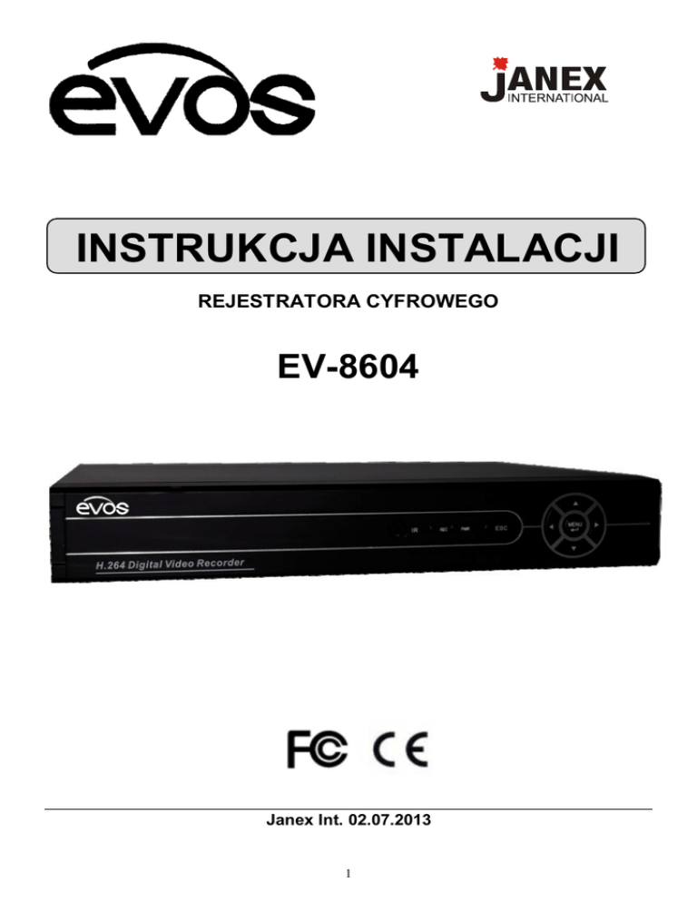 INSTRUKCJA INSTALACJI REJESTRATORA CYFROWEGO EV-8604 Janex Int. 02.07.2013 1 Środki ostrożności OSTROŻNIE ABY ZMNIEJSZYĆ RYZYKO PORAŻENIA PRĄDEM, NIE NALEŻY ZDEJMOWAĆ POKRYWY. W ŚRODKU NIE MA ŻADNYCH ELEMENTÓW WYMAGAJĄCYCH INGERENCJI UŻYTKOWNIKA. PROSZĘ SKONTAKTOWAĆ SIĘ Z WYKWALIFIKOWANYM PERSONELEM OSTRZEŻENIE ABY UNIKNĄĆ POŻARU LUB PORAŻENIA PRĄDEM, NIE NALEŻY NARAŻAĆ TEGO URZĄDZENIA NA DESZCZ LUB WILGOĆ. UWAGA: NINIEJSZE URZĄDZENIE ZOSTAŁO PRZETESTOWANE I SPEŁNIA OGRANICZENIA DLA KLASY A URZĄDZEŃ CYFROWYCH, ZGODNIE Z CZĘŚCIĄ 15 PRZEPISÓW FCC. OGRANICZENIA TE MAJĄ NA CELU ZAPEWNIENIE WYSTARCZAJĄCEJ OCHRONY PRZED SZKODLIWYMI ZAKŁÓCENIAMI, GDY URZĄDZENIE DZIAŁA W ŚRODOWISKU KOMERCYJNYM. URZĄDZENIE TO WYTWARZA, WYKORZYSTUJE I MOŻE EMITOWAĆ ENERGIĘ O CZĘSTOTLIWOŚCI RADIOWEJ, A JEŚLI NIE JEST ZAINSTALOWANE I UŻYWANE ZGODNIE Z INSTRUKCJĄ OBSŁUGI, MOŻE POWODOWAĆ SZKODLIWE ZAKŁÓCENIA W KOMUNIKACJI RADIOWEJ. KORZYSTANIE Z TEGO URZĄDZENIA W OBSZARZE ZAMIESZKANYM MOŻE POWODOWAĆ SZKODLIWE ZAKŁÓCENIA, DO WYELIMINOWANIA, KTÓRYCH UŻYTKOWNIK JEST ZOBOWIĄZANY NA WŁASNY KOSZT. PRZESTROGA FCC: W CELU ZAPEWNIENIA ZGODNOŚCI ELEKTRYCZNEJ NALEŻY UŻYWAĆ TYLKO EKRANOWANYCH PRZEWODÓW PO PODŁĄCZENIU DO INTERFEJSU KOMPUTERA LUB URZĄDZEŃ PERYFERYJNYCH. WSZELKIE ZMIANY LUB MODYFIKACJE, KTÓRE NIE ZOSTAŁY WYRAŹNIE ZATWIERDZONE PRZEZ STRONĘ ODPOWIEDZIALNĄ ZA ZGODNOŚĆ, MOGĄ UNIEWAŻNIĆ PRAWO UŻYTKOWNIKA DO KORZYSTANIA Z TEGO URZĄDZENIA. 2 OGRANICZENIE ODPOWIEDZIALNOŚCI FIRMA JANEX INTERNATIONAL SP. Z O.O. NIE PONOSI ODPOWIEDZIALNOŚCI ZA USZKODZENIA WYNIKŁE BEZPOŚREDNIO LUB POŚREDNIO Z BŁĘDÓW LUB ROZBIEŻNOŚCI POMIĘDZY DOKUMENTEM A OPISYWANYM PRODUKTEM. NINIEJSZA PUBLIKACJA MOŻE ZAWIERAĆ TECHNICZNE NIEŚCISŁOŚCI LUB BŁĘDY TYPOGRAFICZNE. ZMIANY, KTÓRE ZOSTAŁY DODANE DO DOKUMENTU SĄ W CELU POPRAWY TEJ PUBLIKACJI I / LUB ODPOWIEDNIEGO PRODUKTU (S). 3 Sprawdź wszystkie prace związane z instalacją tego produktu z wykwalifikowanym personelem serwisu lub instalatorem systemu. Nie należy korzystać z urządzenia poza wskazanym zakresem temperatury, wilgotności lub napięciem zasilania. o o Temperatura pracy urządzenia: 0 C - +45 C Wilgotność: poniżej 85% Zasilanie: 110-240 VAC, 47-63Hz Wydajność i żywotność dysków twardych zależy od wpływu ciepła (stosowany w wysokiej temperaturze). Zaleca się stosowanie tego o o urządzenia w temperaturze pomiędzy +20 C do +30 C Sposób postępowania z dyskami twardymi Możliwe jest uszkodzenie dysku, jeżeli jest przenoszony w trakcie pracy napędu. Nie przenoś dysku zaraz po włączeniu zasilania lub wyłączeniu (do około 30 sekund). Chroń dyski twarde od elektryczności statycznej Nie należy kłaść dysku lub przechowywać jeden na drugim. Nie używać żadnych elektrycznych narzędzi do naprawy dysku. Czyść tylko suchą szmatką Nie zakrywaj otworów wentylacyjnych dysku Nie używaj dysku przy źródłach ciepła, grzejnikach lub innych urządzeniach wytwarzających ciepło. Chroń kabel zasilający przed nadepnięciem zbiorników załamaniem zwłaszcza przy punktach, gdzie kabel wychodzi z urządzenia. Nie kładź metalowych części na odsłoniętych elementach elektronicznych. Uderzenia i wstrząsy mogą uszkodzić urządzenie. Nie wystawiaj urządzenia na działanie wody lub wilgoci. Nie używaj silnych detergentów do czyszczenia obudowy. Gdy zabrudzenie jest trudne do usunięcia użyj łagodnego detergentu i przetrzyj delikatnie. 4 1. Panel czołowy i zdalne sterowanie Panel czołowy Rejestrator 4 kanałowy 2. Przycisk MENU Wciśnięcie powoduje wyświetlenie MENU lub zatwierdzenie wyboru 3. Przycisk ESC Wyjście z otwartego okna 4. Przyciski strzałek Służą do poruszania się po menu urządzenia 5. Dioda POWER 6. Dioda REC 7. Okienko IR 2 Panel tylny Sieć Wejścia wideo WyjściaZłącza audio USB 5 Zasilanie Wyjście VGA Instalacja urządzenia 3.1 Proste połączenie Kamera Podłącz wyjście video kamery do wejścia video rejestratora znajdującego się na tylnej obudowie. Wejście Audio standardzie BNC 1Vp-p 75Ω. Złącze Audio Standard wejścia RCA (Chinch), 2Vp-p 600Ω Rezystancja wejścia jest wysoka, więc należy korzystać z aktywnych źródeł dźwięku lub aktywnych mikrofonów. Okablowanie audio powinno być prowadzone z dala od silnych źródeł promieniowania elektromagnetycznego. Monitor Podłącz główne wyjście monitorowe rejestratora do wejścia monitora. Zasilanie Podłącz zasilacz do wejścia rejestratora. (12VDC) Sieć LAN Podłącz kabel sieciowy do złącza RJ45 rejestratora, jeśli przewiduje się obsługę urządzenia przez sieć LAN Wejścia USB 2.0 Złącze USB wspiera następujące urządzenia: mysz USB, USB Flash Drive, zewnętrzne dyski twarde USB. 3.2 Instalacja dysku twardego Dysk twardy musi być sformatowany przez rejestrator zanim zostanie uruchomiony na nim zapis. Nie formatuj dysku w komputerach PC. 6 Pierwsze uruchomienie Po włączeniu zasilania należy poczekać aż system załaduje program. Trwa to minimum 20s. Pierwsze okno służy do określenia, czy będziemy korzystać z funkcjonalności darmowej „Chmury”. Funkcja „Chmury” w rejestratorze EV-8604 daje nam możliwość zdalnego dostępu do rejestratora przez: router ze zmiennym adresem IP, serwery Proxy operatorów 3G/LTE, firewalle. Nie będzie potrzeby przekierowywania portów TCP na routerze. Logowanie będzie odbywało się poprzez podanie numeru seryjnego rejestratora, nazwy użytkownika oraz hasła. Dostęp do rejestratora możliwy będzie przez stronę WWW oraz program CMS. Strony WWW: - http://www.janexint.com.pl/evos - http://www.xmeye.net Program CMS: http://www.janexint.com.pl/materialy/evos/oprogramowanie/EV8604_Oprogramowanie.zip Nr seryjny rejestratora odczytujemy w oknie: Menu -> Info -> Wersja -> Serial No. Należy zwrócić uwagę na poprawność ustawień sieciowych w rejestratorze. Szczególnie na adres IP: bramy oraz serwer