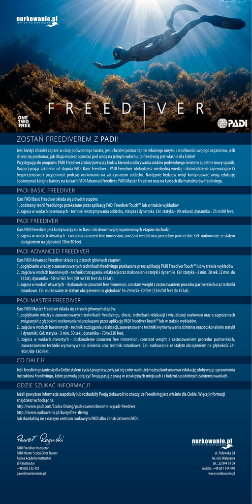 ZOSTAŃ FREEDIVEREM Z PADI! Jeśli kiedyś chciałeś zajrzeć w ciszę podwodnego świata, jeśli chciałeś poznać tajniki własnego umysłu i możliwości swojego organizmu, jeśli chcesz się przekonać, jak długo możesz pozostać pod wodą na jednym wdechu, to freediving jest właśnie dla Ciebie! Przystępując do programu PADI Freediver zrobisz pierwszy krok w kierunku odkrywania uroków podwodnego świata w zupełnie nowy sposób. Rozpoczynając szkolenie od stopnia PADI Basic Freediver i PADI Freediver zdobędziesz niezbędną wiedzę i doświadczenie zapewniające Ci bezpieczeństwo i przyjemność podczas nurkowania na zatrzymanym oddechu. Następnie będziesz mógł kontynuować swoją edukację i pokonywać kolejne bariery na kursach PADI Advanced Freediver, PADI Master Freediver oraz na kursach dla Instruktorów freedivingu. PADI BASIC FREEDIVER Kurs PADI Basic Freediver składa się z dwóch etapów: 1. podstawy teorii freedivingu przekazane przez aplikację PADI Freediver TouchTM lub w trakcie wykładów 2. z ajęcia w wodach basenowych - techniki wstrzymywania oddechu, statyka i dynamika. Cel: statyka - 90 sekund, dynamika - 25 m/80 feet, PADI FREEDIVER Kurs PADI Freediver jest kontynuacją kursu Basic i do dwóch wyżej wymienionych etapów dochodzi 3. zajęcia w wodach otwartych - ćwiczenia zanurzeń free immersion, constant weight oraz procedury partnerskie. Cel: nurkowanie ze stałym obciążeniem na głębokość 10m/30 feet. PADI ADVANCED FREEDIVER Kurs PADI Advanced Freediver składa się z trzech głównych etapów: 1. p ogłębianie wiedzy o zaawansowanych technikach freedivingu przekazane przez aplikację PADI Freediver TouchTM lub w trakcie wykładów 2. zajęcia w wodach basenowych - techniki rozciągania i relaksacji oraz doskonalenie statyki i dynamiki. Cel: statyka - 2 min. 30 sek. (2 min. do 18 lat), dynamika - 50 m/165 feet (40 m/130 feet do 18 lat), 3. zajęcia w wodach otwartych - doskonalenie zanurzeń free immersion, constant weight z zastosowaniem procedur partnerskich oraz techniki ratunkowe. Cel: nurkowanie ze stałym obciążeniem na głębokość 16-24m/55-80 feet (15m/50 feet do 18 lat). PADI MASTER FREEDIVER Kurs PADI Master Freediver składa się z trzech głównych etapów: 1. pogłębianie wiedzy o zaawansowanych technikach freedivingu, diecie, technikach relaksacji i wizualizacji nurkowań oraz o zagrożeniach związanych z głębokimi nurkowaniami przekazane przez aplikację PADI Freediver TouchTM lub w trakcie wykładów, 2. zajęcia w wodach basenowych - techniki rozciągania, relaksacji, zaawansowane techniki wyrównywania ciśnienia oraz doskonalenie statyki i dynamiki. Cel: statyka - 3 min. 30 sek., dynamika - 70m/230 feet, 3. zajęcia w wodach otwartych - doskonalenie zanurzeń free immersion, constant weight z zastosowaniem procedur partnerskich, zaawansowane techniki wyrównywania ciśnienia oraz techniki ratunkowe. Cel: nurkowanie ze stałym obciążeniem na głębokość 2440m/80-130 feet. CO DALEJ? Jeśli freediving stanie się dla Ciebie stylem życia i pragniesz związać się z nim na dłużej możesz kontynuować edukację zdobywając uprawnienia Instruktora Freedivingu, które pozwolą połączyć Twoją pasję z pracą w atrakcyjnych miejscach i z ludźmi o podobnych zainteresowaniach. GDZIE SZUKAĆ INFORMACJ? Jeżeli powyższe informacje zaspokoiły lub rozbudziły Twoją ciekawość to znaczy, że Freediving jest właśnie dla Ciebie. Więcej informacji znajdziesz wchodząc na: http://www.padi.com/Scuba-Diving/padi-courses/become-a-padi-freediver http://www.nurkowanie.pl/kursy/free-diving lub skontaktuj się z naszym centrum nurkowym PADI albo z Instruktorem PADI. PADI Freediver Instructor PADI Master Scuba Diver Trainer Apnea Academy Instructor EFR Instructor +48 602 232 402 [email protected] ul. Puławska 84 02-603 Warszawa tel.: 22 844 91 04 mobile: +48 601 144 440 www.nurkowanie.pl
