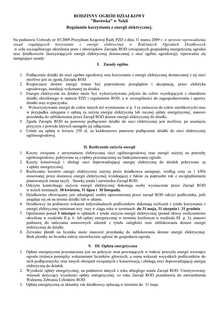 RODZINNY OGRÓD DZIAŁKOWY ”Borówka” w Nekli Regulamin korzystania z energii elektrycznej. Na podstawie Uchwały nr 45/2009 Prezydium Krajowej Rady PZD z dnia 31 marca 2009 r. w sprawie wprowadzenia zasad regulujących korzystanie z energii elektrycznej w Rodzinnych Ogrodach Działkowych w celu szczegółowego określenia praw i obowiązków Zarządu ROD (związanych gospodarką energetyczną ogrodu) oraz działkowców (korzystających energii elektrycznej dostarczanej z sieci ogólno ogrodowej), wprowadza się następujące zasady: I. Zasady ogólne 1. Podłączenie działki do sieci ogólno ogrodowej oraz korzystanie z energii elektrycznej dostarczanej z tej sieci możliwe jest za zgodą Zarządu ROD. 2. Rozpoczęcie dostaw energii winno być poprzedzone przeglądem i akceptacją, przez elektryka ogrodowego, instalacji wykonanej na działce. 3. Energia elektryczna na działce może być wykorzystywana jedynie do celów wynikających z charakteru działki określonego w statucie PZD i regulaminie ROD, a w szczególności do zagospodarowania i uprawy działki oraz wypoczynku. 4. Wykorzystywanie energii do celów innych niż wymienione w p. 3 (a zwłaszcza do celów zarobkowych) oraz w przypadku zalegania z opłatą za zużytą energię elektryczną lub rocznej opłaty energetycznej, stanowi przesłankę do zablokowania przez Zarząd ROD dostaw energii elektrycznej do działki. 5. Zgoda Zarządu ROD na ponowne podłączenie działki do sieci elektrycznej jest możliwa, po usunięciu przyczyn z powodu których nastąpiło jej odłączenie. 6. Ustala się opłatę w kwocie 250 zł, za każdorazowe ponowne podłączenie działki do sieci elektrycznej ogólnoogrodowej. 1. 2. 3. 4. 5. 6. 7. 8. II. Rozliczanie zużycia energii Koszty związane z utrzymaniem elektrycznej sieci ogólnoogrodowej oraz energii zużytej na potrzeby ogólnoogrodowe, pokrywane są z opłaty przeznaczonej na funkcjonowanie ogrodu. Koszty konserwacji i obsługi sieci doprowadzającej energię elektryczną do działek pokrywane są z opłaty energetycznej. Rozliczanie kosztów energii elektrycznej zużytej przez działkowca następuje, według ceny za 1 kWh stosowanej przez dostawcę energii elektrycznej wynikającej z faktur za poprzedni rok z uwzględnieniem planowanych zmian taryfy . Stawkę ustala i zatwierdza Zarząd ROD. Odczytu kontrolnego zużycia energii elektrycznej dokonują osoby wyznaczone przez Zarząd ROD w trzech terminach: 30 kwietnia, 31 lipca i 30 listopada. Działkowiec obowiązany jest udostępnić osobie upoważnionej przez zarząd ROD odczyt podlicznika, jeśli znajduje się on na terenie działki lub w altanie. Działkowcy na podstawie wskazań indywidualnych podliczników dokonują rozliczeń z tytułu korzystania z energii elektrycznej minimum trzy razy w ciągu roku w terminach: do 31 maja, 31 sierpnia i 31 grudnia. Opóźnienie ponad 3 miesiące w opłatach z tytułu zużycia energii elektrycznej (ponad okresy rozliczeniowe określone w rozdziale II p. 6 lub opłaty energetycznej w terminie kreślonym w rozdziale III p. 3), stanowi podstawę do naliczania ustawowych odsetek z tytułu zaległości oraz zablokowania dostaw energii elektrycznej do działki. Zerwanie plomb na liczniku może stanowić przesłankę do zablokowania dostaw energii elektrycznej. Brak plomby na liczniku należy niezwłocznie zgłosić do gospodarza ogrodu. 9. III. Opłata energetyczna 1. Opłata energetyczna przeznaczona jest na pokrycie strat powstających w trakcie przesyłu energii wewnątrz ogrodu (różnica pomiędzy wskazaniami liczników głównych, a sumą wskazań wszystkich podliczników do nich podłączonych), oraz innych obciążeń związanych z konserwacją i obsługą sieci doprowadzającej energię elektryczną do działek. 2. Wysokość opłaty energetycznej, na podstawie danych z roku ubiegłego ustala Zarząd ROD. Umotywowany wniosek dotyczący wysokości opłaty energetycznej, co roku Zarząd ROD przedstawia do zatwierdzenia Walnemu Zebraniu Członków ROD. 3. Opłatę energetyczną za aktualny rok działkowcy opłacają w terminie do 31 maja. IV. Tryb przeprowadzenia kontroli 1. Zarząd ROD może powołać komisję energetyczną, do kompetencji której należy: - zapobieganie nielegalnemu poborowi energii elektrycznej. - współpraca z działkowcami w zakresie racjonalnego korzystania z energii elektrycznej. - rozwiązywanie sporów związanych z wykorzystywaniem energii elektrycznej. - nadzór nad pracą elektryka - analizowanie zamierzeń związanych z modernizacjami energetycznymi. - uczestnictwo w przygotowaniach i odbiorach prac inwestycyjnych branży energetycznej. 2. Komisja energetyczna powołana przez Zarząd ROD, w skład której wchodzi osoba posiadająca kwalifikacje do kontroli urządzeń energetycznych, może przeprowadzić kontrolę instalacji na indywidualnej działce. 3. W przypadku nie powołania komisji energetycznej, jej funkcje w uzasadnionych indywidualnych przypadkach pełni zespół powoływany przez Zarząd ROD. 4. Przedmiotem badania podczas kontroli jest sposób wykorzystania energii, ogólny stan instalacji - zwłaszcza pod kątem bezpieczeństwa, oraz funkcjonowanie i stan podlicznika 5. W trakcie przeprowadzenia kontroli musi być obecny użytkownik działki lub inna wskazana przez niego osoba pełnoletnia. 6. Z kontroli w trakcie której wykryto nieprawidłowości, sporządzany jest protokół podpisywany przez członków komisji energetycznej, elektryka ogrodu i użytkownika działki lub reprezentującą go osobę. Protokół przedstawiany jest Zarządowi ROD. 7. W przypadku odmowy złożenia podpisu przez osobę lub osoby wymienione w p. 5 należy zaznaczyć to w protokole z podaniem przyczyny. 8. Bezpodstawne uniemożliwienie przeprowadzenia kontroli przez użytkownika działki, może być przesłanką do zastosowania kar statutowych i zablokowania dostaw energii elektrycznej 9. W uzasadnionych przypadkach Zarząd ROD może podjąć decyzję o przeprowadzeniu k