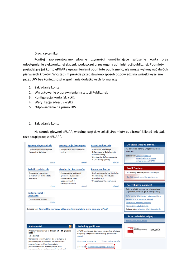 Drogi czytelniku. Poniżej zaprezentowano główne czynności umożliwiające założenie konta oraz udostępnienie elektronicznej skrzynki podawczej przez organy administracji publicznej. Podmioty posiadające już konto ePUAP z uprawnieniami podmiotu publicznego, nie muszą wykonywać dwóch pierwszych kroków. W ostatnim punkcie przedstawiono sposób odpowiedzi na wnioski wysyłane przez UW bez konieczności wypełniania dodatkowych formularzy. 1. 2. 3. 4. 5. Zakładanie konta. Wnioskowanie o uprawnienia Instytucji Publicznej. Konfiguracja konta (skrytki). Weryfikacja adresu skrytki. Odpowiadanie na pismo UW. 1. Zakładanie konta Na stronie głównej ePUAP, w dolnej części, w sekcji „Podmioty publiczne” kliknąć link „Jak rozpocząć pracę z ePUAP”. Następnie postępować zgodnie z instrukcją „Instrukcja zakładania konta o uprawnieniach instytucji publicznej” znajdującej się pod linkiem „Instrukcja zakładania konta”. 2. Nadanie uprawnień Instytucji Publicznej W celu świadczenia usług na platformie ePUAP oraz uzyskania możliwości wystawiania poświadczenia odbioru, o którym mowa w art.3 pkt. 20 ustawy z dnia 17 lutego 2005 r. o informatyzacji działalności podmiotów realizujących zadania publiczne (Dz. U. Nr 64, poz. 565, z późn. zm.) należy złożyć wniosek o nadanie odpowiednich uprawnień rozszerzających funkcjonalność konta. Złożenie wniosku zostało opisane w rozdziale 4 instrukcji zakładania konta (o której mowa w poprzednim pkt.). Celem wypełnienia wniosku należy przejść ze strony głównej ePUAP klikając w link „Jak rozpocząć pracę z ePUAP” w sekcji „Podmioty publiczne”. Następnie z lewej strony należy kliknąć w link „Wniosek o nadanie uprawnień”. Postępować zgodnie z instrukcją zamieszczoną na stronie. 3. Konfiguracja konta (skrytki) Podmiot publiczny zobowiązany jest wystawiać poświadczenie odbioru (przedłożenia) dla każdego pisma składanego przez elektroniczną skrzynkę podawczą zgodnie z § 13 ust 1 rozporządzenia Prezesa Rady Ministrów z dnia 14 września w sprawie sporządzania pism w formie dokumentów elektronicznych, doręczania dokumentów elektronicznych oraz udostępniania formularzy, wzorów i kopii dokumentów elektronicznych. W celu weryfikacji ustawień konta ePUAP podmiotu publicznego należy przejść do modułu Podsystemu komunikacyjnego. Na głównej stronie ePUAP kliknąć link „Moje konto”, następnie „Konfiguracja”: Następnie należy przejść do zakładki „Podsystem komunikacyjny”. Lista skrytek, które odpowiadają za odbiór dokumentów oraz wystawianie poświadczeń znajduje się na stronie „Lista skrytek”. Na liście skrytek powinna być widoczna domyślna skrytka, tworzona w momencie zakładania konta, o nazwie „Domyślna”. Należy przejść do jej konfiguracji klikając w link „Edytuj konfigurację”. Należy upewnić się aby w sekcji „Tryb pracy”, dla pozycji „Rodzaj odpowiedzi” była wybrana opcja „UPP”. UWAGA: opcja ta dostępna jest tylko dla kont z nadanym uprawnieniem Instytucji Publicznej. Zaleca się, by również skonfigurować powiadamianie o zdarzeniach na naszej skrytce ePUAP. Przechodzimy do strony Strona główna →Usługi komunikacyjne →Lista skrytek →Konfiguracja skrytki, na jej dole znajduje się belka „Pozostałe”, skąd klikamy przycisk „Powiadomienia e-mail”. Wśród kilku dostępnych opcji najbardziej praktyczne jest użycie powiadomienia „O pierwszym dokumencie w kolejce”, gdzie należy postawić znaczek a, a w kolumnie Adres e-mail wpisać adres, z którego regularnie jest odbierana poczta elektroniczna. Tak skonfigurowana skrytka przypomni o sobie e-mailem, gdy wpłynie na nią nowy dokument. 5. Odpowiadanie na pismo z UW 4. Weryfikacja adresu skrytki Dostępne adresy skrytek znajdują się na stronach Podsystemu komunikacyjnego pod linkiem „Lista wszystkich adresów”. Adres domyślnej skrytki zwykle kończy się słowem „skrytka”. Dla pism wysłanych przez UW na ePUAP dostępny jest przycisk „Odpowiedz”. Kliknięcie przycisku powoduje otworzenie formularza , który pozwala udzielić odpowiedzi i ew. załączenie załącznika. Podlaski Urząd Wojewódzki w Białymstoku, ©Łódzki Urząd Wojewódzki w Łodzi