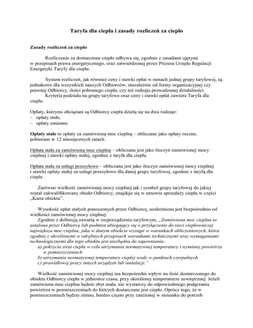 Taryfa dla ciepła i zasady rozliczeń za ciepło Zasady rozliczeń za ciepło Rozliczenie za dostarczone ciepło odbywa się, zgodnie z zasadami ujętymi w przepisach prawa energetycznego, oraz zatwierdzonej przez Prezesa Urzędu Regulacji Energetyki Taryfy dla ciepła. System rozliczeń, jak również ceny i stawki opłat w ramach jednej grupy taryfowej, są jednakowe dla wszystkich naszych Odbiorców, niezależnie od formy organizacyjnej czy prawnej Odbiorcy, ilości pobranego ciepła, czy też rodzaju prowadzonej działalności. Kryteria podziału na grupy taryfowe oraz ceny i stawki opłat zawiera Taryfa dla ciepła. Opłaty, którymi obciążani są Odbiorcy ciepła dzielą się na dwa rodzaje: − opłaty stałe, − opłaty zmienne. Opłaty stałe to opłaty za zamówioną moc cieplną – obliczane jako opłaty roczne, pobierane w 12 miesięcznych ratach. Opłata stała za zamówioną moc cieplną – obliczana jest jako iloczyn zamówionej mocy cieplnej i stawki opłaty stałej, zgodnie z taryfa dla ciepła. Opłata stała za usługi przesyłowe – obliczana jest jako iloczyn zamówionej mocy cieplnej i stawki opłaty stałej za usługi przesyłowe dla danej grupy taryfowej, zgodnie z taryfą dla ciepła Zarówno wielkość zamówionej mocy cieplnej jak i symbol grupy taryfowej do jakiej został zakwalifikowany obiekt Odbiorcy, znajduje się w umowie sprzedaży ciepła w części „Karta obiektu”. Wysokość opłat stałych ponoszonych przez Odbiorcę, uzależniona jest bezpośrednio od wielkości zamówionej mocy cieplnej. Zgodnie z definicją zawartą w rozporządzeniu taryfowym, „Zamówiona moc cieplna to ustalona przez Odbiorcę lub podmiot ubiegający się o przyłączenie do sieci ciepłowniczej największa moc cieplna, jaka w danym obiekcie wystąpi w warunkach obliczeniowych, która zgodnie z określonymi w odrębnych przepisach warunkami technicznymi oraz wymaganiami technologicznymi dla tego obiektu jest niezbędna do zapewnienia: a) pokrycia strat ciepła w celu utrzymania normatywnej temperatury i wymiany powietrza w pomieszczeniach b) utrzymania normatywnej temperatury ciepłej wody w punktach czerpalnych c) prawidłowej pracy innych urządzeń lub instalacji.” Wielkość zamówionej mocy cieplnej ma bezpośredni wpływ na ilość dostarczonego do obiektu Odbiorcy ciepła w jednostce czasu, przy określonej temperaturze zewnętrznej. Jeżeli zamówiona moc cieplna będzie zbyt mała, nie wystarczy do odpowiedniego podgrzania powietrza w pomieszczeniach do których dostarczane jest ciepło. Oprócz tego, że w pomieszczeniach będzie zimno, bardzo często przy zaniżonej w stosunku do potrzeb wielkości zamówionej mocy cieplnej, Odbiorca będzie zwracał nośnik ciepła o zaniżonej temperaturze powrotu, w stosunku do wartości ujętych w tabeli regulacyjnej. Oznacza to przekroczenie przez Odbiorcę zamówionej mocy cieplnej, a więc pobór ciepła niezgodnie z warunkami umowy. W takich przypadkach przekroczenia zamówionej mocy cieplnej należy dostosować jej wielkość do rzeczywistego zapotrzebowania. Zgodnie z przepisami prawa energetycznego, niedostosowanie się do tego ze strony Odbiorcy skutkuje zastosowaniem kar finansowych za przekroczenie przez Odbiorcę zamówionej mocy cieplnej. Wielkość zamówionej mocy cieplnej dla danego obiektu, zależna jest od kilku czynników, a przede wszystkim od: − wielkości i kubatury ogrzewanego obiektu, − technologii wykonania obiektu i jego docieplenia, − sposobu gospodarowania ciepłem przez Odbiorcę. Opłaty zmienne to opłaty za zużyte ciepło, oraz za usługi przesyłowe, uzależnione od ilości zużytego przez Odbiorcę ciepła w danym okresie rozliczeniowym. Opłaty zmienne naliczane są jedynie w miesiącach, w których nastąpił faktyczny pobór ciepła przez Odbiorcę. Opłata zmienna za ciepło – obliczana jest jako iloczyn ilości zużytego ciepła, ustalonej na podstawie odczytu układu pomiarowego (liczników ciepła) i ceny ciepła, zgodnie z taryfą dla ciepła. Opłata zmienna za usługi przesyłowe – obliczana jest jako iloczyn ilości zużytego ciepła, ustalonej na podstawie odczytu wskazań układu pomiarowego (liczników ciepła) i stawki opłaty zmiennej za usługi przesyłowe dla danej grupy taryfowej, zgodnie z taryfa dla ciepła. Do opłat zmiennych zalicza się także: opłatę za uzupełnianie ubytków nośnika ciepła w instalacjach odbiorczych – całkowitą ilość ubytków nośnika ustala się na podstawie wskazań wodomierza zainstalowanego w węźle cieplnym, a następnie dzieli się ją pomiędzy wszystkich Odbiorców ciepła, ogrzewanych z danego węzła cieplnego, proporcjonalnie do wielkości zamówionej przez poszczególnych Odbiorców mocy cieplej na cele c.o. Określenie ilości odebranego i zużytego przez Odbiorcę ciepła odbywa się na podstawie wskazań układu pomiarowego. Odczyty wskazań układów pomiarowo – rozliczeniowych dokonywane są jeden raz w miesiącu, przez upoważnionego pracownika ZC przy udziale przedstawiciela Odbiorcy. W przypadku wystąpienia awarii lub konieczności wykonania legalizacji liczników ciepła, są one demontowane, zaś ilości zużytego przez Odbiorcę ciepła w okresie braku licznika, oblicza się zgodnie z zapisem „Standardów jakościowych obsługi Odbiorców”, do wglądu w Zakładzie Ciepłowniczym.