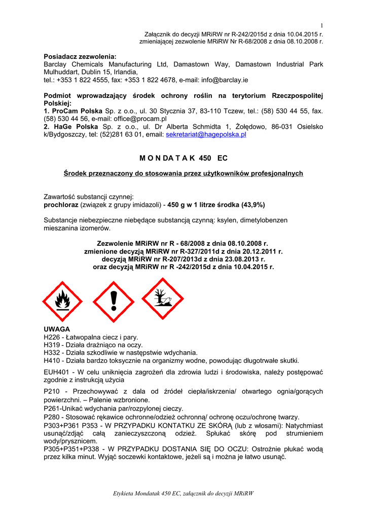 1 Załącznik do decyzji MRiRW nr R-242/2015d z dnia 10.04.2015 r. zmieniającej zezwolenie MRiRW Nr R-68/2008 z dnia 08.10.2008 r. Posiadacz zezwolenia: Barclay Chemicals Manufacturing Ltd, Damastown Way, Damastown Industrial Park Mulhuddart, Dublin 15, Irlandia, tel.: +353 1 822 4555, fax: +353 1 822 4678, e-mail: [email protected] Podmiot wprowadzający środek ochrony roślin na terytorium Rzeczpospolitej Polskiej: 1. ProCam Polska Sp. z o.o., ul. 30 Stycznia 37, 83-110 Tczew, tel.: (58) 530 44 55, fax. (58) 530 44 56, e-mail: [email protected] 2. HaGe Polska Sp. z o.o., ul. Dr Alberta Schmidta 1, Żołędowo, 86-031 Osielsko k/Bydgoszczy, tel: (52)281 63 01, email: [email protected] M O N DA T A K 450 EC Środek przeznaczony do stosowania przez użytkowników profesjonalnych Zawartość substancji czynnej: prochloraz (związek z grupy imidazoli) - 450 g w 1 litrze środka (43,9%) Substancje niebezpieczne niebędące substancją czynną: ksylen, dimetylobenzen mieszanina izomerów. Zezwolenie MRiRW nr R - 68/2008 z dnia 08.10.2008 r. zmienione decyzją MRiRW nr R-327/2011d z dnia 20.12.2011 r. decyzją MRiRW nr R-207/2013d z dnia 23.08.2013 r. oraz decyzją MRiRW nr R -242/2015d z dnia 10.04.2015 r. UWAGA H226 - Łatwopalna ciecz i pary. H319 - Działa drażniąco na oczy. H332 - Działa szkodliwie w następstwie wdychania. H410 - Działa bardzo toksycznie na organizmy wodne, powodując długotrwałe skutki. EUH401 - W celu uniknięcia zagrożeń dla zdrowia ludzi i środowiska, należy postępować zgodnie z instrukcją użycia P210 - Przechowywać z dala od źródeł ciepła/iskrzenia/ otwartego ognia/gorących powierzchni. – Palenie wzbronione. P261-Unikać wdychania par/rozpylonej cieczy. P280 - Stosować rękawice ochronne/odzież ochronną/ ochronę oczu/ochronę twarzy. P303+P361 P353 - W PRZYPADKU KONTATKU ZE SKÓRĄ (lub z włosami): Natychmiast usunąć/zdjąć całą zanieczyszczoną odzież. Spłukać skórę pod strumieniem wody/prysznicem. P305+P351+P338 - W PRZYPADKU DOSTANIA SIĘ DO OCZU: Ostrożnie płukać wodą przez kilka minut. Wyjąć soczewki kontaktowe, jeżeli są i można je łatwo usunąć. Etykieta Mondatak 450 EC, załącznik do decyzji MRiRW 2 P304 + P340 - W PRZYPADKU DOSTANIA SIĘ DO DRÓG ODDECHOWYCH wyprowadzić lub wynieść poszkodowanego na świeże powietrze i zapewnić warunki do odpoczynku w pozycji umożliwiającej swobodne oddychanie. P391 - Zebrać wyciek OPIS DZIAŁANIA Mondatak 450 EC jest środkiem grzybobójczym w formie koncentratu do sporządzania emulsji wodnej o działaniu wgłębnym do stosowania zapobiegawczego i interwencyjnego w ochronie zbóż ozimych i jarych oraz rzepaku ozimego przed chorobami grzybowymi. Środek przeznaczony do stosowania przy użyciu opryskiwaczy polowych. STOSOWANIE ŚRODKA Maksymalna liczba zabiegów w sezonie wegetacyjnym każdej z upraw (pszenica ozima, pszenżyto ozime, jęczmień ozimy, jęczmień jary, żyto, pszenica jara, pszenżyto jare, rzepak ozimy) - 1 pszenica ozima, pszenżyto ozime mączniak prawdziwy, łamliwość źdźbła, septorioza paskowana liści pszenicy Zalecana dawka dla jednorazowego zastosowania: 1 l/ha. Maksymalna dawka dla jednorazowego zastosowania: 1 l/ha. termin stosowania środka: od początku fazy strzelania w źdźbło do fazy pierwszego kolanka (BBCH 30-31) Zalecana ilość wody: 200-400 l/ha. Zalecane opryskiwanie: drobnokropliste. Maksymalna liczba zabiegów w sezonie wegetacyjnym – 1 jęczmień ozimy łamliwość źdźbła, mączniak prawdziwy Zalecana dawka dla jednorazowego zastosowania: 1 l/ha. Maksymalna dawka dla jednorazowego zastosowania: 1 l/ha. termin stosowania środka: od początku fazy strzelania w źdźbło do fazy pierwszego kolanka (BBCH 30-31) Zalecana ilość wody: 200-400 l/ha. Zalecane opryskiwanie: drobnokropliste. Maksymalna liczba zabiegów w sezonie wegetacyjnym – 1 żyto ozime łamliwość źdźbła, rynchosporioza, rdza brunatna. Zalecana dawka dla jednorazowego zastosowania: 1 l/ha. Maksymalna dawka dla jednorazowego zastosowania: 1 l/ha. termin stosowania środka: od początku fazy strzelania w źdźbło do fazy pierwszego kolanka. (BBCH 30-31). Zalecana ilość wody: 200-400 l/ha. Zalecane opryskiwanie: drobnokropliste. Maksymalna liczba zabiegów w sezonie wegetacyjnym – 1 pszenica ozima, pszenżyto ozime mączniak prawdziwy, septorioza liści, septorioza plew, septorioza paskowana liści pszenicy, brunatna plamistość liści. Zalecana dawka dla jednorazowego zastosowania: 1 l/ha. Maksymalna dawka dla jednorazowego zastosowania: 1 l/ha. Termin stosowania środka: od początku fazy strzelania w źdźbło do końca fazy kłoszenia (BBCH 30-BBCH 59) Zalecana ilość wody: 200-400 l/ha. Zalecane opryskiwanie: drobnokropliste. Maksymalna liczba zabiegów w sezonie wegetacyjnym – 1 Etykieta Mondatak 450 EC, załącznik do decyzji MRiRW 3 jęczmień ozimy, jęczmień jary mączniak prawdziwy, rdza jęczmienia, plamistość siatkowa jęczmienia, rynchosporioza. Zalecana dawka dla jednorazowego zastosowania: 1 l/ha. Maksymalna dawka dla jednorazowego zastosowania: 1 l/ha. Termin stosowania środka: od końca fazy krzewienia do początku fazy kłoszenia (BBCH 29 – BBCH 50). Zalecana ilość wody: 200-400 l/ha. Zalecane opryskiwanie: drobnokropliste. Maksymalna liczba zabiegów w sezonie wegetacyjnym – 1 żyto mączniak prawdziwy, rynchosporioza. Zalecana dawka dla jednorazowego zastosowania: 1 l/ha. Maksymalna dawka dla jednorazowego zastosowania: 1 l/ha. Termin stosowania środka: od początku fazy strzelania w źdźbło do końca fazy kłoszenia (BBCH 30-BBCH 59). Zalecana ilość wody: 200-400 l/ha. Zalecane opryskiwanie: drobnokropliste. Maksymalna liczba zabiegów w sezonie wegetacyjnym – 1 pszenica jara, pszenżyto jare. mączniak prawdziwy, rynchosporioza. Zalecana dawka dla jednorazowego zastosowania: 1 l/ha. Maksymalna dawka dla jednorazowego zastosowania: 1 l/ha. Termin stosowania środka: od początku fazy strzelania w ź