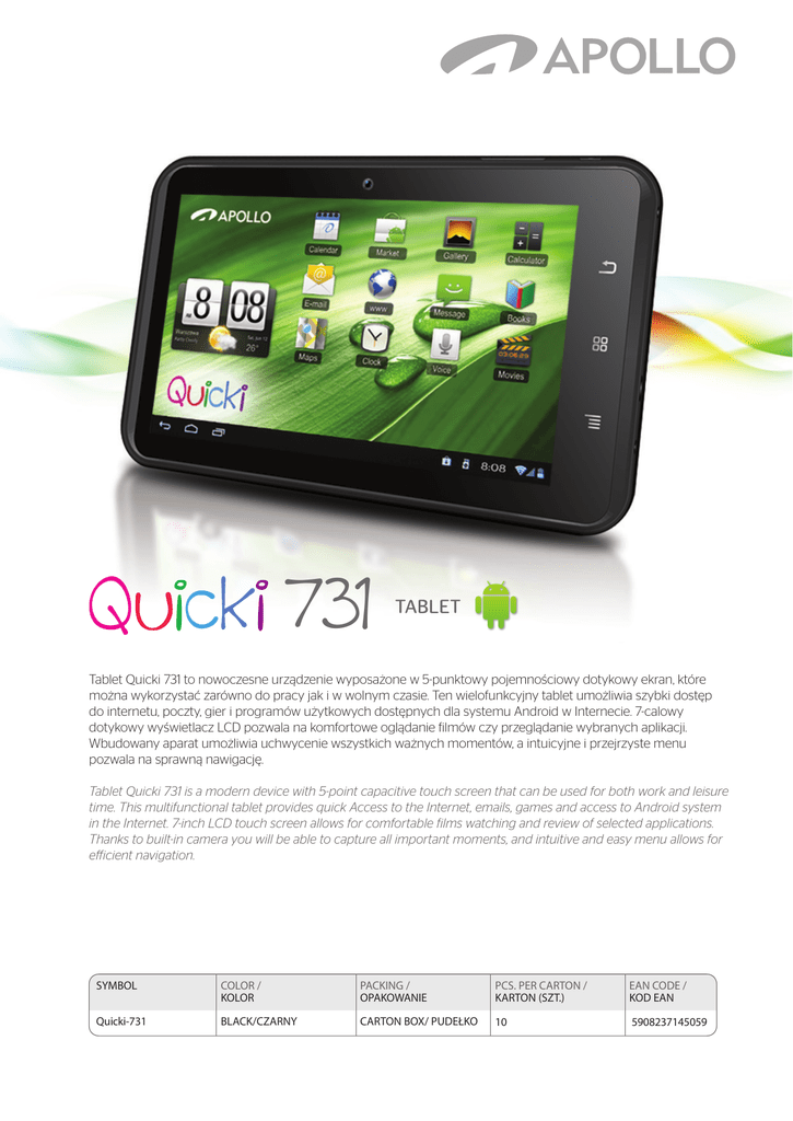731 Tablet Quicki 731 to nowoczesne urządzenie wyposażone w 5-punktowy pojemnościowy dotykowy ekran, które można wykorzystać zarówno do pracy jak i w wolnym czasie. Ten wielofunkcyjny tablet umożliwia szybki dostęp do internetu, poczty, gier i programów użytkowych dostępnych dla systemu Android w Internecie. 7-calowy dotykowy wyświetlacz LCD pozwala na komfortowe oglądanie filmów czy przeglądanie wybranych aplikacji. Wbudowany aparat umożliwia uchwycenie wszystkich ważnych momentów, a intuicyjne i przejrzyste menu pozwala na sprawną nawigację. Tablet Quicki 731 is a modern device with 5-point capacitive touch screen that can be used for both work and leisure time. This multifunctional tablet provides quick Access to the Internet, emails, games and access to Android system in the Internet. 7-inch LCD touch screen allows for comfortable films watching and review of selected applications. Thanks to built-in camera you will be able to capture all important moments, and intuitive and easy menu allows for efficient navigation. SYMBOL COLOR / KOLOR PACKING / OPAKOWANIE PCS. PER CARTON / KARTON (SZT.) EAN CODE / KOD EAN Quicki-731 BLACK/CZARNY CARTON BOX/ PUDEŁKO 10 5908237145059 Micro SD card slot Slot karty Micro SD Dane techniczne: • 7-calowy pojemnościowy ekran dotykowy (5-punktowy Multi-touch) • Rozdzielczość ekranu 800*480 • CPU: BOXCHIP A13 1.2 Ghz, • GPU: Mali-400 • System operacyjny Android 4.0 • Pamięć RAM: 512 MB DDR3 • Pamięc flash 4GB • Łączność bezprzewodowa WiFi • Wbudowana kamera 0.3 Mpix • Wbudowany głośnik • Wbudowany mikrofon • Pliki audio : MP3, WMA, WAV, APE, OGG, FLAC, AAC, AC3 • Pliki multimedialne: AVI, 3GP/MP4, MPG, RM/RMVB, MKV, MOV, FLV, WMV, AVI, MPEG-1, • Pliki graficzne: JPG, JPEG, BMP and PNG • Wejście / Wyjście:3.5mm wyjście słuchawkowe 1, MIC 1, DC JACK 1, czytnik kart microSD, mini USB • Menu w języku polskim • Akumulator • Gniazdo karty microSD, max 32GB • Ładowarka sieciowa w komplecie • Wymiary: 200 x 122 x 11 mm • Waga 340g +48 22 46 45 999 +48 22 46 45 811 Technical Data: • 7 inch capacitive touch screen (5 points Multi-touch) • Display resolution 800*480 • CPU: BOXCHIP A13 1.2 Ghz, • GPU: Mali-400 • Operating system Android 4.0 • RAM memory 512MB DDR3 • Flash memory 4GB • Wireless connection WiFi • Built-in 0,3Mpix camera • Built-in speaker • Built in microphone • Audio files: MP3, WMA, WAV, APE, OGG, FLAC, AAC, AC3 • Media File: AVI, 3GP/MP4, MPG, RM/RMVB, MKV, MOV, FLV, WMV, AVI, MPEG-1, • Photo file: JPG, JPEG, BMP and PNG • Input / Output: 3.5mm head phone Jack 1, MIC 1, DC JACK 1, microSD card reader, mini USB • Multi language OSD menu • Recharable battery • MicroSD card slot, max 32GB • AC adapter included • Dimensions: 200 x 122 x 11 mm • Weight 340g Apollo Electronics Poleczki 13 02-822 Warszawa www.apollo.eu [email protected]
