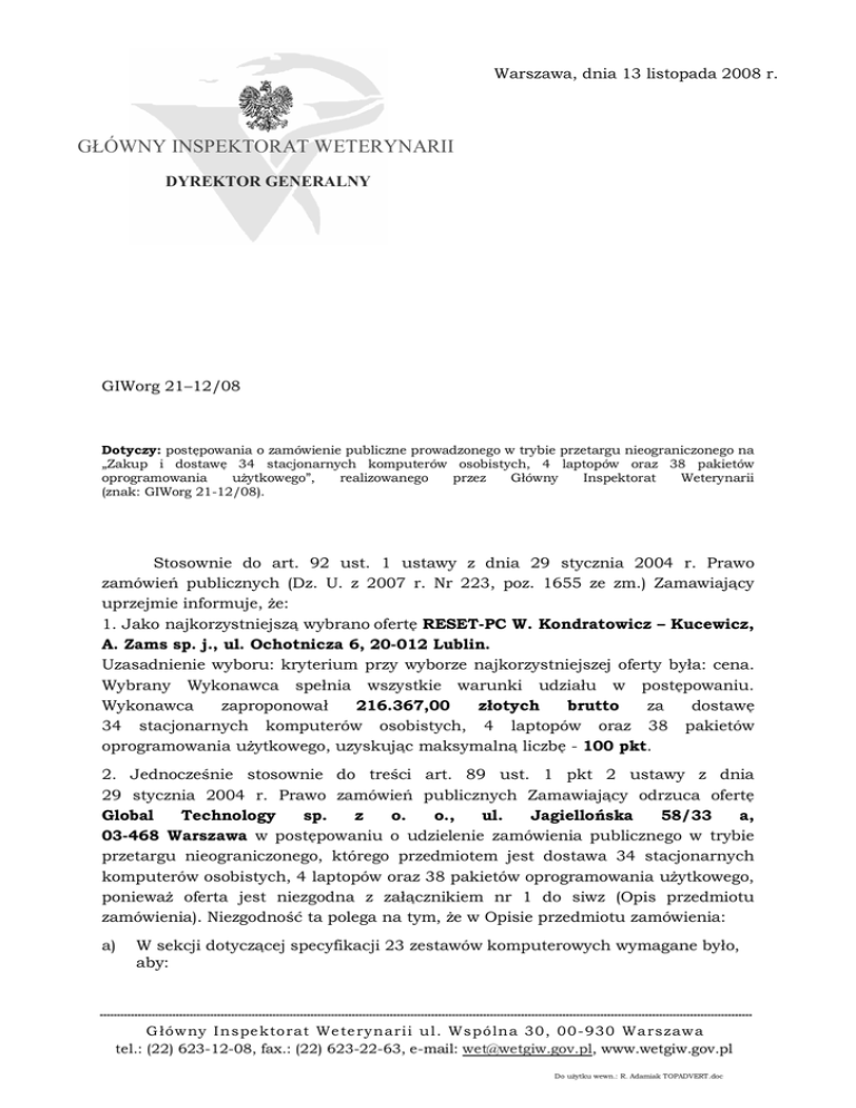 Warszawa, dnia 13 listopada 2008 r. GŁÓWNY INSPEKTORAT WETERYNARII DYREKTOR GENERALNY GIWorg 21–12/08 Dotyczy: postępowania o zamówienie publiczne prowadzonego w trybie przetargu nieograniczonego na „Zakup i dostawę 34 stacjonarnych komputerów osobistych, 4 laptopów oraz 38 pakietów oprogramowania uŜytkowego”, realizowanego przez Główny Inspektorat Weterynarii (znak: GIWorg 21-12/08). Stosownie do art. 92 ust. 1 ustawy z dnia 29 stycznia 2004 r. Prawo zamówień publicznych (Dz. U. z 2007 r. Nr 223, poz. 1655 ze zm.) Zamawiający uprzejmie informuje, Ŝe: 1. Jako najkorzystniejszą wybrano ofertę RESET-PC W. Kondratowicz – Kucewicz, A. Zams sp. j., ul. Ochotnicza 6, 20-012 Lublin. Uzasadnienie wyboru: kryterium przy wyborze najkorzystniejszej oferty była: cena. Wybrany Wykonawca spełnia wszystkie warunki udziału w postępowaniu. Wykonawca zaproponował 216.367,00 złotych brutto za dostawę 34 stacjonarnych komputerów osobistych, 4 laptopów oraz 38 pakietów oprogramowania uŜytkowego, uzyskując maksymalną liczbę - 100 pkt. 2. Jednocześnie stosownie do treści art. 89 ust. 1 pkt 2 ustawy z dnia 29 stycznia 2004 r. Prawo zamówień publicznych Zamawiający odrzuca ofertę Global Technology sp. z o. o., ul. Jagiellońska 58/33 a, 03-468 Warszawa w postępowaniu o udzielenie zamówienia publicznego w trybie przetargu nieograniczonego, którego przedmiotem jest dostawa 34 stacjonarnych komputerów osobistych, 4 laptopów oraz 38 pakietów oprogramowania uŜytkowego, poniewaŜ oferta jest niezgodna z załącznikiem nr 1 do siwz (Opis przedmiotu zamówienia). Niezgodność ta polega na tym, Ŝe w Opisie przedmiotu zamówienia: a) W sekcji dotyczącej specyfikacji 23 zestawów komputerowych wymagane było, aby: G łó w ny I n spe kto rat We te ry n ari i u l . Wspó ln a 30, 00- 930 Wa rszaw a tel.: (22) 623-12-08, fax.: (22) 623-22-63, e-mail: [email protected], www.wetgiw.gov.pl Do uŜytku wewn.: R. Adamiak TOPADVERT.doc • procesor posiadał cztery rdzenie oraz pamięć cache wielkości 6MB, - oferowany model to: Intel core 2 duo E7200. Według specyfikacji technicznej producenta procesora, model ten posiada 2 rdzenie oraz 3MB pamięci cache. Informacje dotyczące oferowanego modelu moŜna znaleźć bezpośrednio na stronie producenta procesora pod następującym linkiem: http://www.intel.com/products/processor/core2duo/index.htm • płyta główna była stacji roboczej, zaprojektowana i wykonana przez producenta - oferowana jest płyta główna MSI P35 NEO-F, której producentem jest firma MicroStar, natomiast producentem stacji roboczej jest Global Technology sp. z o. o. Informacje dotyczące oferowanego modelu moŜna znaleźć bezpośrednio na stronie producenta płyty głównej pod następującym linkiem: http://www.msipolska.pl/index.php?func=proddesc&prod_no=1215&maincat_no=1&cat2 _no=170 b) W sekcji dotyczącej specyfikacji 2 zestawów komputerowych wymagane było: • podanie linku do strony potwierdzającej zgodność jednostki centralnej zestawu z systemem RedHat Linux RHEL5, - w ofercie firmy Global Technology sp. z o. o. nie podano wymaganego linku. c) W sekcji dotyczącej specyfikacji 9 zestawów komputerowych wymagane było, aby: • procesor posiadał dwa rdzenie oraz pamięć cache wielkości 6MB, - oferowany model: Global Technology sp. z o.o. nie jest procesorem. • płyta główna była stacji roboczej, zaprojektowana i wykonana przez producenta - oferowana jest płyta główna MSI P35 NEO-F, której producentem jest firma MicroStar, natomiast producentem stacji roboczej jest Global Technology sp. z o.o. Informacje dotyczące oferowanego modelu moŜna znaleźć bezpośrednio na stronie producenta płyty głównej pod następującym linkiem: http://www.msipolska.pl/index.php?func=proddesc&prod_no=1215&maincat_no=1&cat2 _no=170 d) W sekcji dotyczącej specyfikacji 4 laptopów wymagane było, aby: • cięŜar laptopa wraz z baterią był mniejszy niŜ 2 kg (<2 kg), - w ofercie firmy Global Technology sp. z o. o., oferowany model waŜy więcej niŜ 2kg. W związku z tym ofertę firmy Global Technology sp. z o. o. naleŜało odrzucić. 3. Zamawiający nie wykluczył Ŝadnego z Wykonawców. 4. Poszczególne oferty przedstawiają się następująco: 1.) RESET-PC W. Kondratowicz – Kucewicz, A. Zams sp. j., ul. Ochotnicza 6, 20-012 Lublin. - firma zaproponowała za dostawę 34 stacjonarnych komputerów osobistych, 4 laptopów oraz 38 pakietów oprogramowania uŜytkowego cenę brutto 216.367,00 zł. Wykonawca uzyskał liczbę - 100 pkt. 2.) Global 03-468 Technology Warszawa – sp. firma z o. o., zaproponowała ul. za Jagiellońska dostawę 34 58/33 a, stacjonarnych komputerów osobistych, 4 laptopów oraz 38 pakietów oprogramowania uŜytkowego cenę brutto 192.618,48 zł. Oferta nie została oceniona ze względu na jej odrzucenie. 3.) TOPADVERT Agnieszka Czaplicka - WoroŜyńska, ul. Smolna 13, piętro II, 00-683 Warszawa - firma zaproponowała za dostawę 34 stacjonarnych komputerów osobistych, 4 laptopów oraz 38 pakietów oprogramowania uŜytkowego cenę brutto 248.810,46 zł. Wykonawca uzyskał liczbę - 87 pkt.