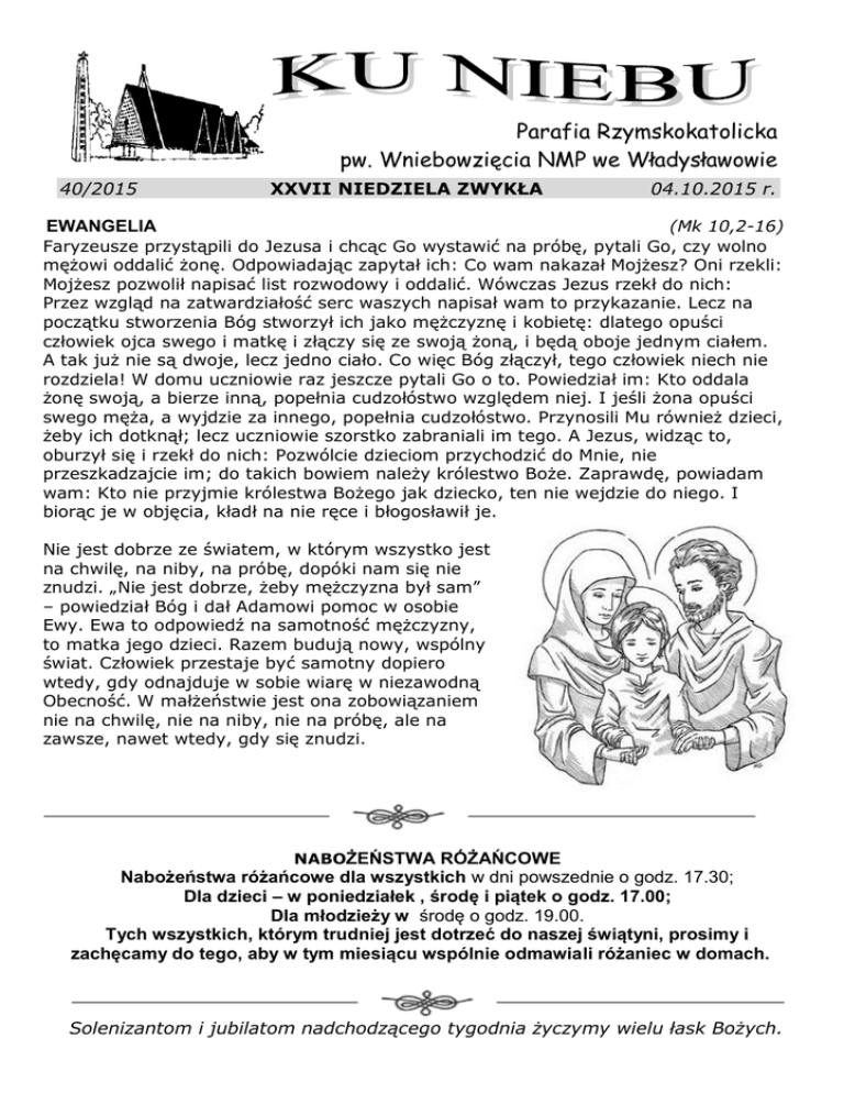 Parafia Rzymskokatolicka pw. Wniebowzięcia NMP we Władysławowie 40/2015 XXVII NIEDZIELA ZWYKŁA 04.10.2015 r. EWANGELIA (Mk 10,2-16) Faryzeusze przystąpili do Jezusa i chcąc Go wystawić na próbę, pytali Go, czy wolno mężowi oddalić żonę. Odpowiadając zapytał ich: Co wam nakazał Mojżesz? Oni rzekli: Mojżesz pozwolił napisać list rozwodowy i oddalić. Wówczas Jezus rzekł do nich: Przez wzgląd na zatwardziałość serc waszych napisał wam to przykazanie. Lecz na początku stworzenia Bóg stworzył ich jako mężczyznę i kobietę: dlatego opuści człowiek ojca swego i matkę i złączy się ze swoją żoną, i będą oboje jednym ciałem. A tak już nie są dwoje, lecz jedno ciało. Co więc Bóg złączył, tego człowiek niech nie rozdziela! W domu uczniowie raz jeszcze pytali Go o to. Powiedział im: Kto oddala żonę swoją, a bierze inną, popełnia cudzołóstwo względem niej. I jeśli żona opuści swego męża, a wyjdzie za innego, popełnia cudzołóstwo. Przynosili Mu również dzieci, żeby ich dotknął; lecz uczniowie szorstko zabraniali im tego. A Jezus, widząc to, oburzył się i rzekł do nich: Pozwólcie dzieciom przychodzić do Mnie, nie przeszkadzajcie im; do takich bowiem należy królestwo Boże. Zaprawdę, powiadam wam: Kto nie przyjmie królestwa Bożego jak dziecko, ten nie wejdzie do niego. I biorąc je w objęcia, kładł na nie ręce i błogosławił je. Nie jest dobrze ze światem, w którym wszystko jest na chwilę, na niby, na próbę, dopóki nam się nie znudzi. „Nie jest dobrze, żeby mężczyzna był sam” – powiedział Bóg i dał Adamowi pomoc w osobie Ewy. Ewa to odpowiedź na samotność mężczyzny, to matka jego dzieci. Razem budują nowy, wspólny świat. Człowiek przestaje być samotny dopiero wtedy, gdy odnajduje w sobie wiarę w niezawodną Obecność. W małżeństwie jest ona zobowiązaniem nie na chwilę, nie na niby, nie na próbę, ale na zawsze, nawet wtedy, gdy się znudzi. NABOŻEŃSTWA RÓŻAŃCOWE Nabożeństwa różańcowe dla wszystkich w dni powszednie o godz. 17.30; Dla dzieci – w poniedziałek , środę i piątek o godz. 17.00; Dla młodzieży w środę o godz. 19.00. Tych wszystkich, którym trudniej jest dotrzeć do naszej świątyni, prosimy i zachęcamy do tego, aby w tym miesiącu wspólnie odmawiali różaniec w domach. Solenizantom i jubilatom nadchodzącego tygodnia życzymy wielu łask Bożych. PAPIESKI FESTYN RODZIINNY U MATKI BOŻEJ WNIEBOWZIĘTEJ 4.10.2015, godz. 14:00-18:30 PROGRAM 14.00 – Modlitwa w intencjach Parafii Powitanie gości i prezentacje Schola młodzieżowa 14.15 – Występ Dziecięcej Grupy Tanecznej 14.45 – Połączone siły: Młodzieżowy Parafialny Zespół Caritas oraz Wiara i Światło 15.00 – Rozstrzygnięcie konkursów wiedzy o Janie Pawle II oraz konkursów artystycznych 15.30 – Program artystyczny Młodzieży z Zespołu Szkół nr 1 im. Jana Pawła II 16.00 – Ogłoszenie wyników biegu papieskiego 16.15 – Występ Miejsko –Parafialnej Orkiestry z Władysławowa 17.00 – Koncert zespołu „MEDIUM” 18.00 – Losowanie nagród głównych w loterii fantowej 18.30 – Zakończenie festynu ŻYCZYMY DOBREJ ZABAWY XII BIEG PAPIESKI o MEMORIAŁ ŚW. JANA PAWŁA II Tegoroczny Półmaraton o Memoriał św. Jana Pawła II będzie miał miejsce 4 października. Zbiórka wszystkich uczestników Biegu na placu przy kościele we Władysławowie o godz. 12.00, skąd nastąpi wyjazd do Jastarni lub bezpośrednio na miejscu przy Gimnazjum im. Jana Pawła II w Jastarni. godz. 13.00 – uroczyste otwarcie Biegu na placu przy Gim. im. JP II w Jastarni godz. 13.30 – start Biegu Głównego. 14.00- start zawodników na wózkach BIEG RODZINNY o MEMORIAŁ ŚW. JANA PAWŁA II w Alejach gwiazd rozpocznie się o godz. 16.30. Zapisy przy pomniku Abrahama od godz. 16.00. (ok. 500 metrów) Na bieg zapraszamy całe rodziny, jeśli to niemożliwe to zachęcamy aby wystawić przynajmniej przedstawicieli rodzin. BEZPŁATNE BADANIE ZNAMION SKÓRY W GMINIE WŁADYSŁAWOWO W niedzielę (4 października) w godz. 12:0019:00 przy kościele w ramach Papieskiego Festynu Rodzinnego, każdy zainteresowany będzie mógł przeprowadzić bezpłatne badania. Lekarze-specjaliści wezmą pod lupę wszelkiego rodzaju znamiona skórne. Pieprzyki, plamki, czerwone punkciki, włókniaki. Znamiona mamy wszyscy. Większość z nich to niewinne zmiany, jednak niektóre mogą rozwinąć się w groźną chorobę – raka skóry! Możemy się przed tym ustrzec, badając znamiona u specjalisty dermatologa. Wiele osób nowo powstałe pieprzyki tłumaczy długotrwałym przebywaniem na słońcu. Nie każda zmiana skórna jest jednak zwykłym pieprzykiem. Niektóre nieprawidłowości skórne z wiekiem mogą się również zezłośliwić, stąd też bardzo ważna jest ich kontrola. KALENDARIUM TYGODNIA 05.10 (poniedziałek)-św. Faustyny Kowalskiej 07.10 (środa)- NMP Różańcowej 09.10 (piątek)- bł. Wincentego Kadłubka DIAKONIA WIELBIENIA W każdy czwartek o godz. 19.00 w domu parafialnym odbywa się próba scholii wielbiącej Boga podczas Mszy św. wielbienia. ( w najbliższym tygodniu spotkanie wyjątkowo w środę)Wszystkich umiejących grać i śpiewać zapraszamy na próbę. Spotkania w domu parafialnym REKOLEKCJE NA ZAKOŃCZENIE SEZONU Zakończył się „sezon wakacyjny” w naszym mieście. Od dnia 11 do 13 października pragniemy młodzieży i dorosłym zaproponować rekolekcje które wygłosi ks. Andrzej Trojanowski - egzorcysta. Nauki podczas wszystkich Mszy św. w niedziele oraz w poniedziałek i wtorek o godz. 9.00 i 18.00. Po mszach św. wieczornych modlitwa uwielbienia i uwolnienia. SPOTKANIE Z RODZICAMI KNDYDATÓW DO BIERZMOWANIA Spotkanie dla rodziców kandydatów do Bierzmowania z kl. II i III gimnazjum będzie miało miejsce 11 października po Mszy św. o godz. 9.30 CHÓR PARAFIALNY Chór parafialny rozpoczął swoje próby. Wszystkich chętnych zarówno mężczyzn jak i kobiety do śpie